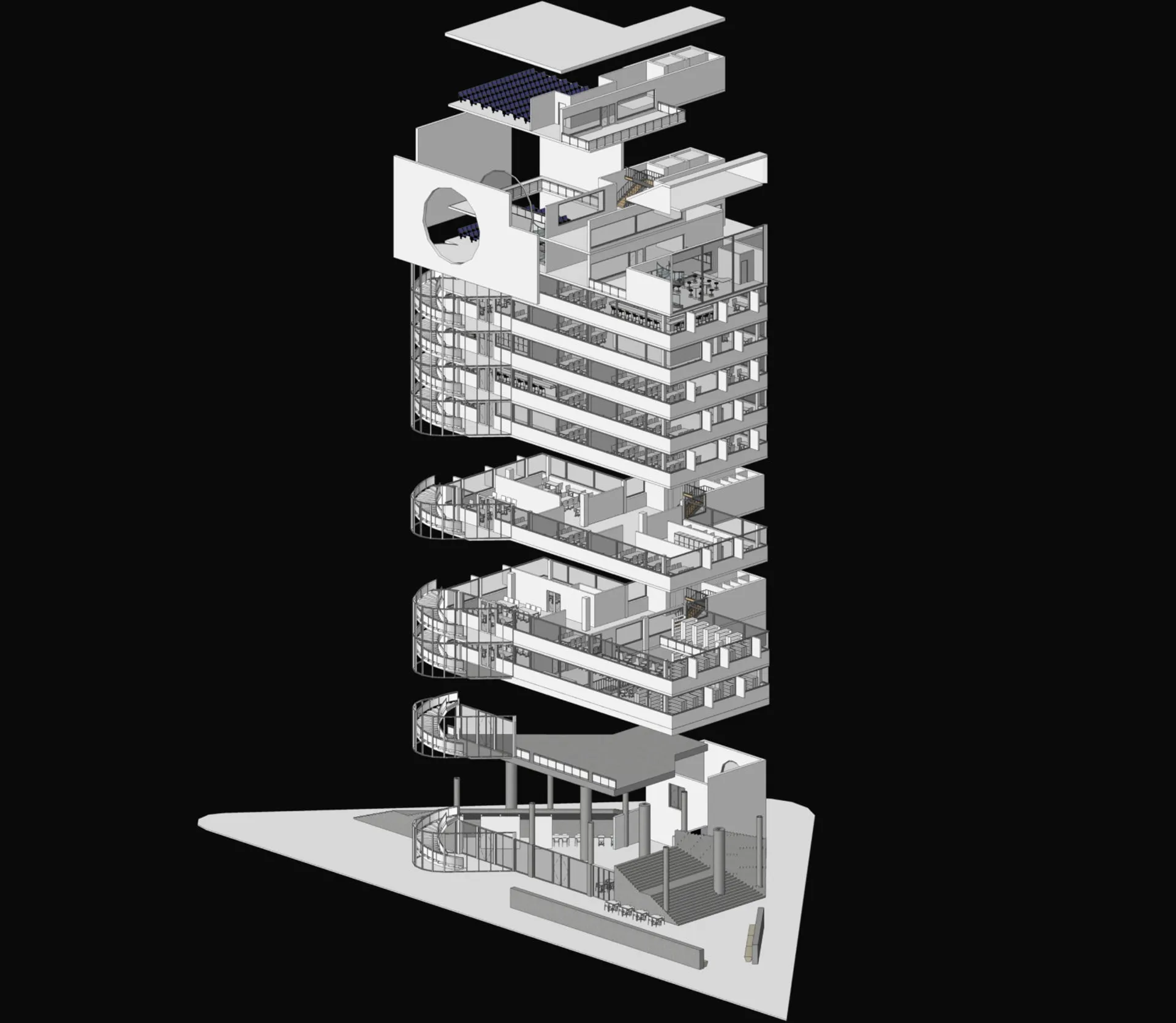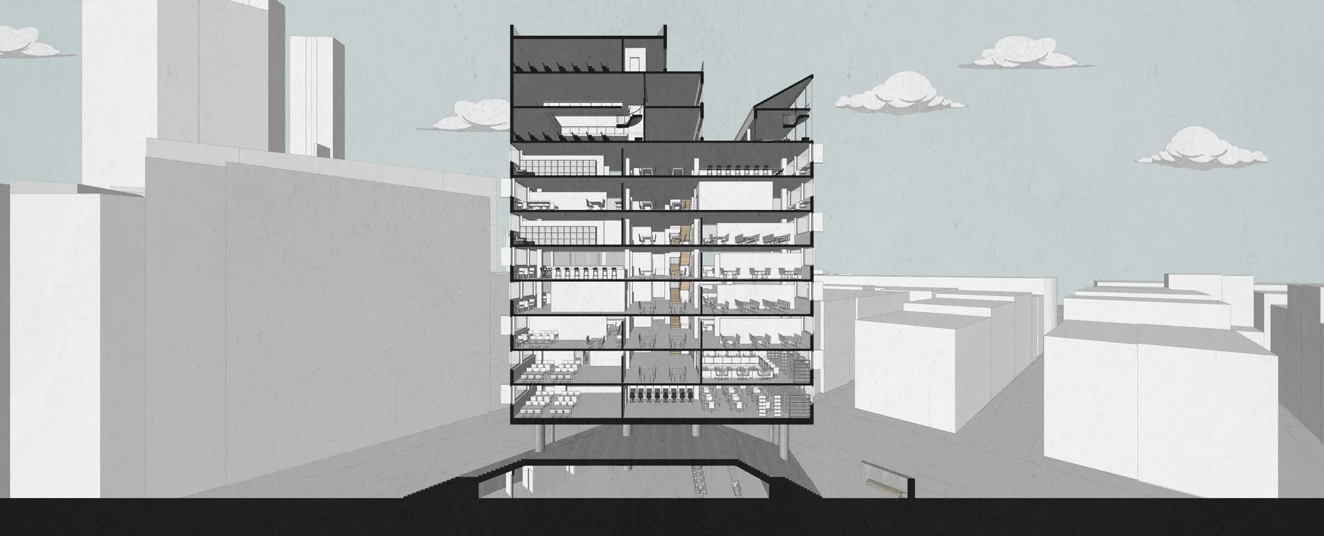 This year in studio 3.6 has focused heavily on a renovation project. We have decided to create a creative educational programme for our building. It is an existing car park which is based in Shoreditch, in the shadow of London which used to be rich in art and culture but has slowly been pushed out due to gentrification. I wanted to design a building to encourage local communities to bring back that culture, hence my building’s function will be an architectural school with plenty of public areas to give back to the local communities. My design proposal will consider heavily based around the existing structure and keep as much as possible to encourage the aspect of sustainability and any changes and additions will be carefully designed as I wish to accommodate any future changes to the function of the building. This means the primary structure will remain for any future redevelopment.