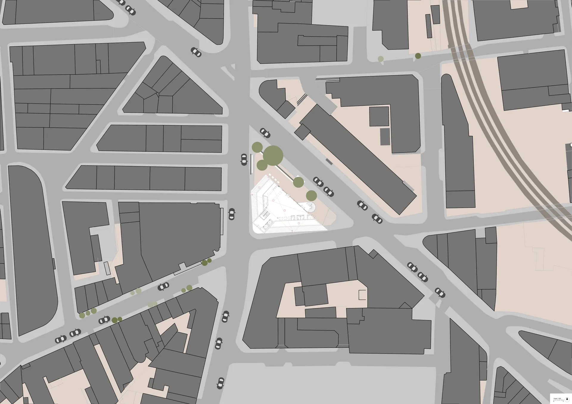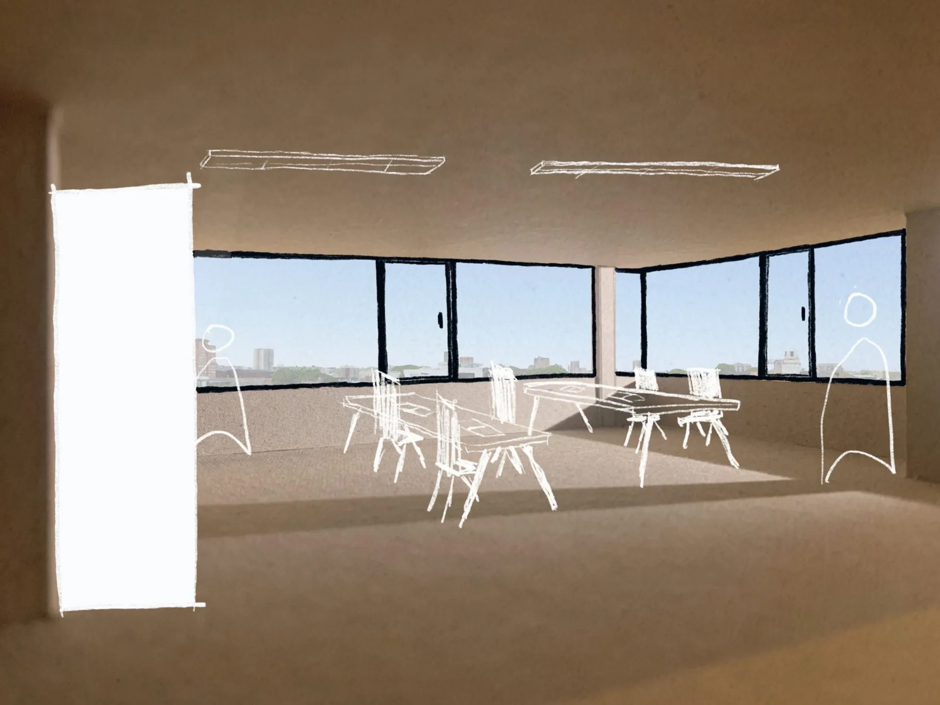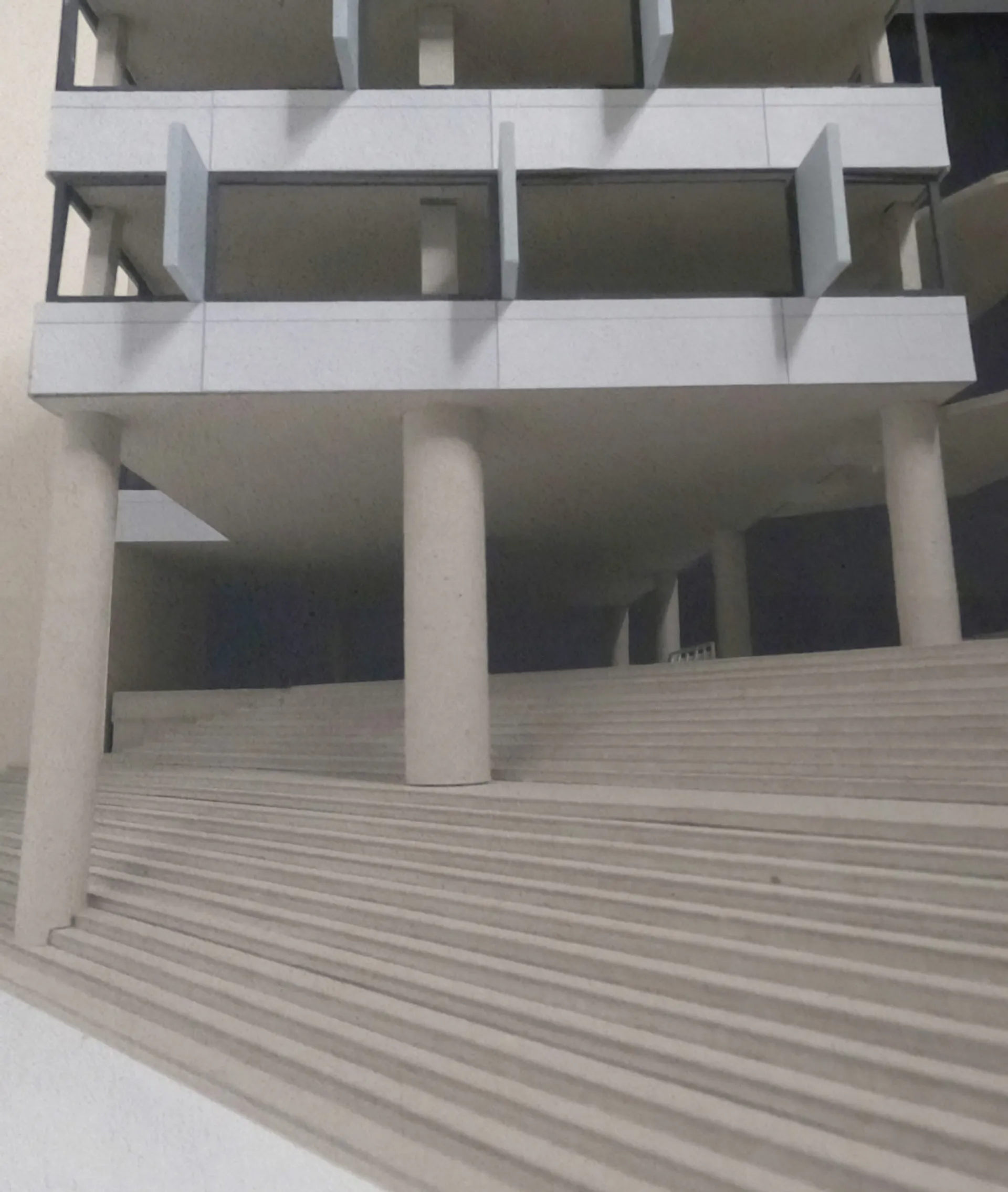 The size of the existing building is very generous and so is the front outdoor space. In my design, I wanted to maintain spacious areas for public access and front entrances that encourage people to either walk through it or use it as a meetup point and share the space with students.