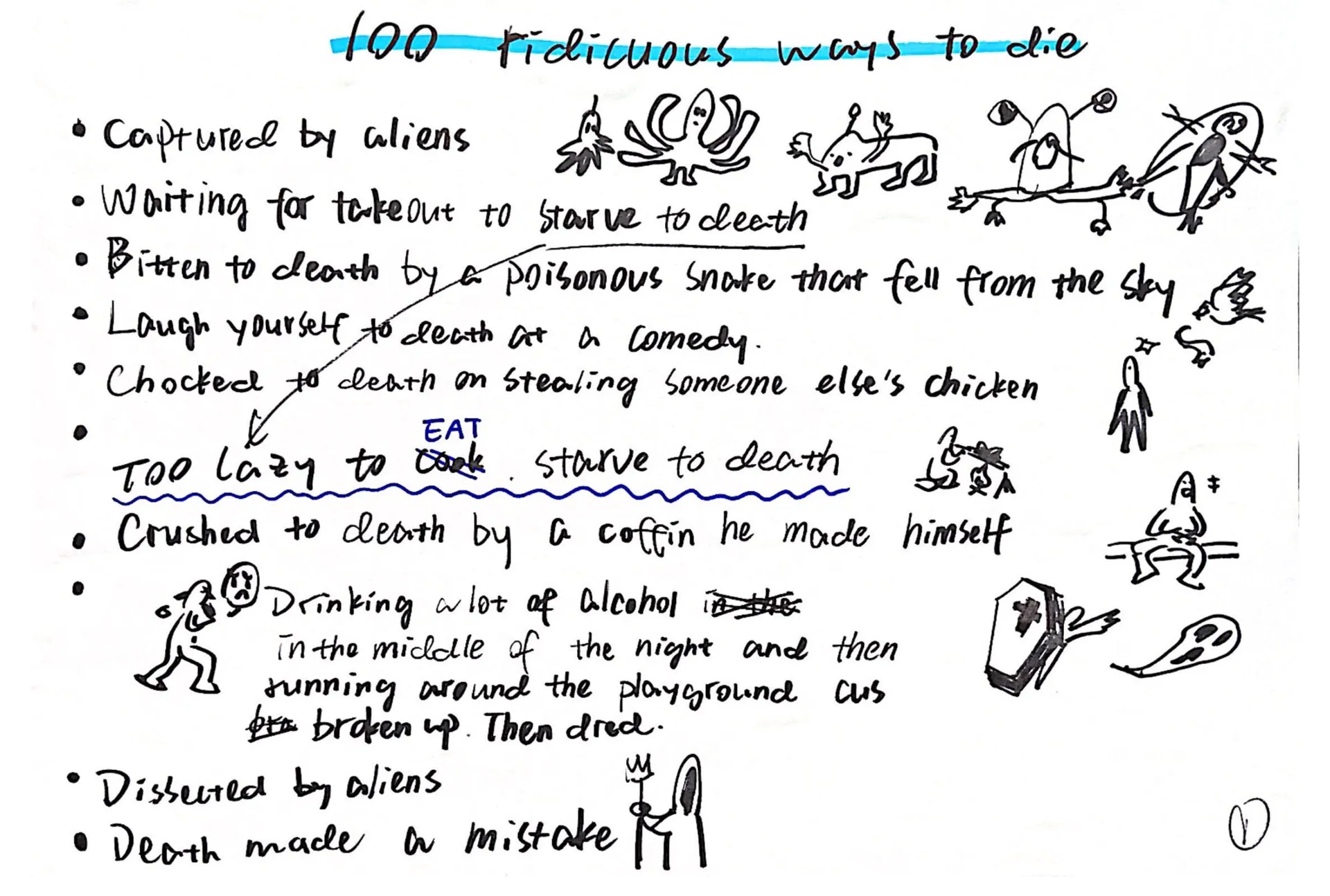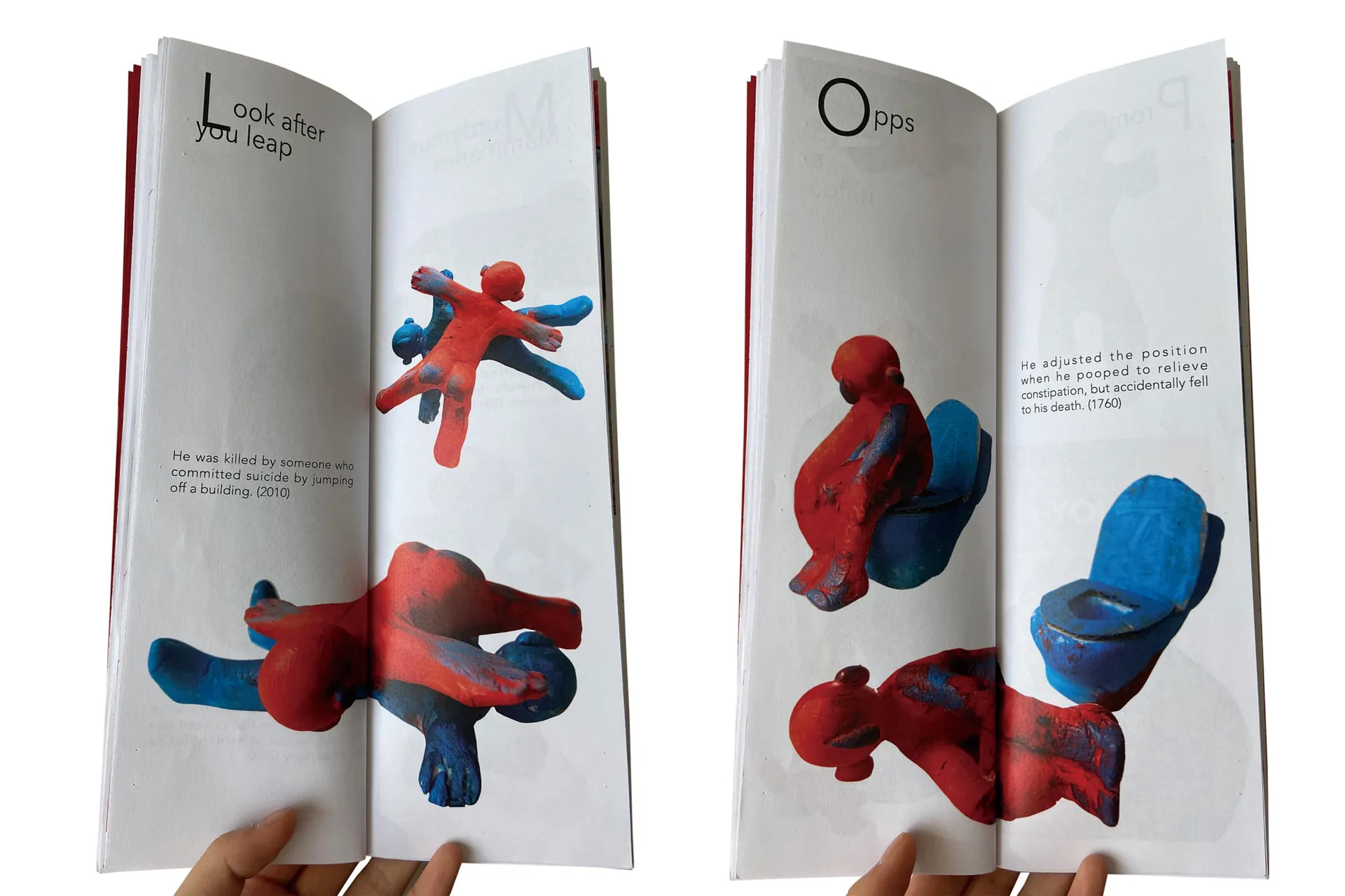 My theme is black humor, which is a lighthearted approach to serious topics in life. It can also be said to be a coping mechanism when people face pain. I collected 26 real and absurd ways to die, and made each of these stories out of clay into a lighthearted book. When you face some helpless and painful reality, it is better to face it with a smile instead of crying.