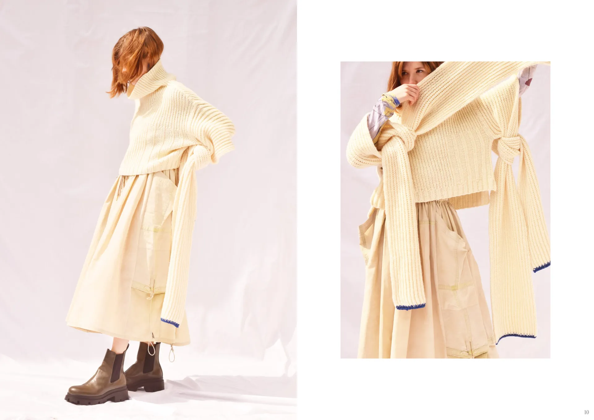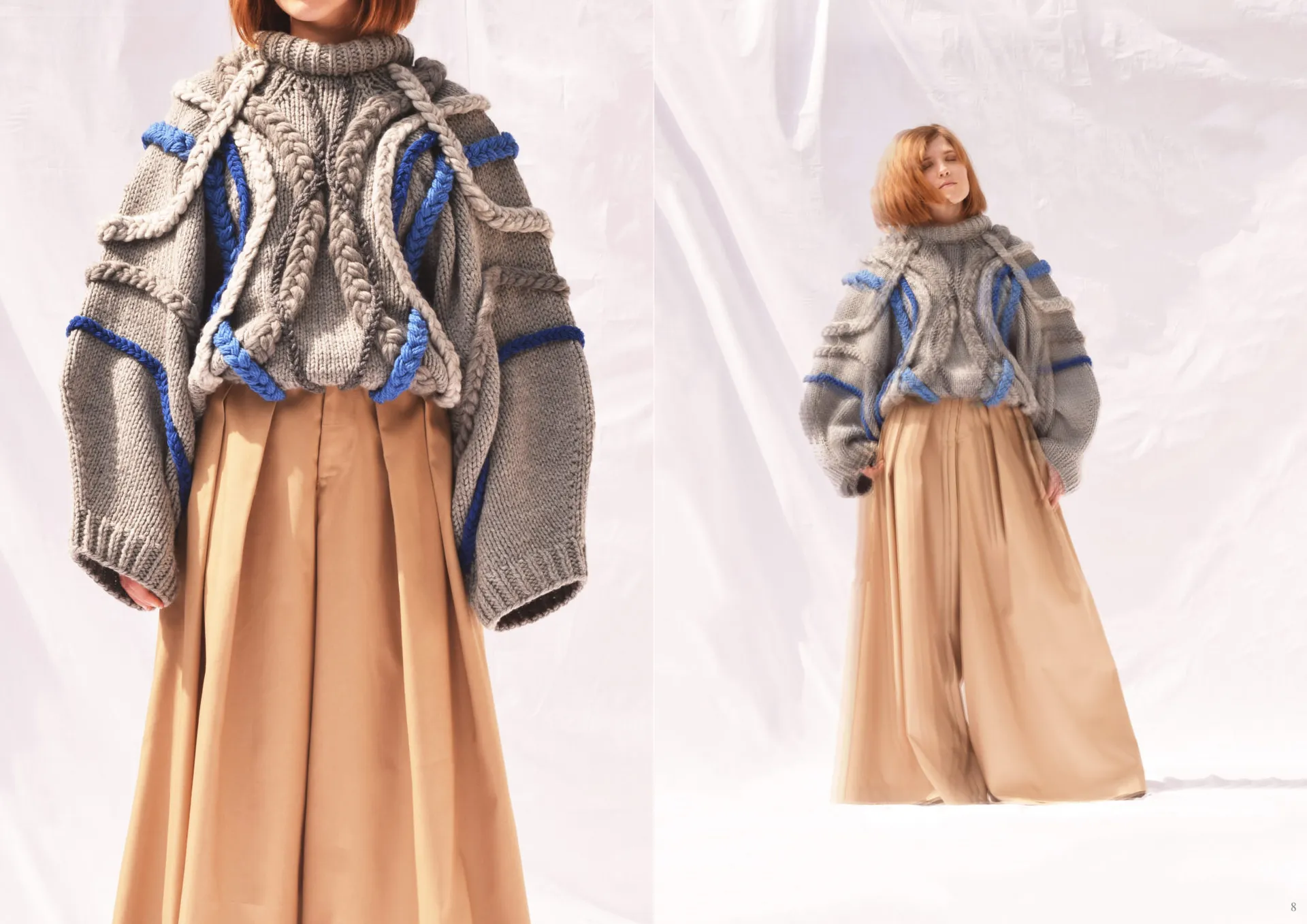 To explore three-dimensional textural elements, I developed a range of hand painted digital surface prints, soft needle felting, alongside linear mixed ribs and ergonomic plaited cable designs. By celebrating these textile techniques within my fashion pieces, creates a greater depth, tying the entire range together with an artistic thread.