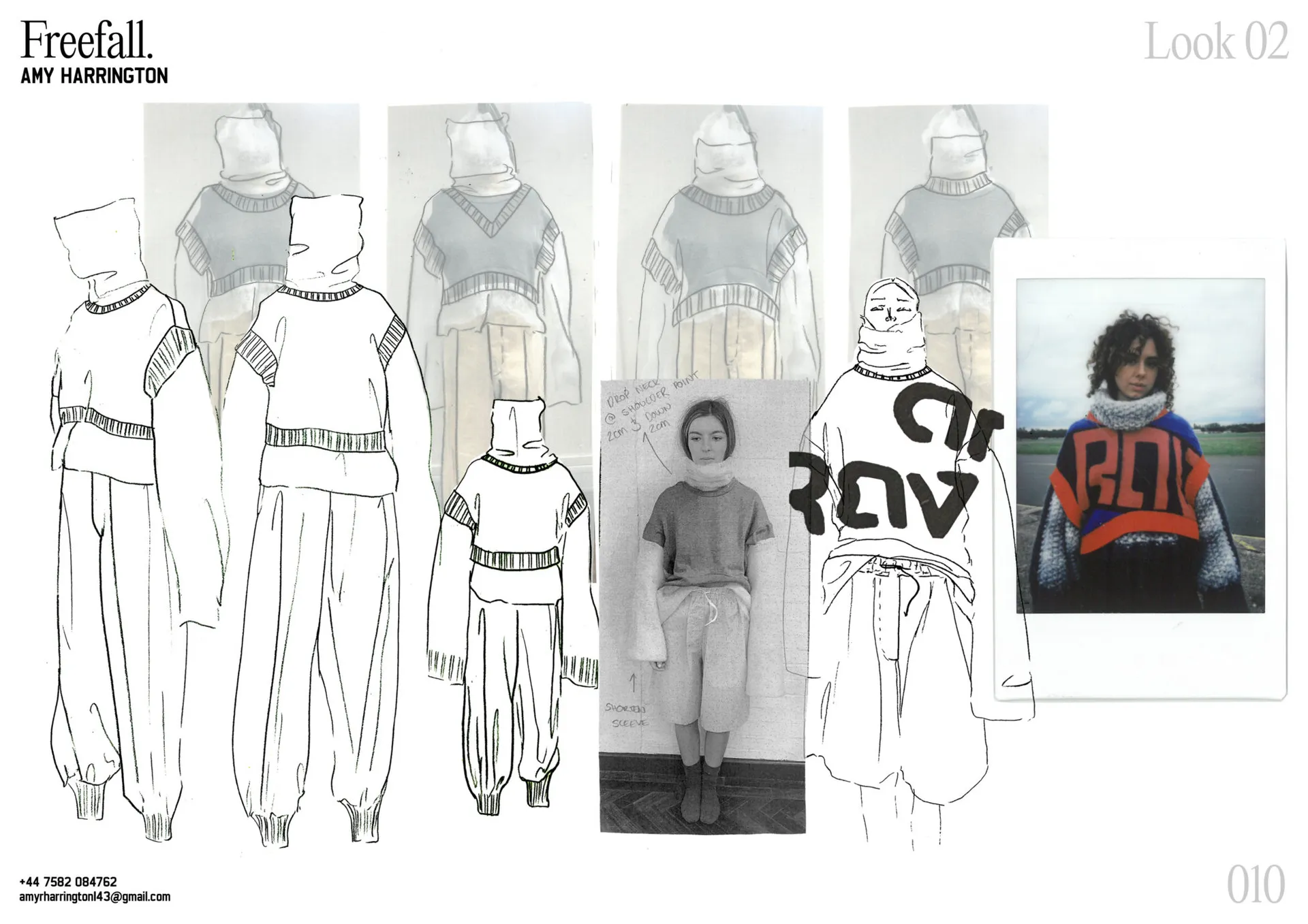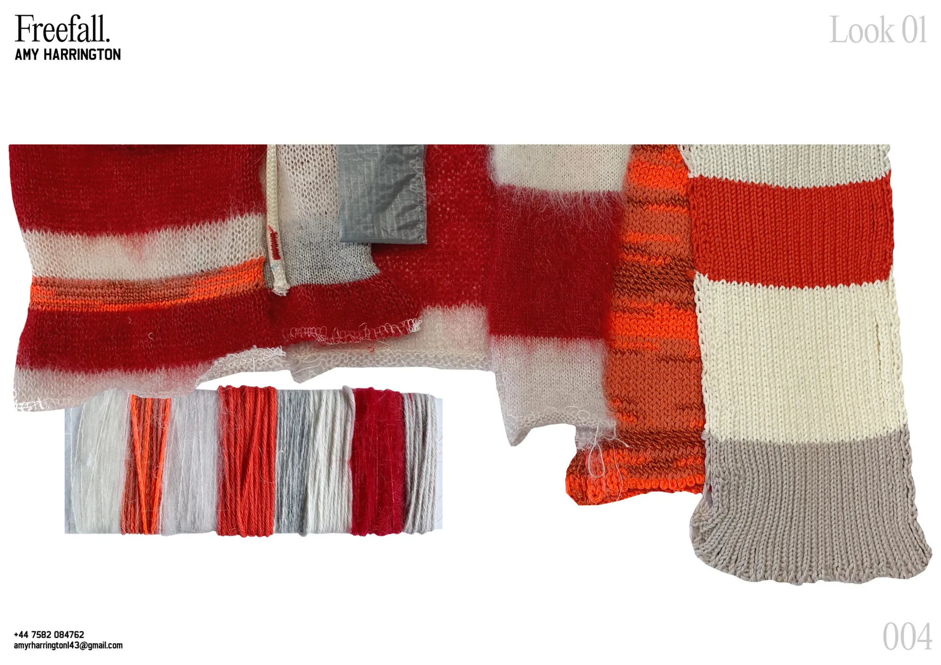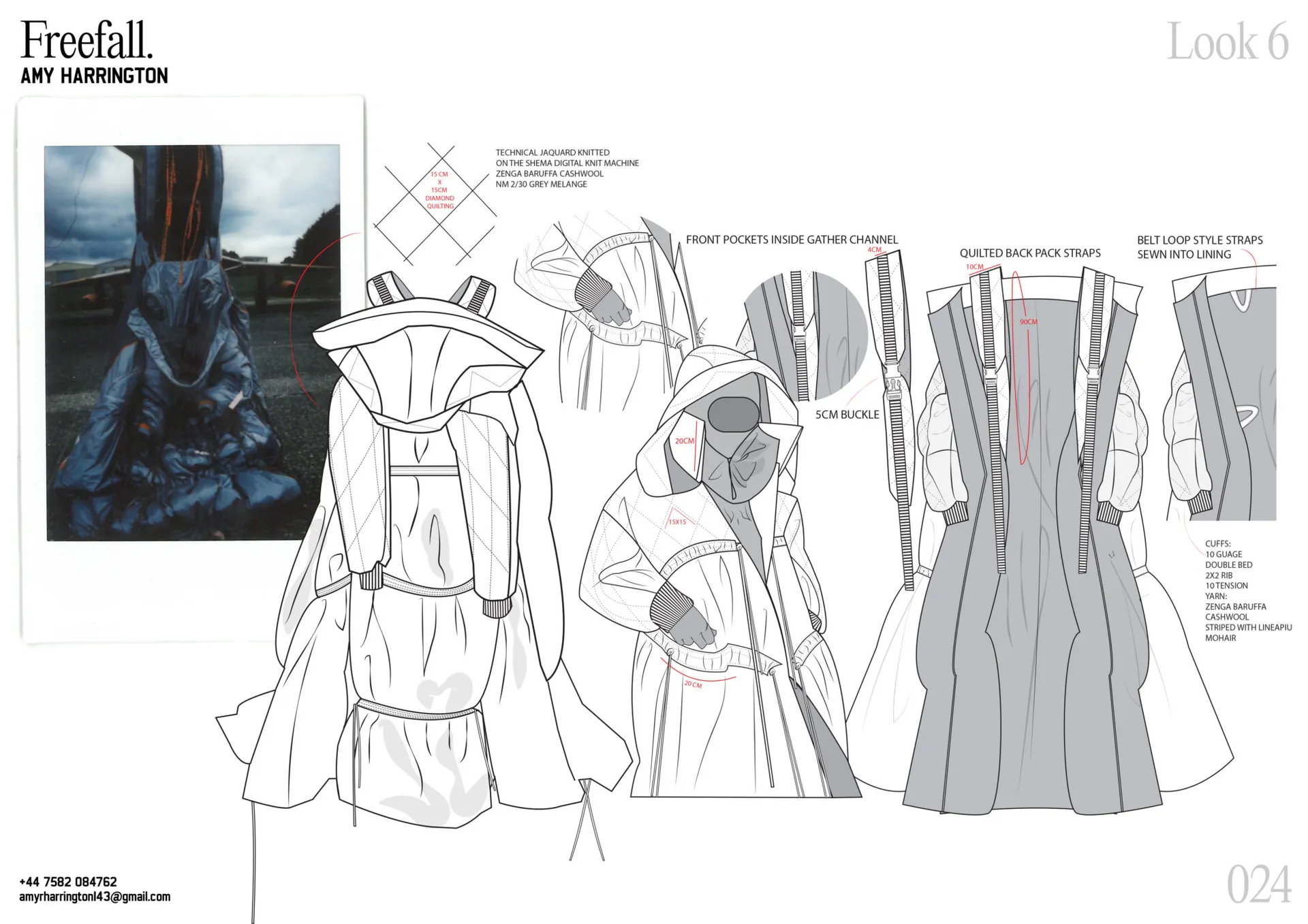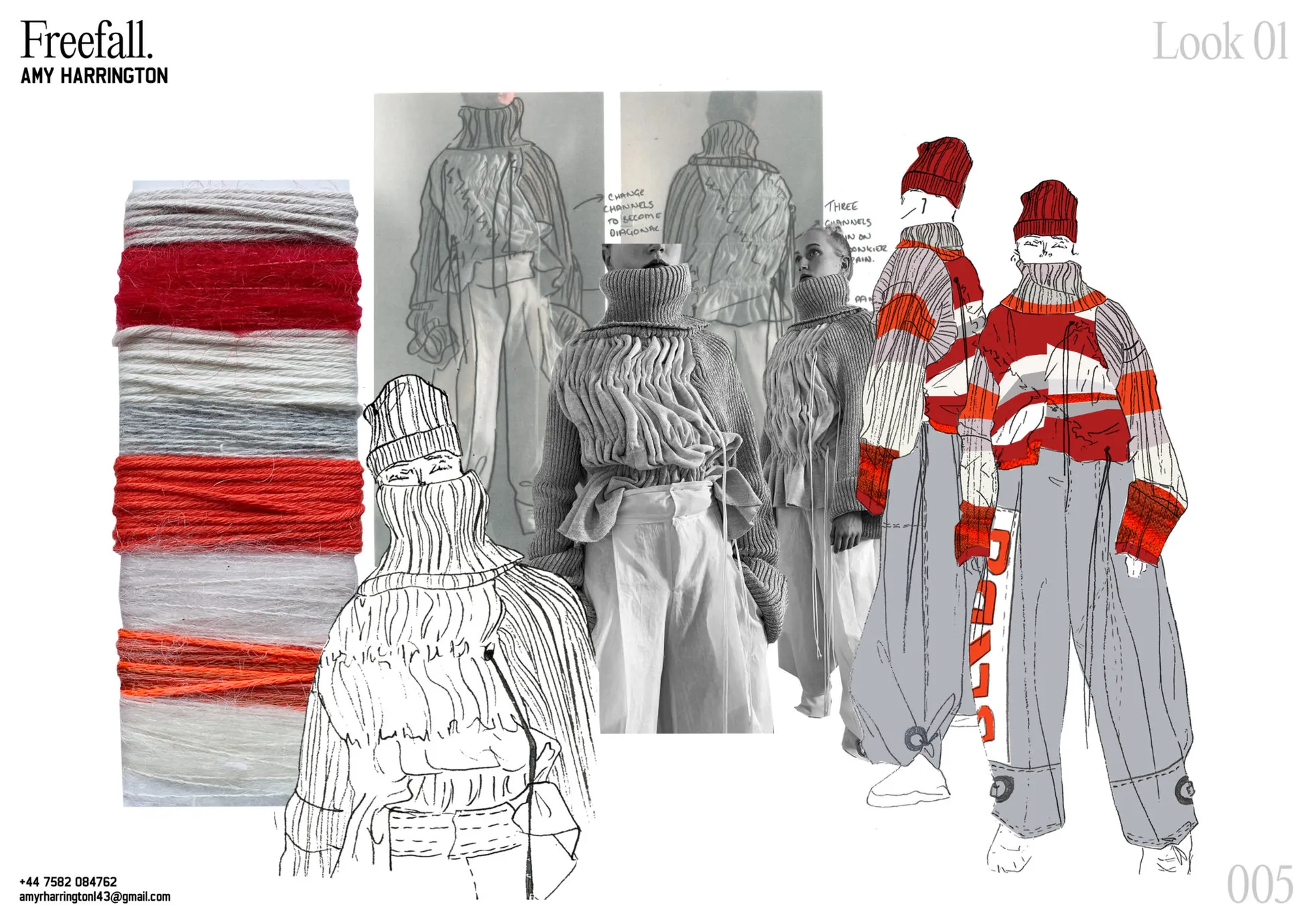 Freefall in an autumn/ winter collection which explores how repurposed materials can create a contemporary graduate collection. Parachutes have a 25-year usage period once this period is up the parachutes are disposed of and technical fabric is wasted. This collection combines the realms of sportswear and knit whilst incorporating technical fabrics mostly brought from deadstock fabric suppliers. This collection gained yarn sponsorships from Sesia, Toscano, Lineapiú and Zenga Baruffa allowing beautiful and modern knitwear to be at the forefront of each look. Freefall plays on the layering of contrasting textured fabrics creating an interesting and colourful fabric story from mohair to glossy technical each look is unique whilst referencing the sport of skydiving throughout.