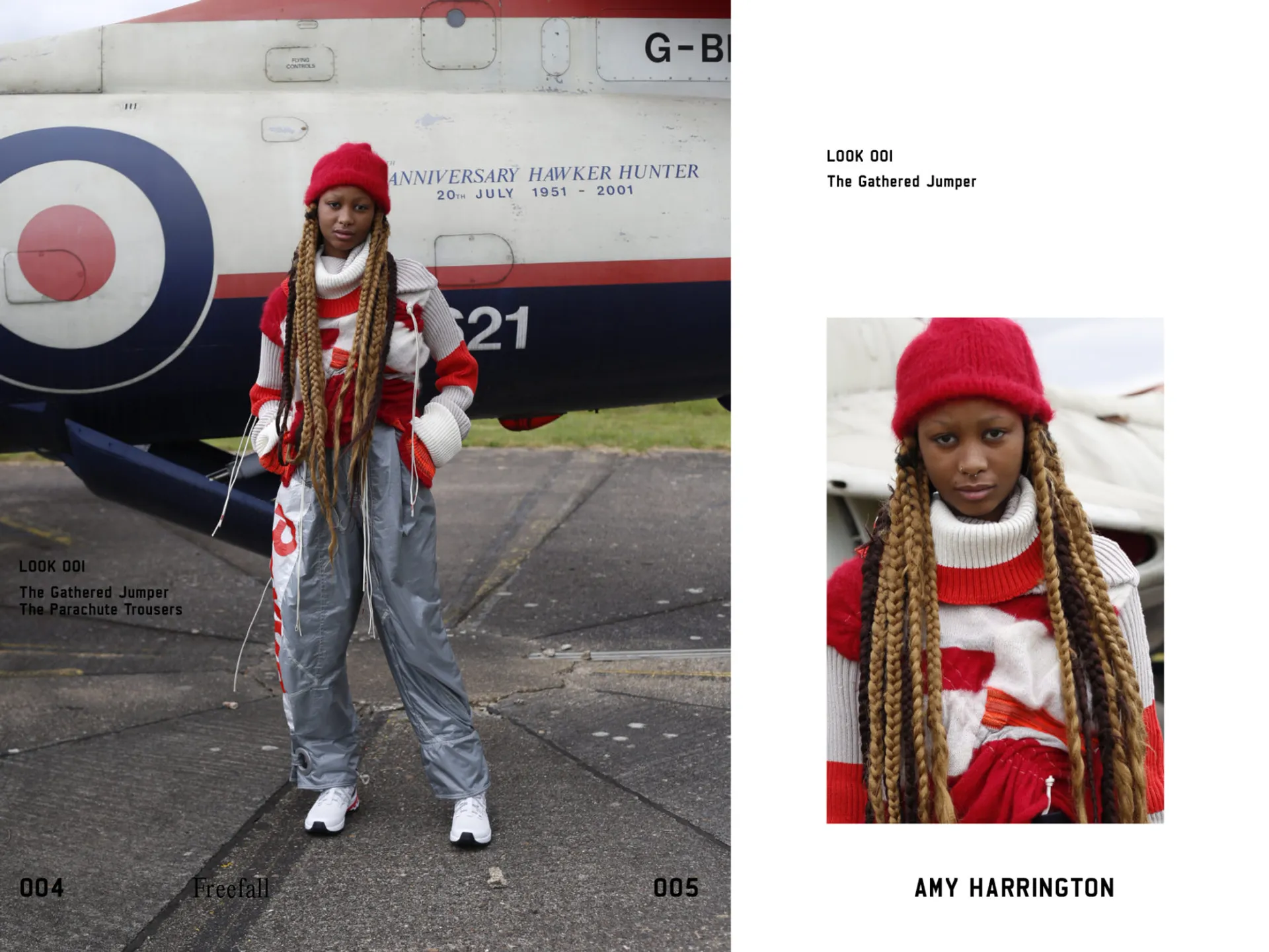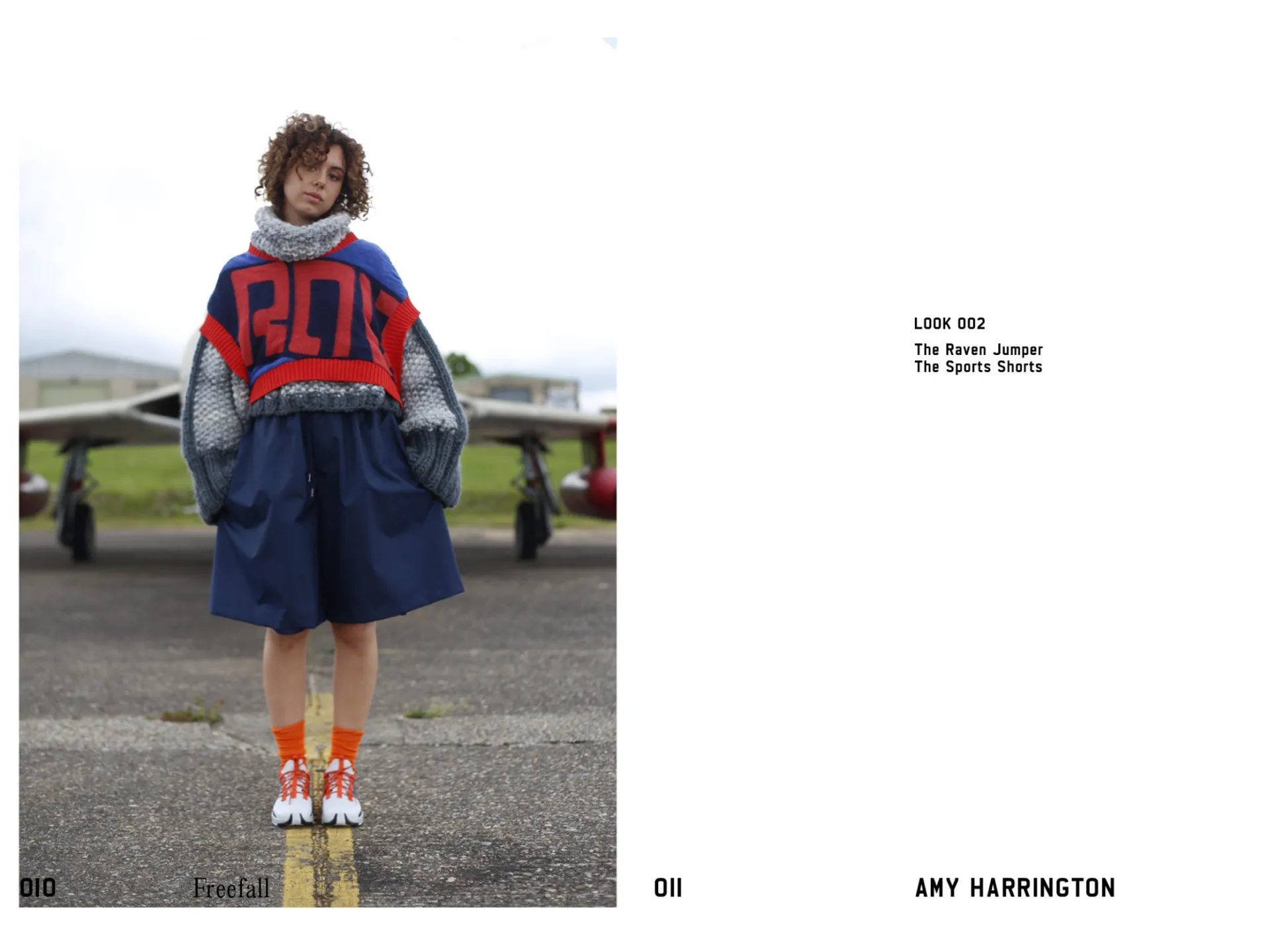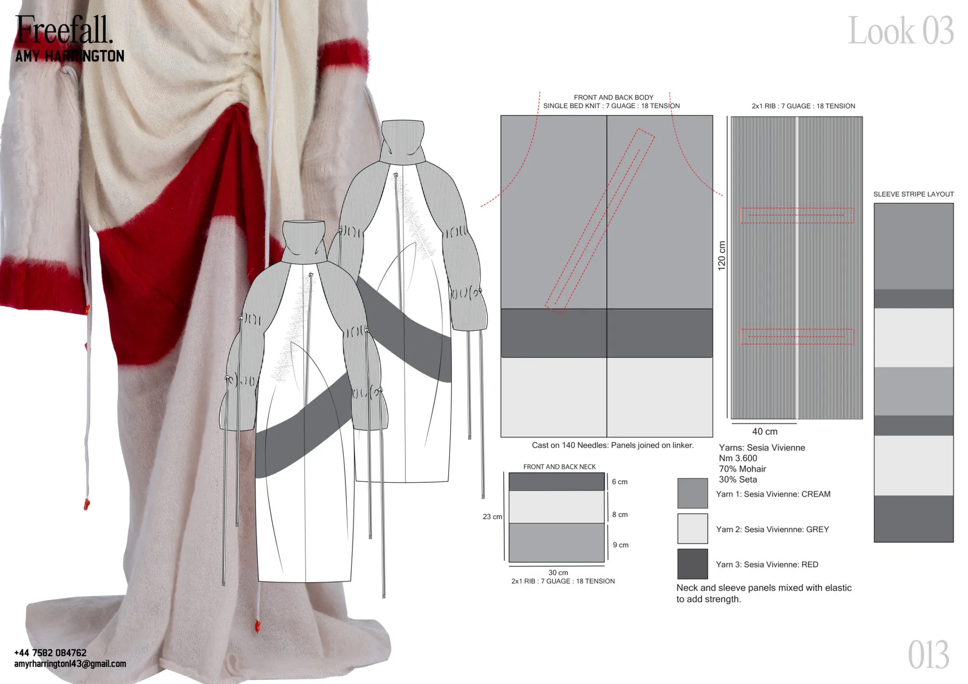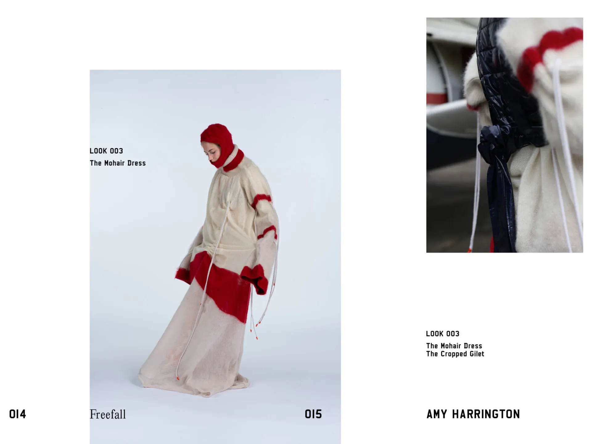 Freefall in an autumn/ winter collection which explores how repurposed materials can create a contemporary graduate collection. Parachutes have a 25-year usage period once this period is up the parachutes are disposed of and technical fabric is wasted. This collection combines the realms of sportswear and knit whilst incorporating technical fabrics mostly brought from deadstock fabric suppliers. This collection gained yarn sponsorships from Sesia, Toscano, Lineapiú and Zenga Baruffa allowing beautiful and modern knitwear to be at the forefront of each look. Freefall plays on the layering of contrasting textured fabrics creating an interesting and colourful fabric story from mohair to glossy technical each look is unique whilst referencing the sport of skydiving throughout.