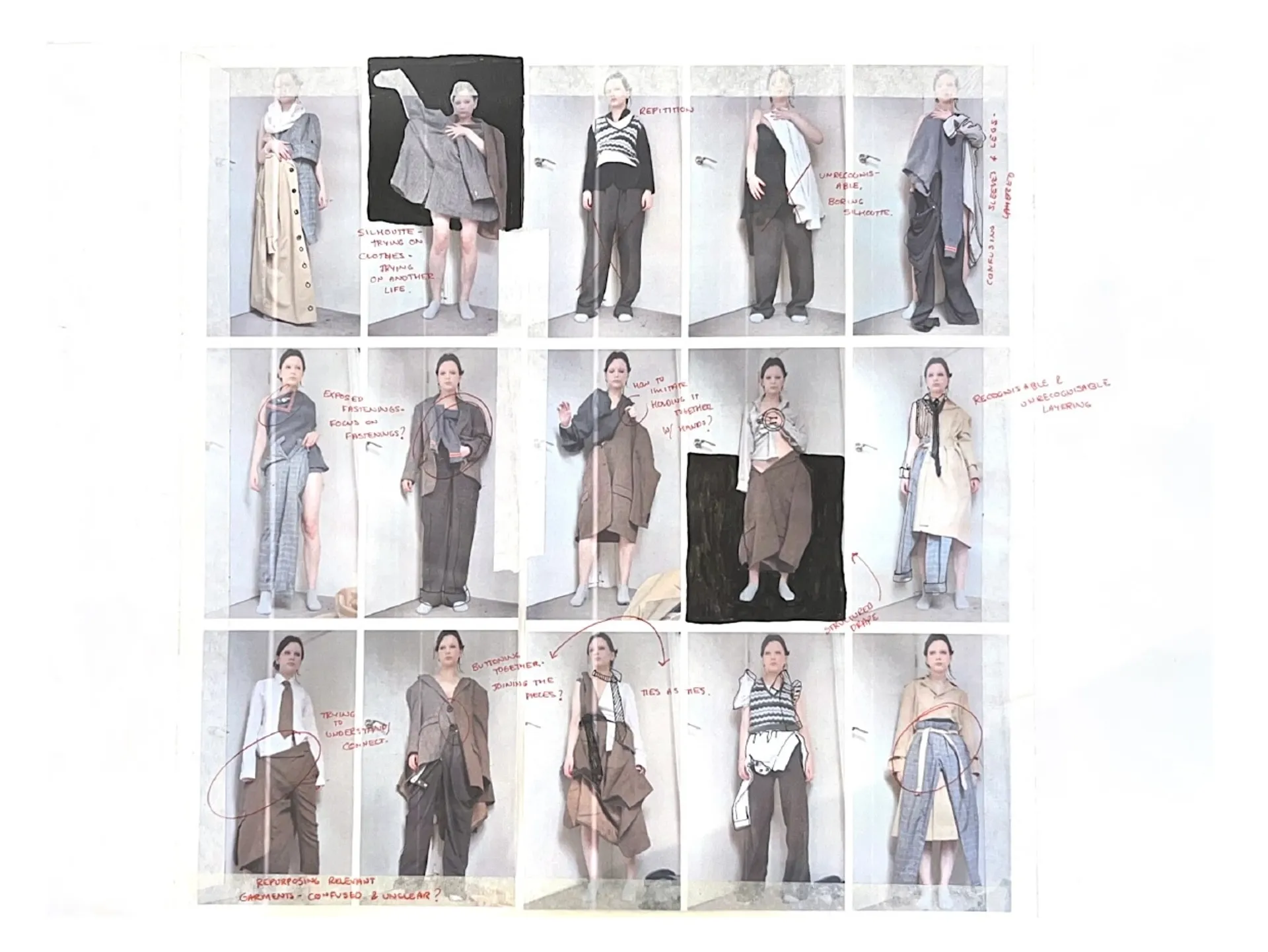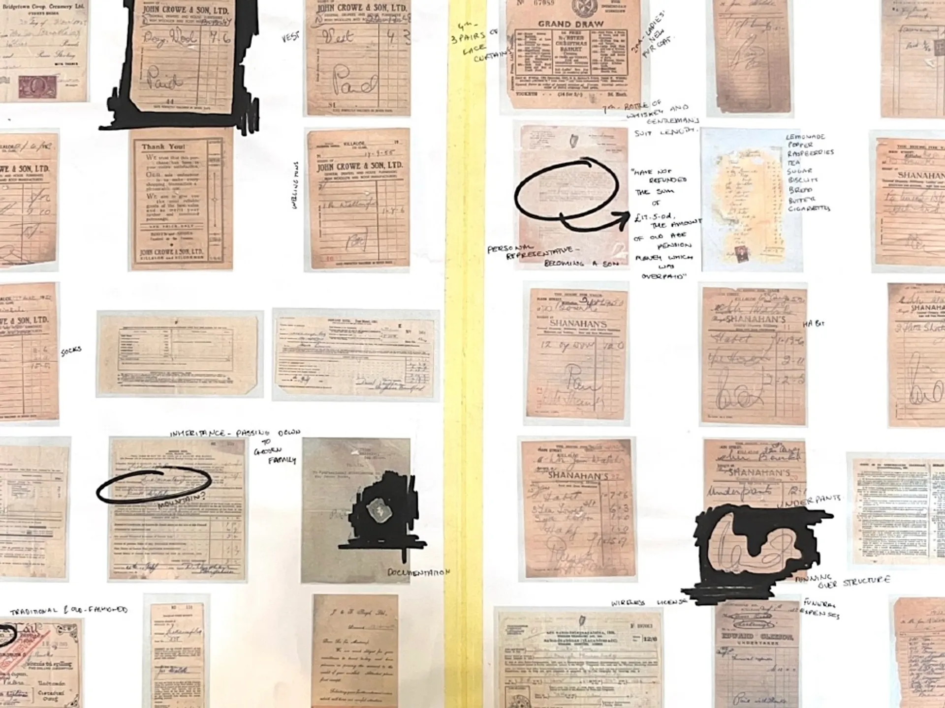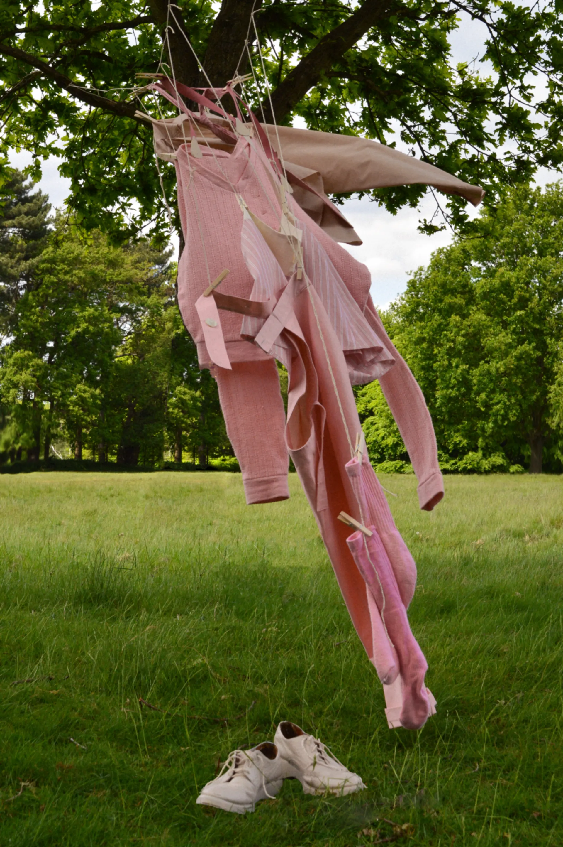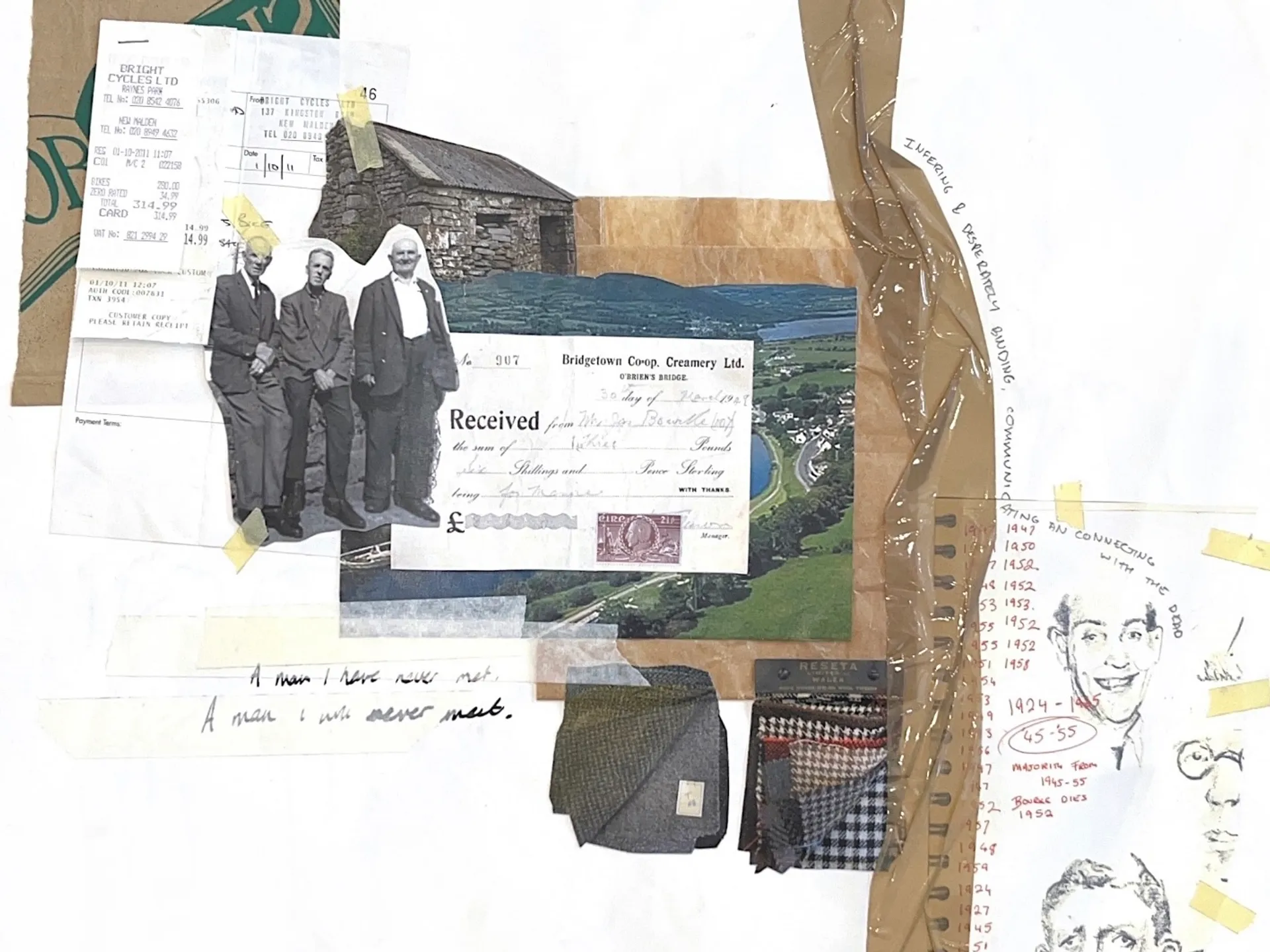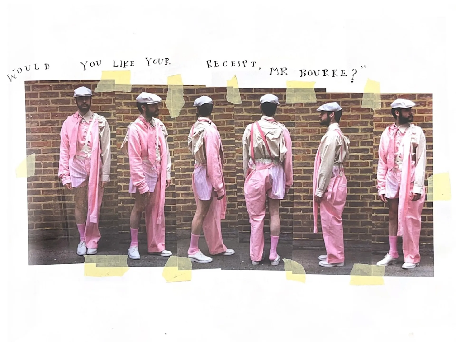 My project is based off an archive of receipts dating from the 1940s to 1950s, all belonging to one man in Killaloe, County Clare, Ireland, named Jim Bourke. Receipts have always interested me, as they seem to represent so much, act as tokens of human activity, when they are so often discarded and forgotten. Through looking more deeply at the receipt archive, and doing more contextual research, I found myself beginning to feel a connection to Jim Bourke, trying to understand him in my mind and join together a sense of his character. My garments sensitively celebrate Mr Bourke, and by taking relevant garment references and deconstructing them, piecing them back together and dipping them all in pink dye, a man appears before us, from his receipts.