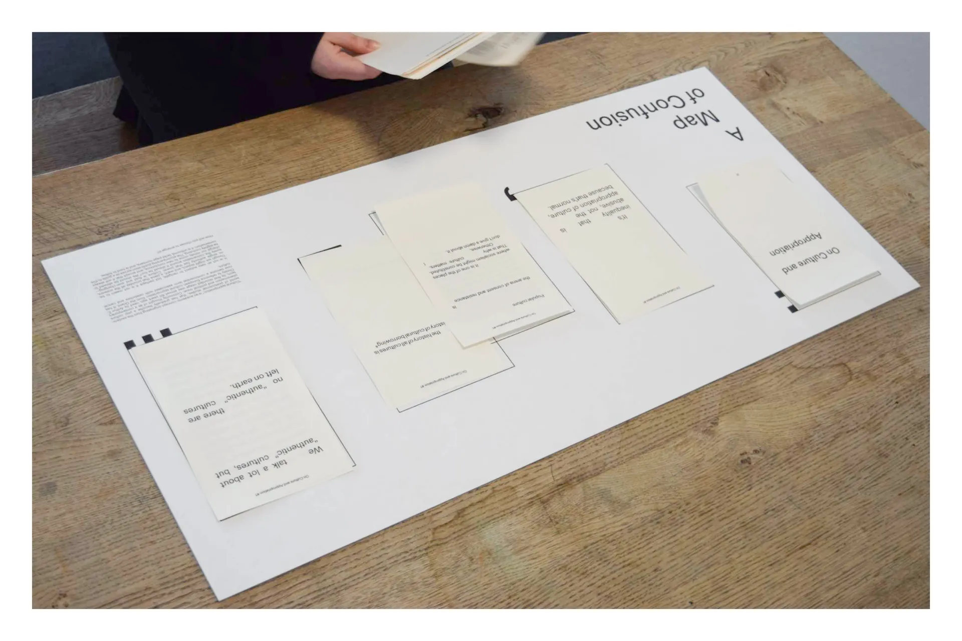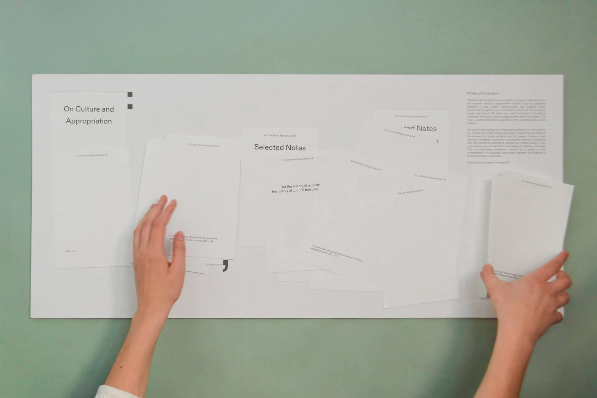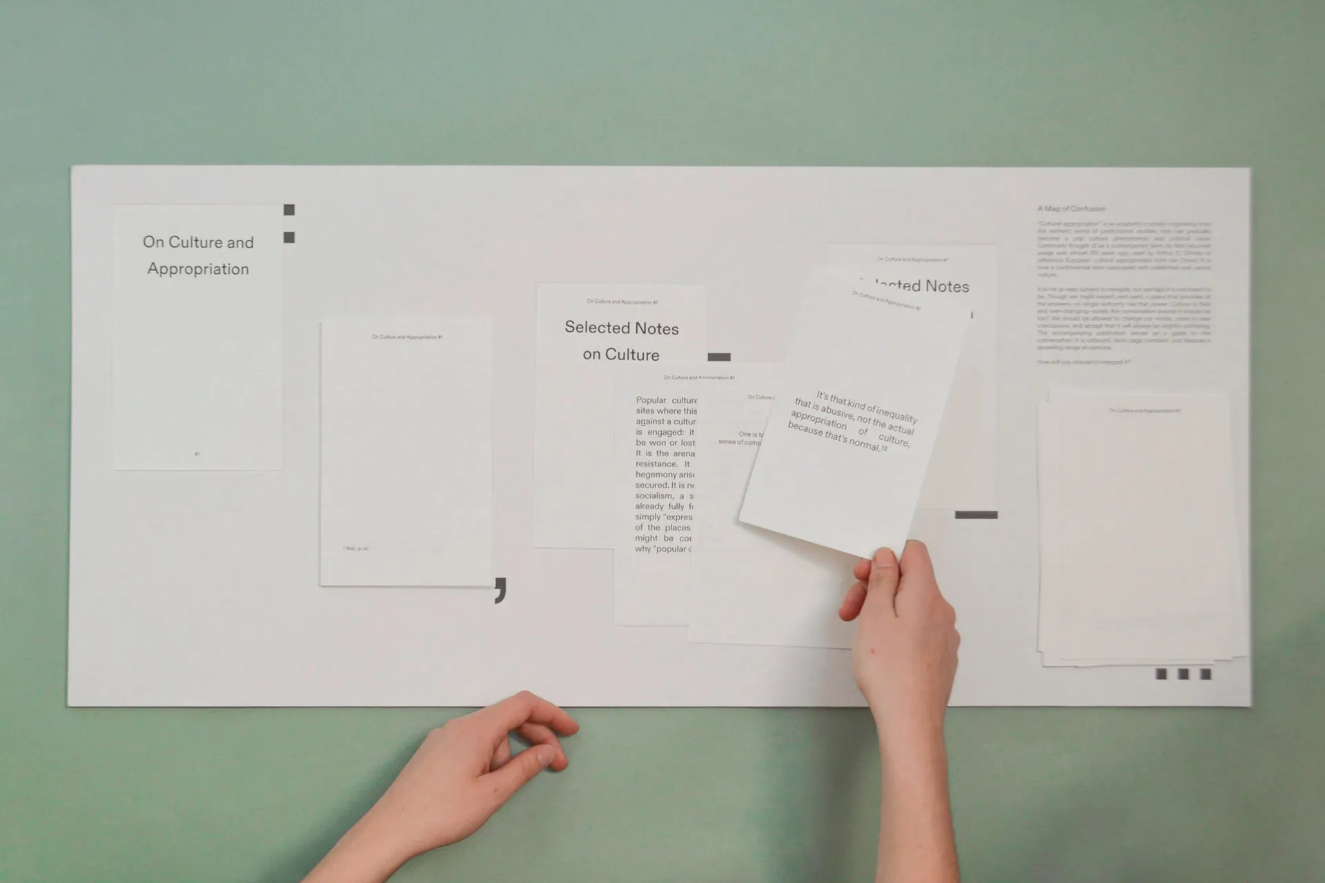 We have been conditioned to see cultural appropriation as inherently bad, but is this the reality? Appropriation is everywhere: it exists in the food we eat, the clothes we wear, the words we speak. It is not an easy subject to navigate, but perhaps it is not meant to be. Though we might expect, and want, a place that provides all the answers, no single authority has that power. Culture is fluid, ever-changing, and up to interpretation—the discussion around cultural appropriation should be too. This publication is designed to convey that: it is unbound, lacks page numbers, and features a range of opinions. It is accompanied by a purpose-built surface where the viewer can get to grips with the subject matter by organising their thoughts, recategorising information as they wish, and finding comfort in their confusion.