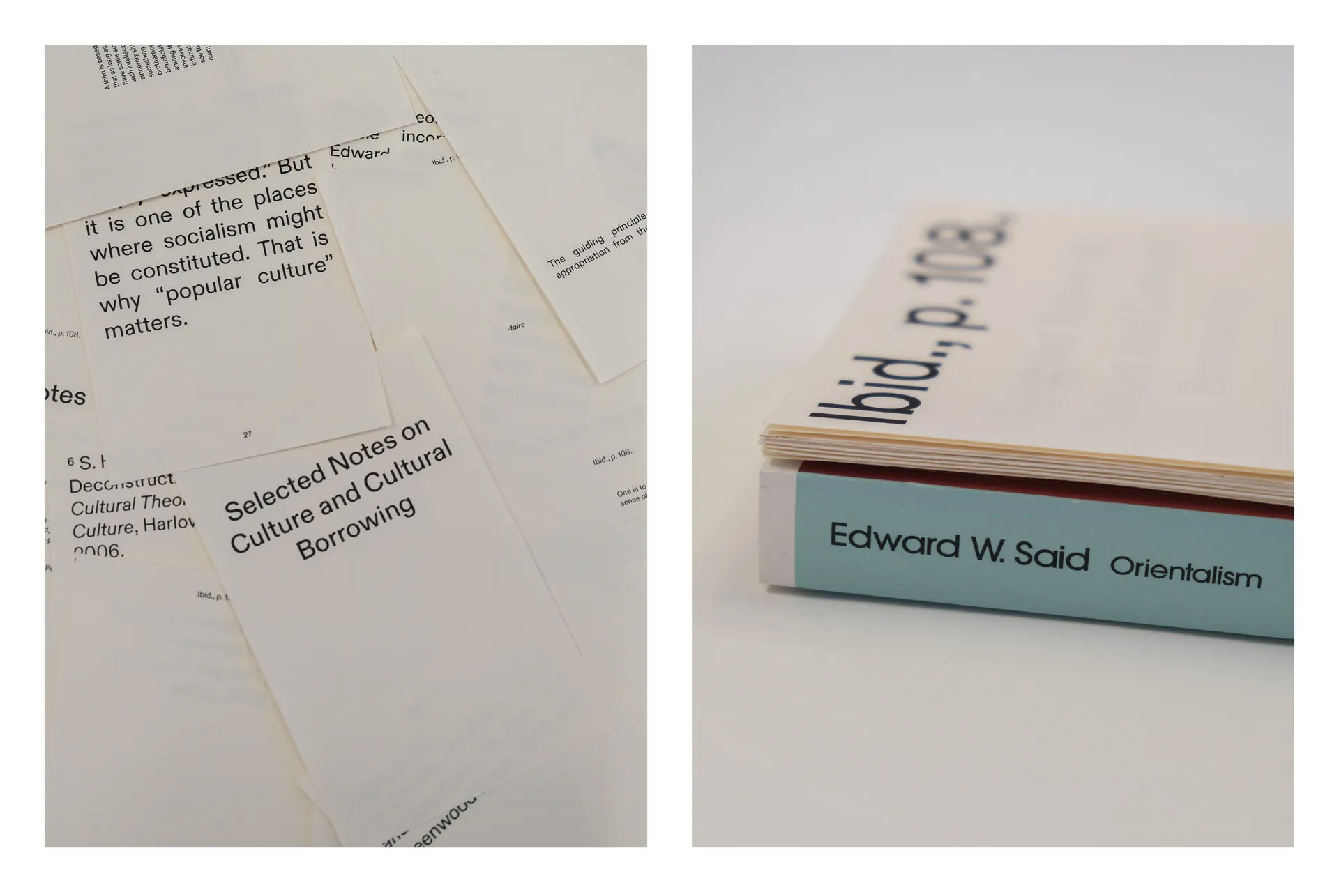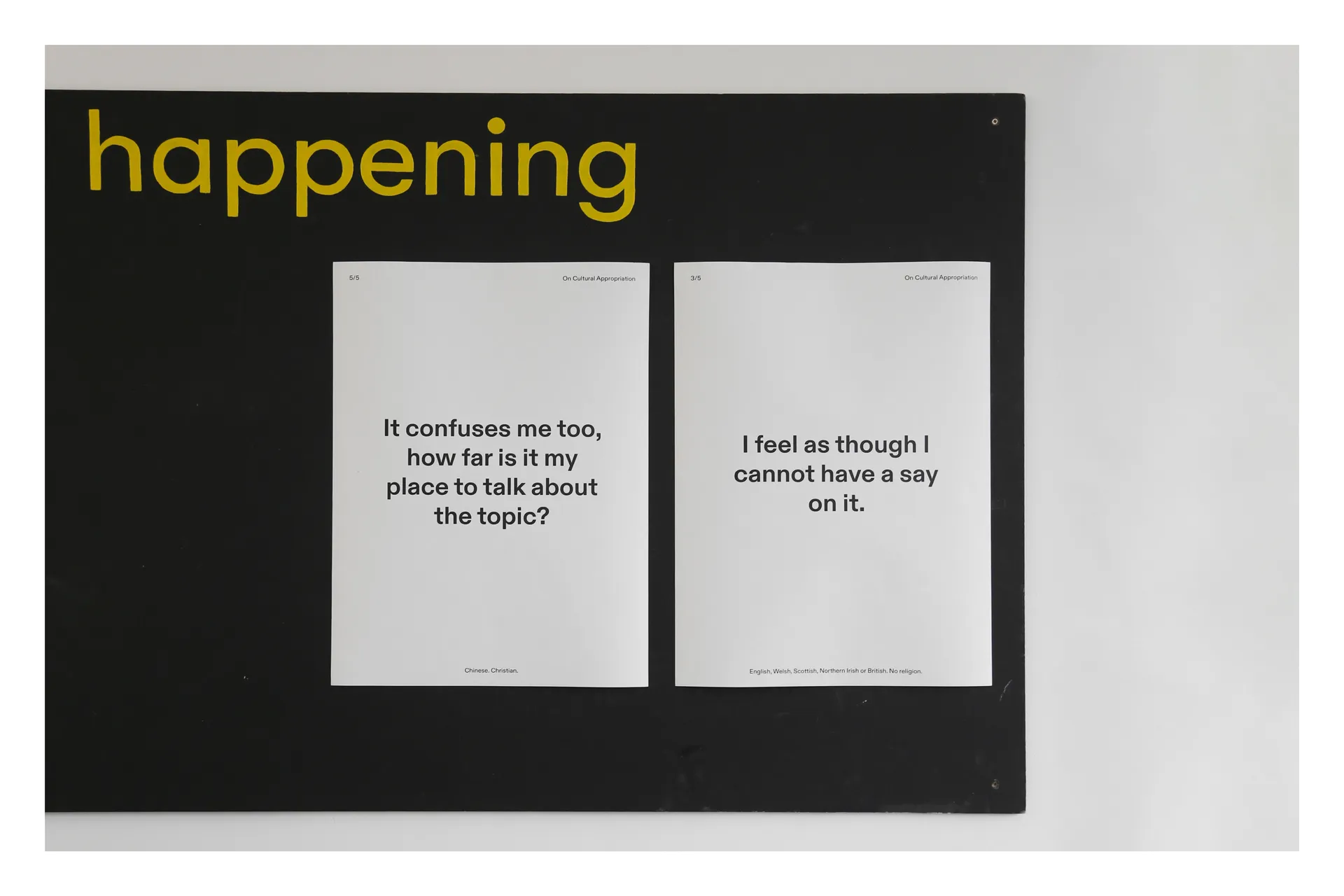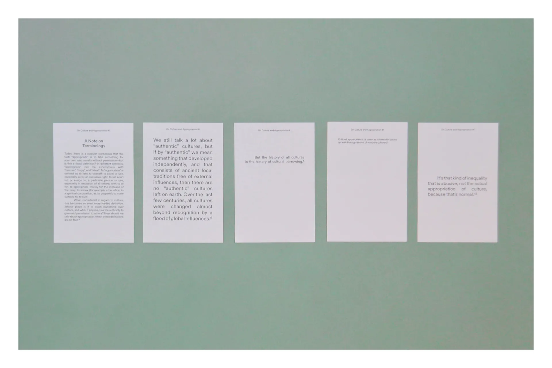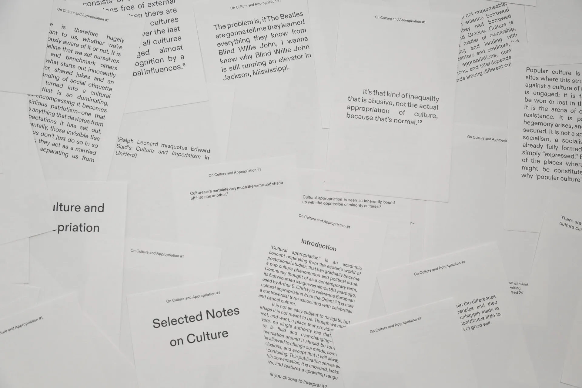 We have been conditioned to see cultural appropriation as inherently bad, but is this the reality? Appropriation is everywhere: it exists in the food we eat, the clothes we wear, the words we speak. It is not an easy subject to navigate, but perhaps it is not meant to be. Though we might expect, and want, a place that provides all the answers, no single authority has that power. Culture is fluid, ever-changing, and up to interpretation—the discussion around cultural appropriation should be too. This publication is designed to convey that: it is unbound, lacks page numbers, and features a range of opinions. It is accompanied by a purpose-built surface where the viewer can get to grips with the subject matter by organising their thoughts, recategorising information as they wish, and finding comfort in their confusion.