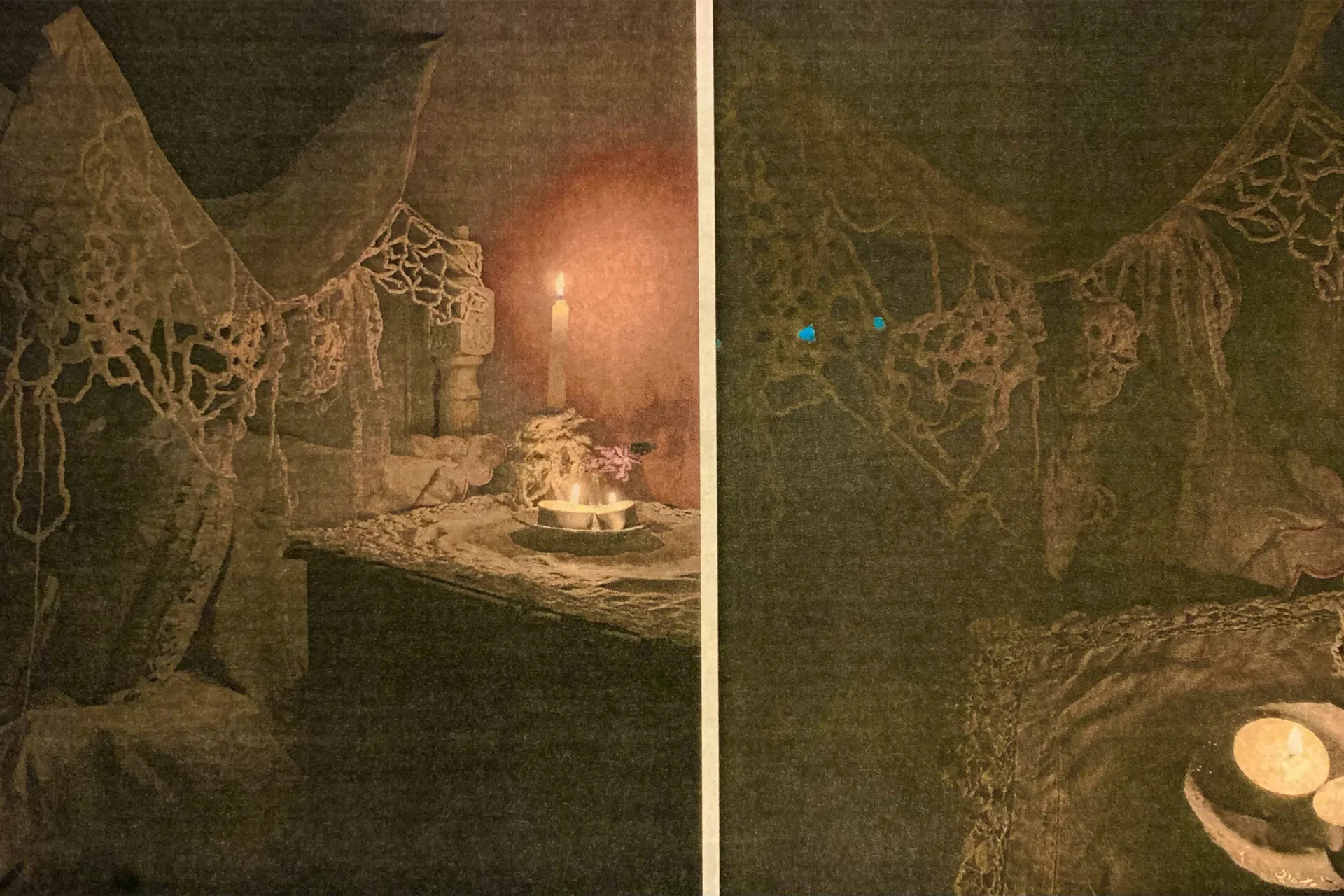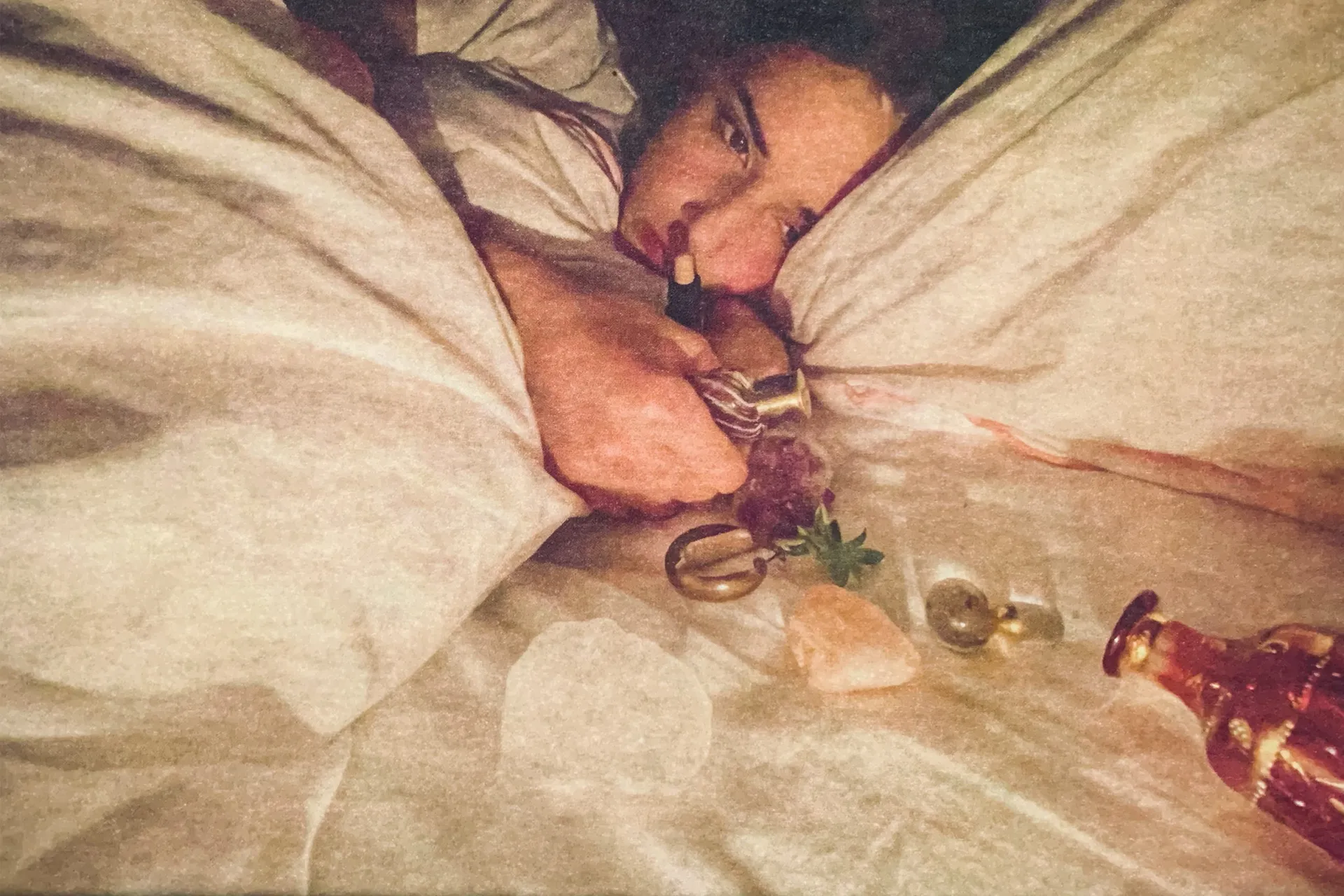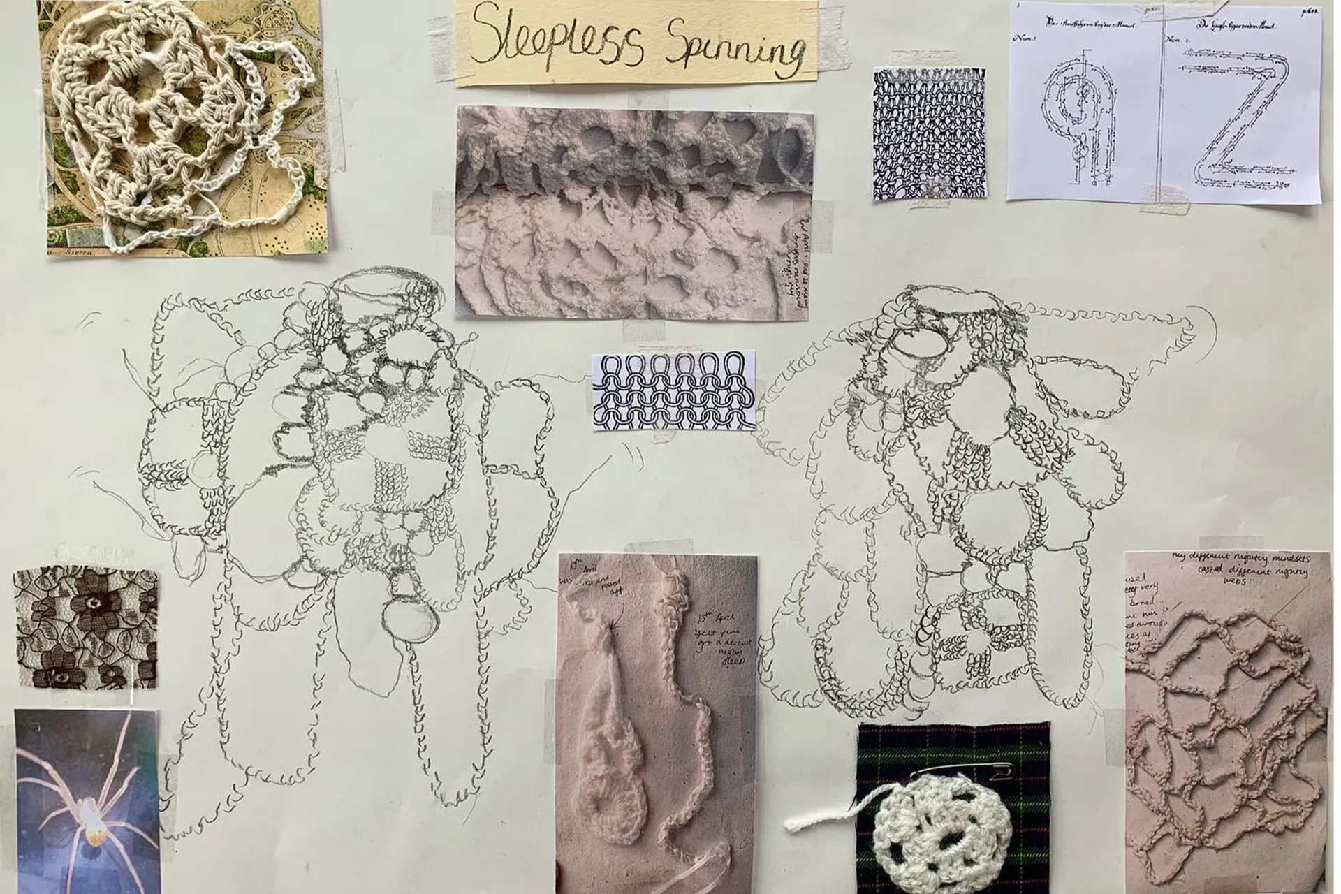 For my FMP, I was looking into long term insomnia and the ways in which it can decay one’s body and mind. I was particularly interested in the manic, delusional and hallucinogenic side of extreme insomnia. Having suffered from insomnia for many years I have developed coping mechanisms such as knitting and crocheting mini webs/ squares every night. I looked into Knit and crochet as a self-soothing mechanism for insomnia, and how the repetitive movements of the needles in your hands can introduce a trance like state. I then went to look at this on the more extreme side; looking into obsessional art as a nightly ritual.
