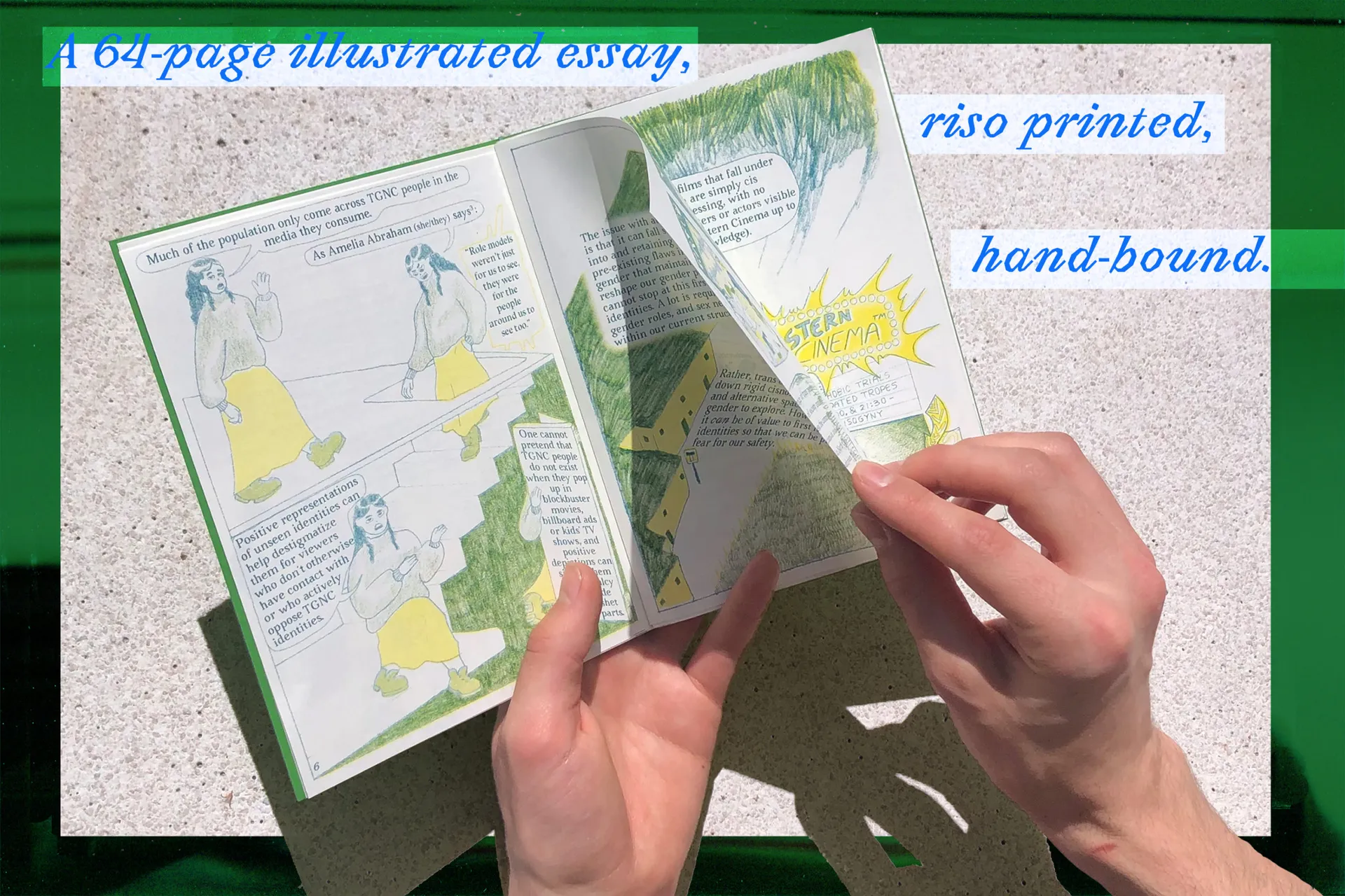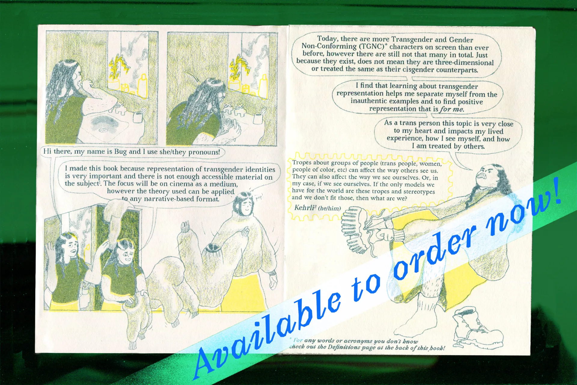 Bug spent her final year researching trans heritage in order to uplift unseen perspectives. Frustrated by the depictions they found; she wrote, drew, and self-published a publication that educates the reader on how to examine film for themselves, and offers a catalogue of resources to encourage further critical analysis.