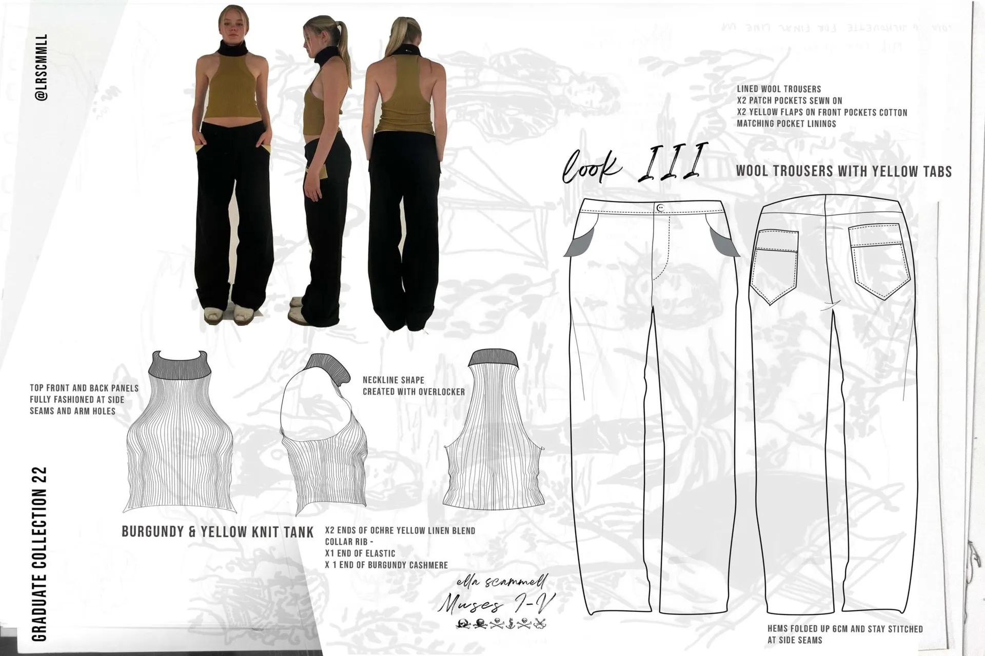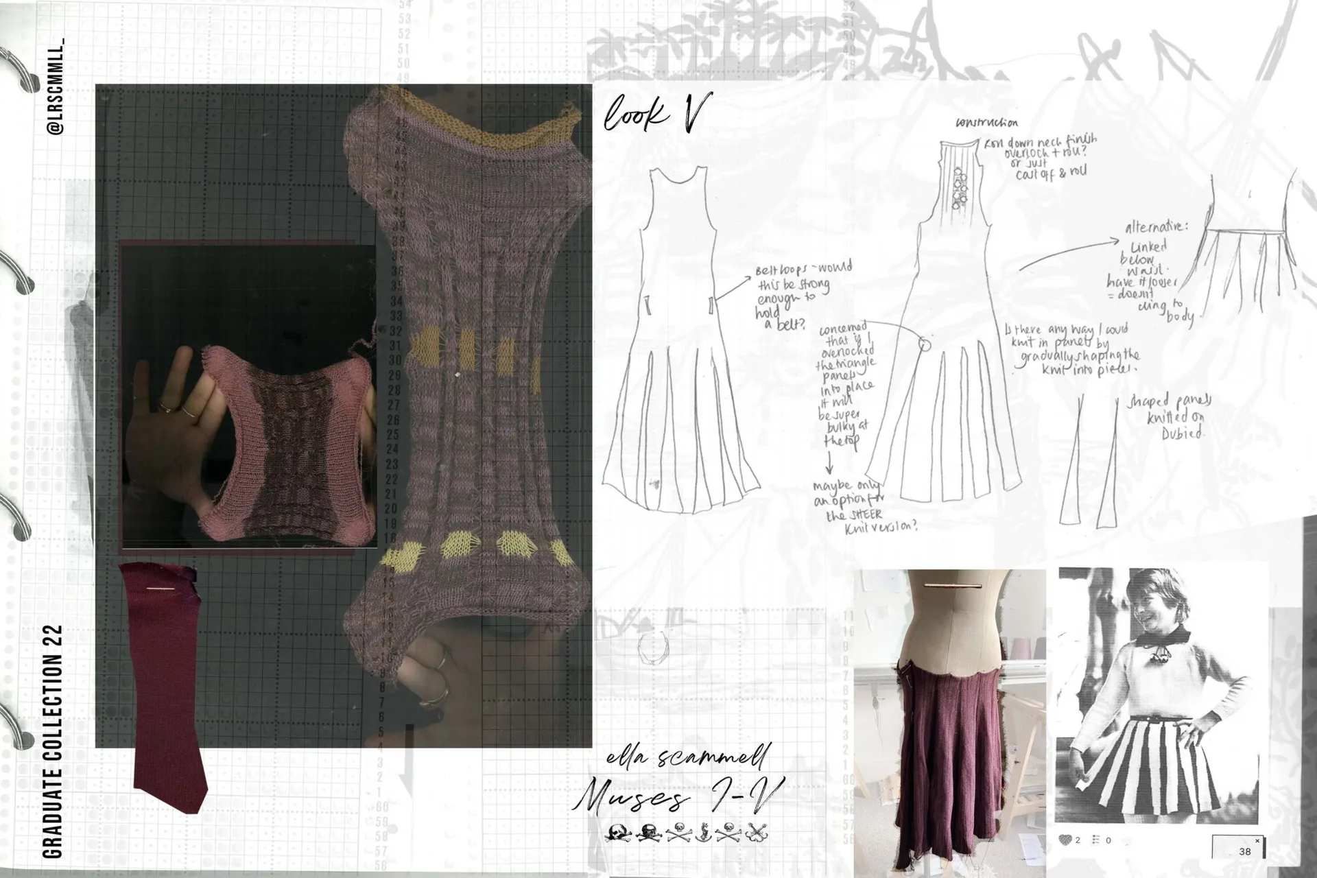 My approach to design is rooted in having respect and cherishing clothing, observing the attention to craftsmanship and detail that goes into their creation. Muses I – V evolved from initial investigative research into particular garments belonging to my Granny and my mum, who have always instilled in me the value of preserving and looking after clothes, so that today most of my own wardrobe is made up of these pieces. These well designed, well made and well kept pieces of clothing can teach so much about the importance of clothing being enduring both in design and practicality, which I have implored in my own work. In particular this value of craft manifests in the knitwear pieces of this collection. As the very nature of knitting as a discipline is a labour of love, consideration and calculation.