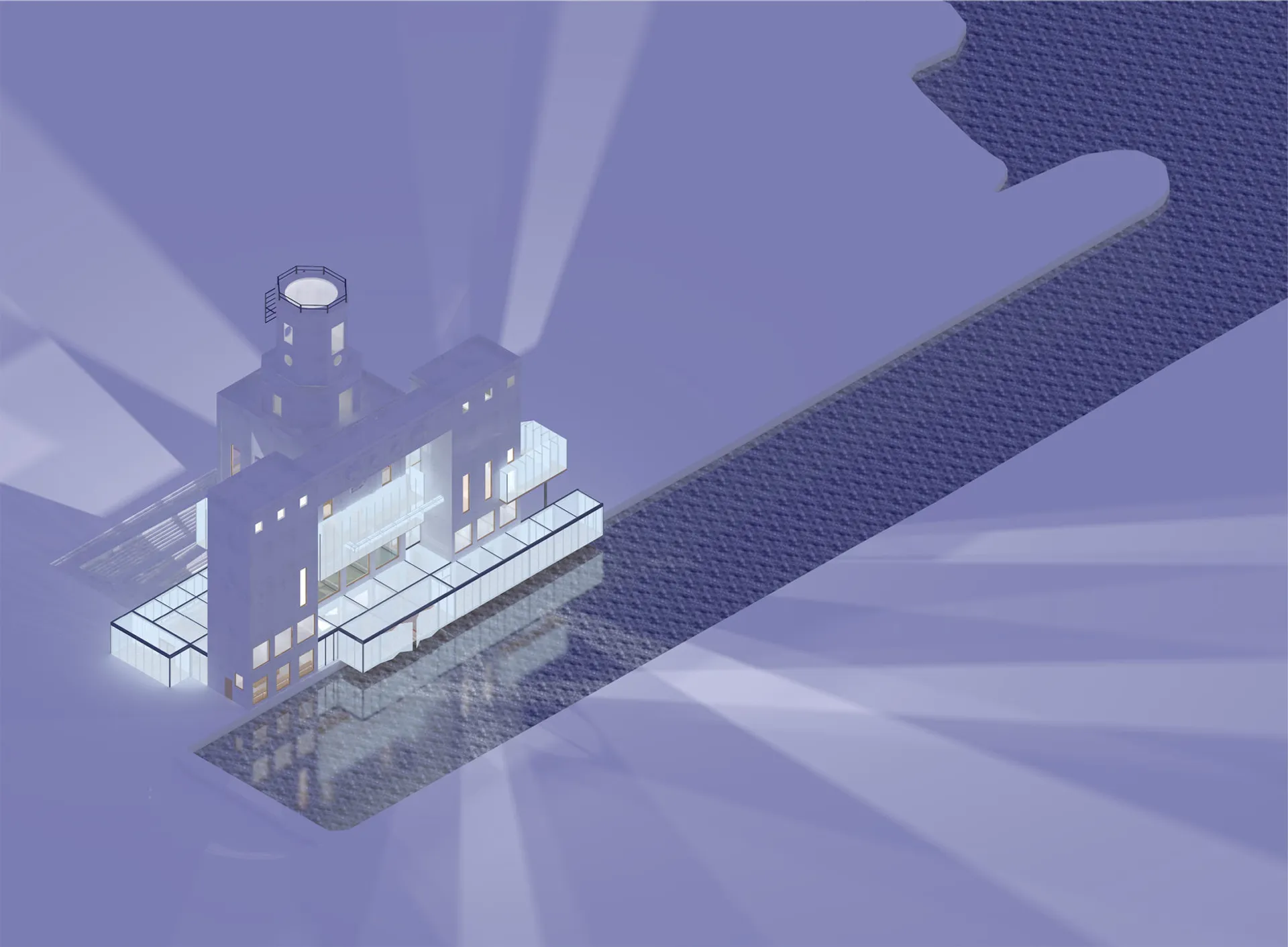 The translucent quality of polycarbonate allows a panoramic view of the Royal Dockland area, Silvertown and the Thames Barrier. The light catching abilities allow the building to be lit up at night – becoming a symbol of hope for sustainable living in the effect of a lighthouse.