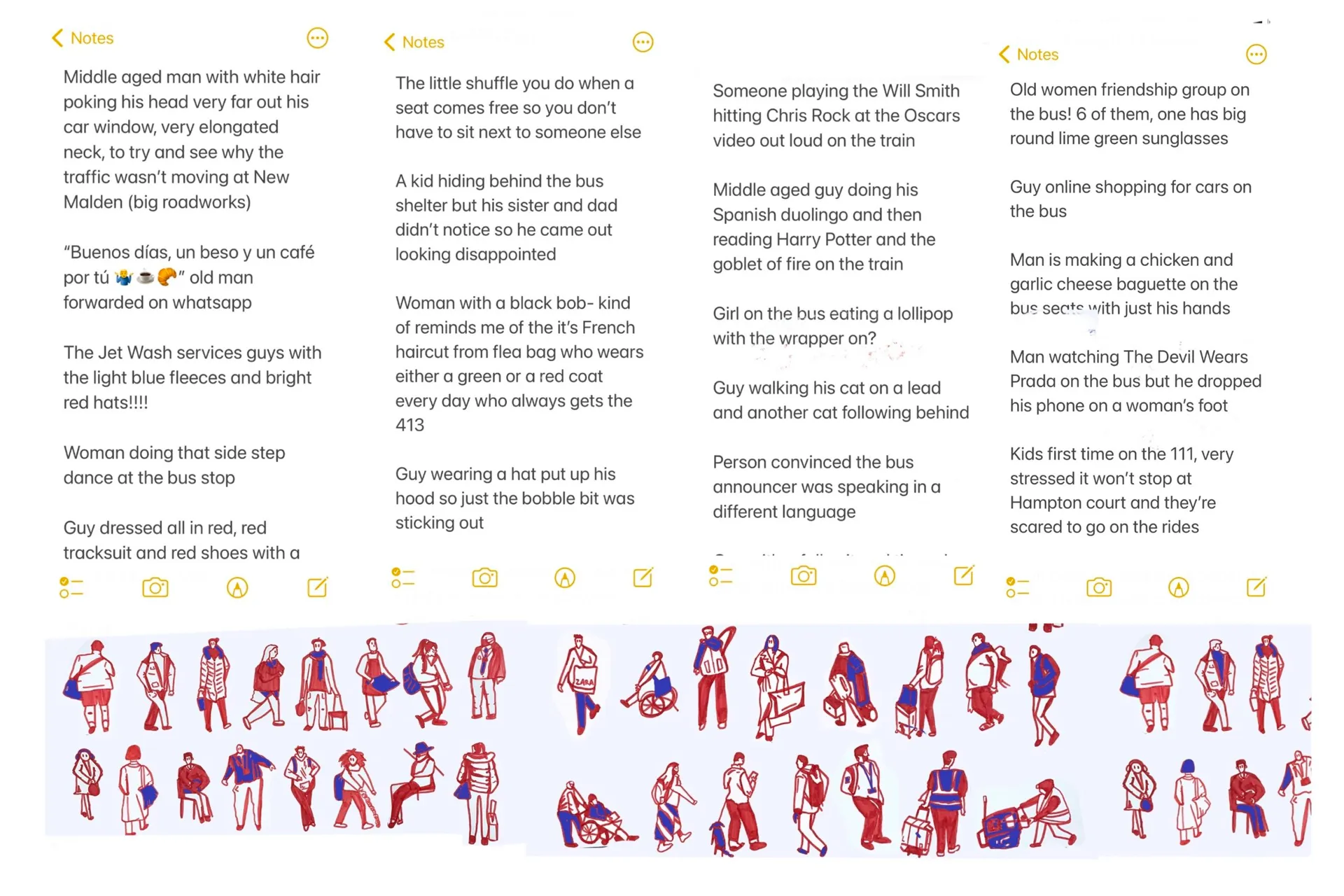 After creating a list of all the funny things I have witnessed on my commutes, I decided to use a mix of found imagery and digital animation to bring them to life. I used recorded sounds that I had taken from my journeys and created a piece that brought some excitement and humor into the world of commuting!