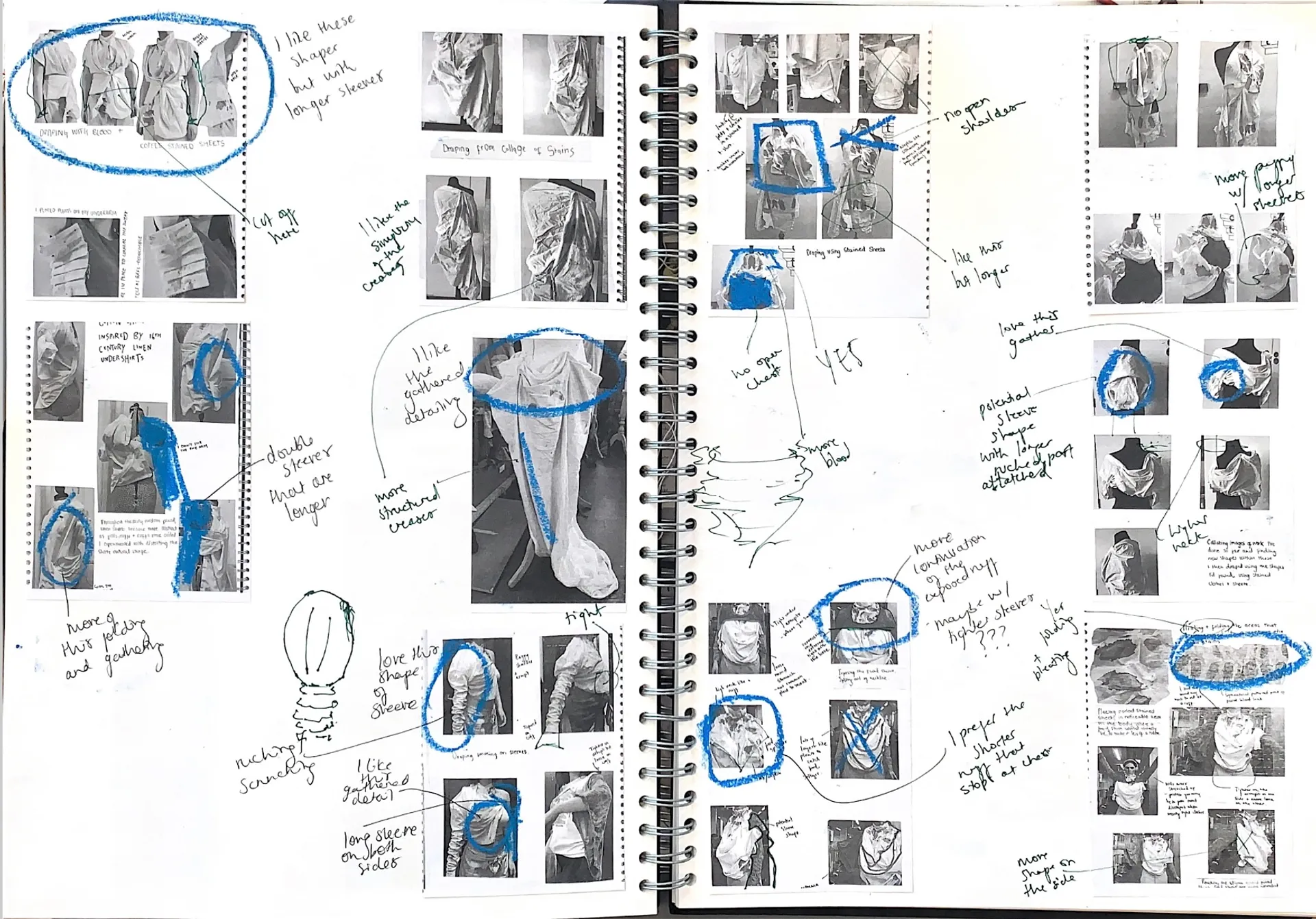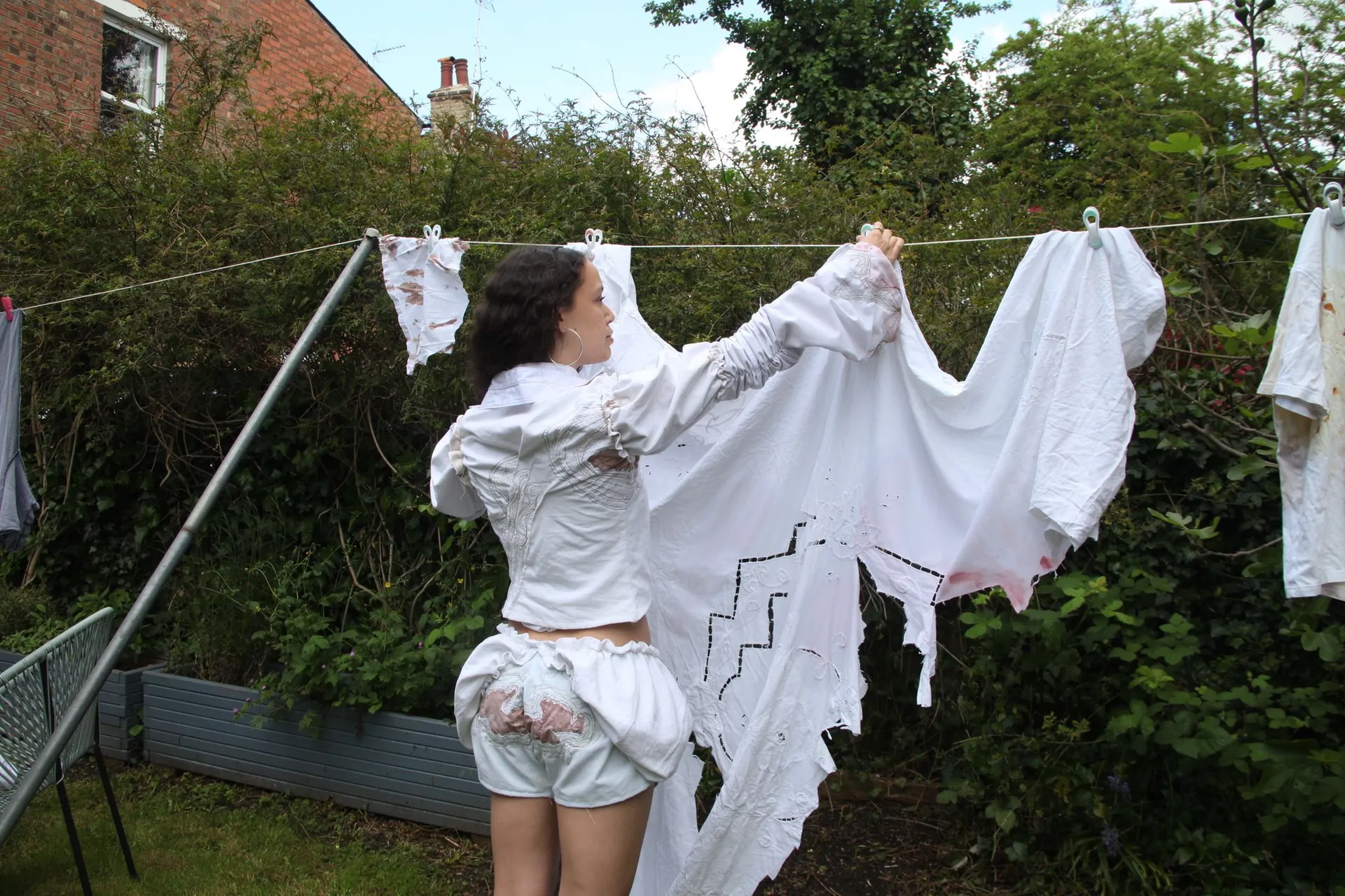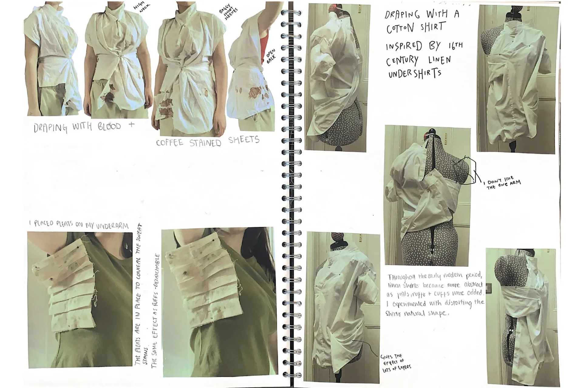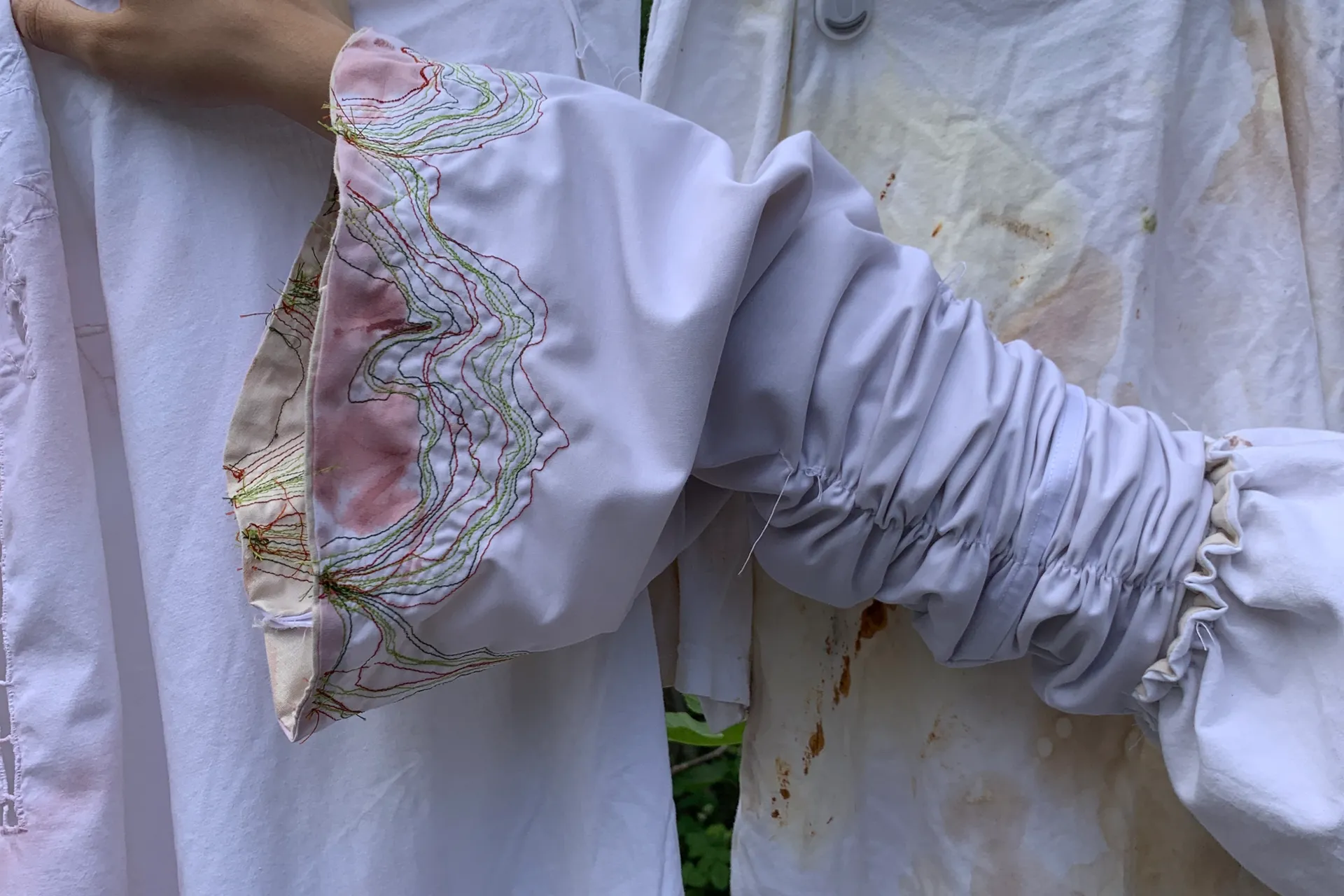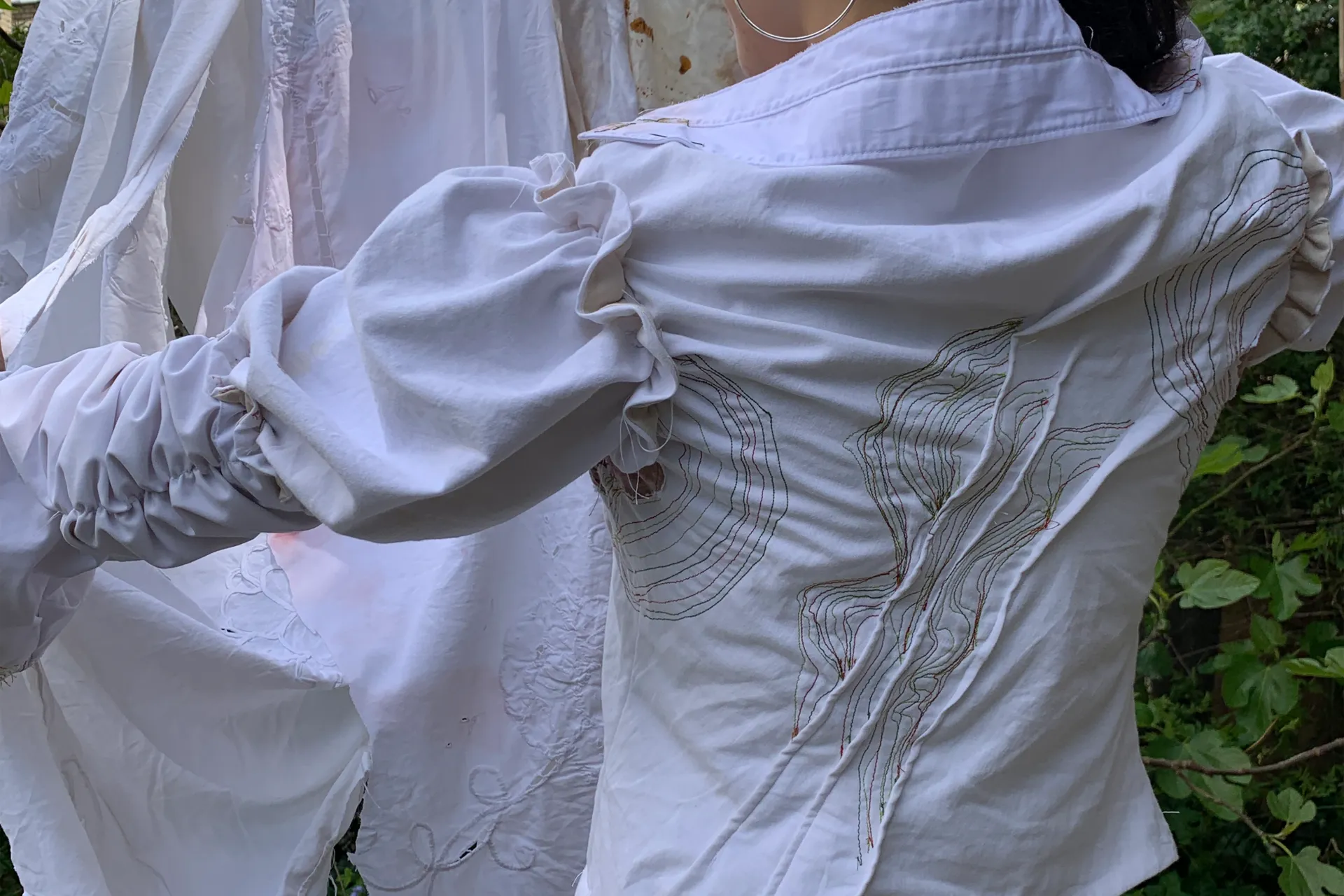I have designed and made a piece that embraces and normalises stains. This is to encourage people to wash their clothes less as the rising concern and obsession with appearing clean is having detrimental impacts on the environment. I looked at how I could fabricate the stains by using symmetry and highlighting them with embroidery, allowing them to appear intentional. The media I used in my final garment was linen cotton sheets as they are one of the most commonly discarded textiles. Additionally, in the 16th century, people believed that linen shirts could be worn as undergarments to absorb sweat, protecting the clothes and body from the need of washing. Using my old bed sheets encouraged this act of sustainability as I could repurpose old stained sheets rather than discarding them.