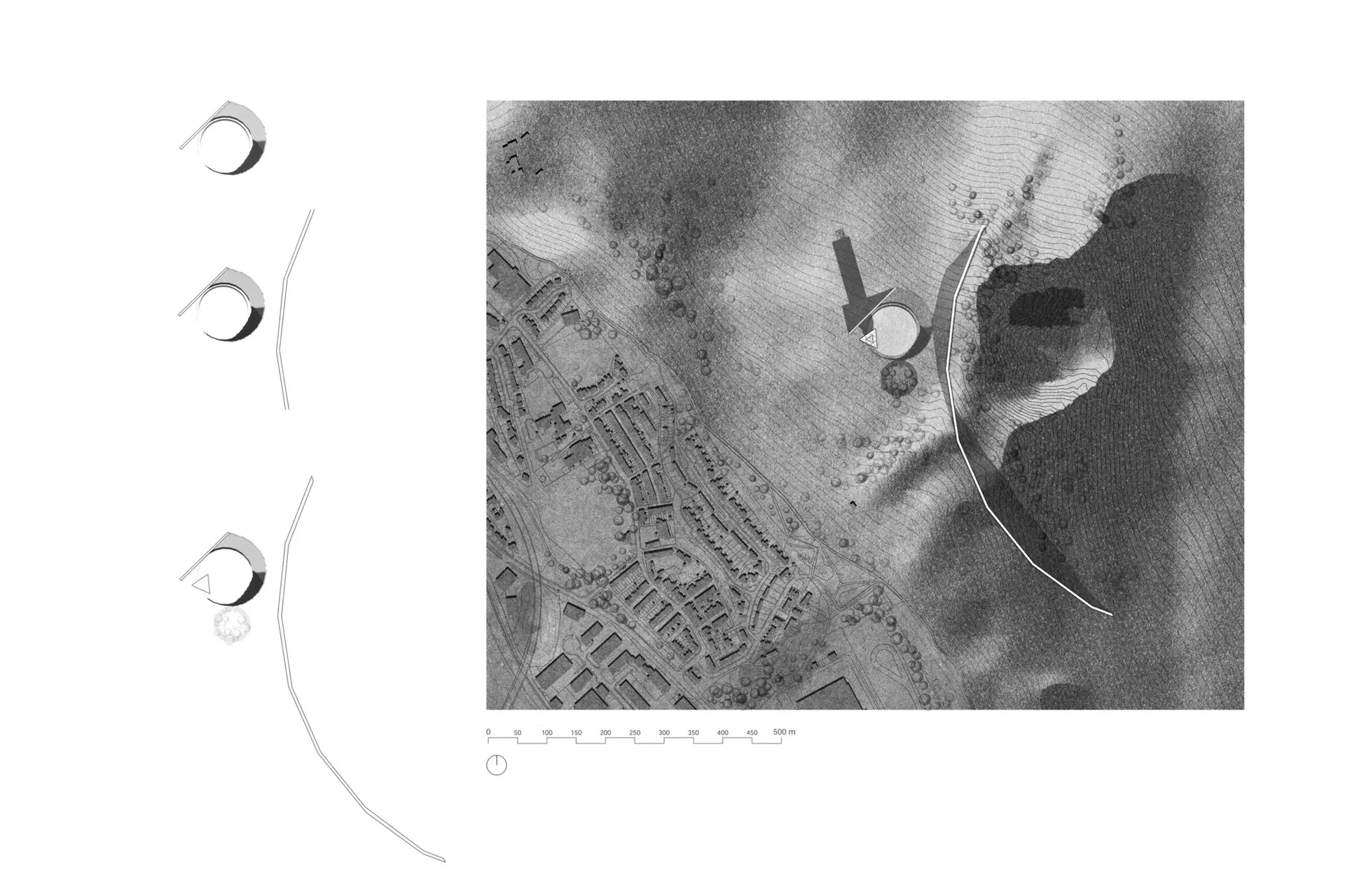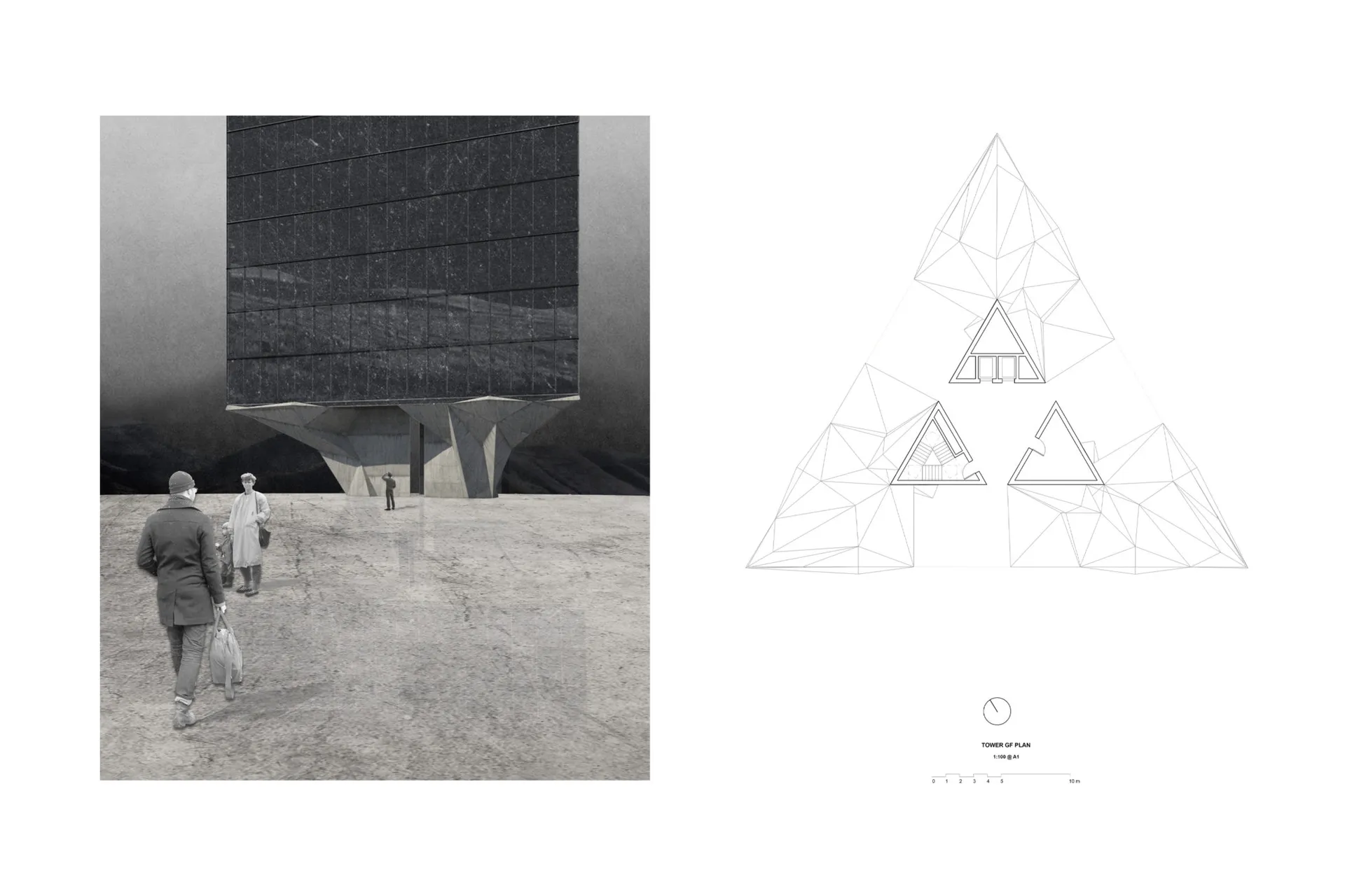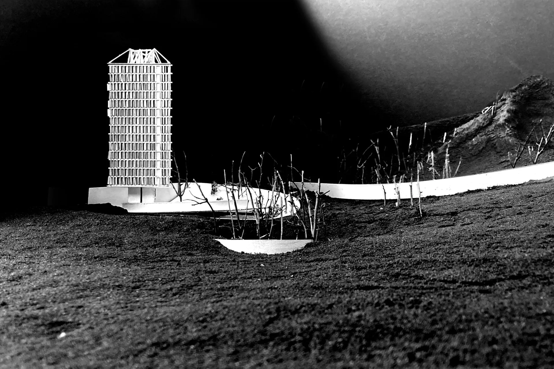 Located in the post mining town of Pentrebach, the project comprises of a protective or retaining Wall for the imposing colliery heap above the town and a subsequent seasonal residences Tower. The brief developed from the Unit’s initiating tasks. Sites in Music, and an adhesive tectonic study. The former sought to capture sites and themes, Every Valley by Public Service Broadcasting depicts the rise and decline of the coal industry and acknowledges the resultant neglected communities concentrated by the mining pits. Communities have always existed on the economic periphery in the fact the industry extract their land resources in order for capital to be acquired elsewhere. My take on the adhesive exploration was initially centred by the contemporary verisimilitude in architecture afforded by the composite panel, which led to an exploration of its antithesis defined by monocoque folded plate structures. The task additionally initiated an exercise of material interrogation and the research of novel coal based materials; a theme that came to govern the projects built elements. The Wall possesses a counter intuitive quality, an observation that gave rise to the Sergison Bates, Resistance essay. The Wall is subservient to the terrain in which it serves, a condition heightened by the rigidity of the Wall systems rationale, or artist’s constraints. The Tower follows the conceptual and material trajectory set by its preceding landscape intervention. In its service for urban capital to retreat, the aforementioned, wider capitalist constructs of the mining industries come to the fore. Akin to the Wall in ‘making visible’, the Tower furthers the polemical commentary on the relationship between land extraction, capital and the value assigned to life. The shutter protagonist, comprised of a Coal Based Glass Ceramic becomes a weighted measure of time, whilst sincerely expressing the value of the landscape and furthermore a renewed economy for coal beyond its accepted use in power generation.