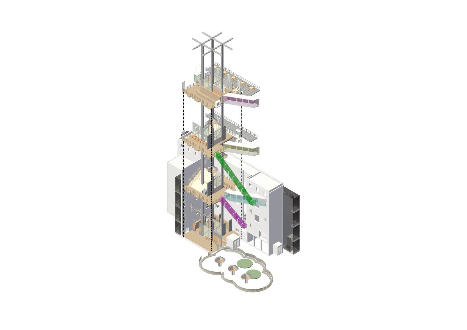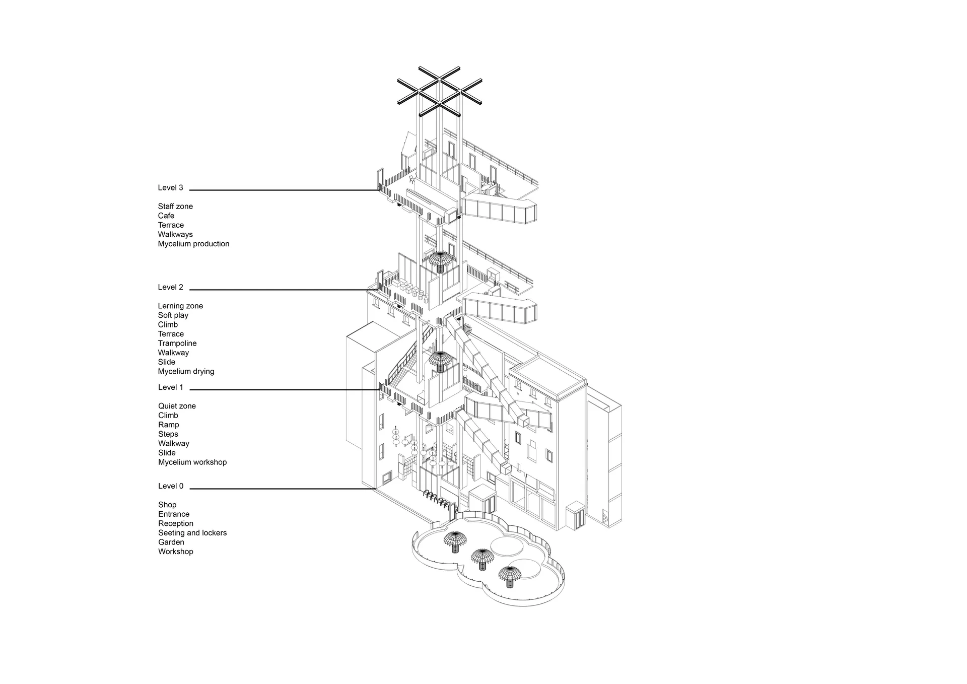 Playscape also includes a four-story workshop in the right tower dedicated to mycelium production. Each level is a production stage with the ground floor the workshop to produce items with the mycelium grown. The workshop is linked to the local primary school as an after-school club but can also be used in conjunction with the school curriculum.