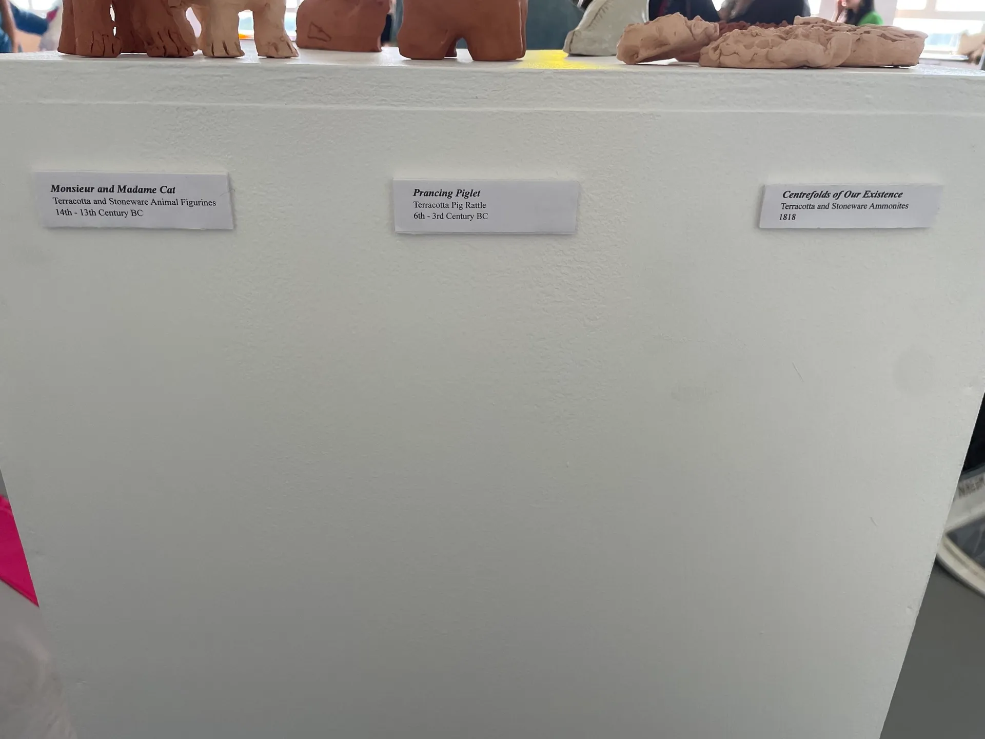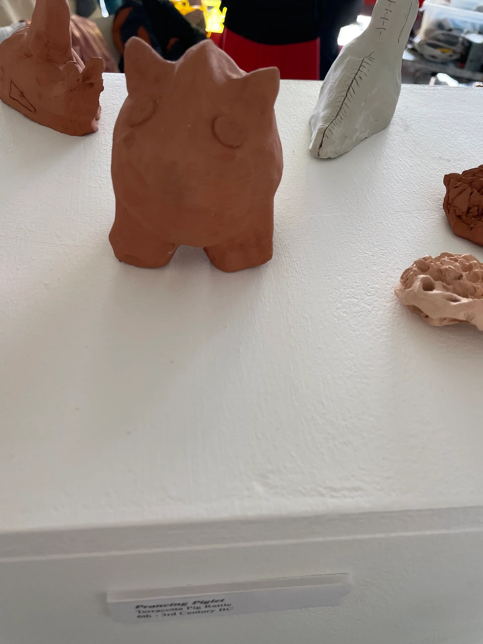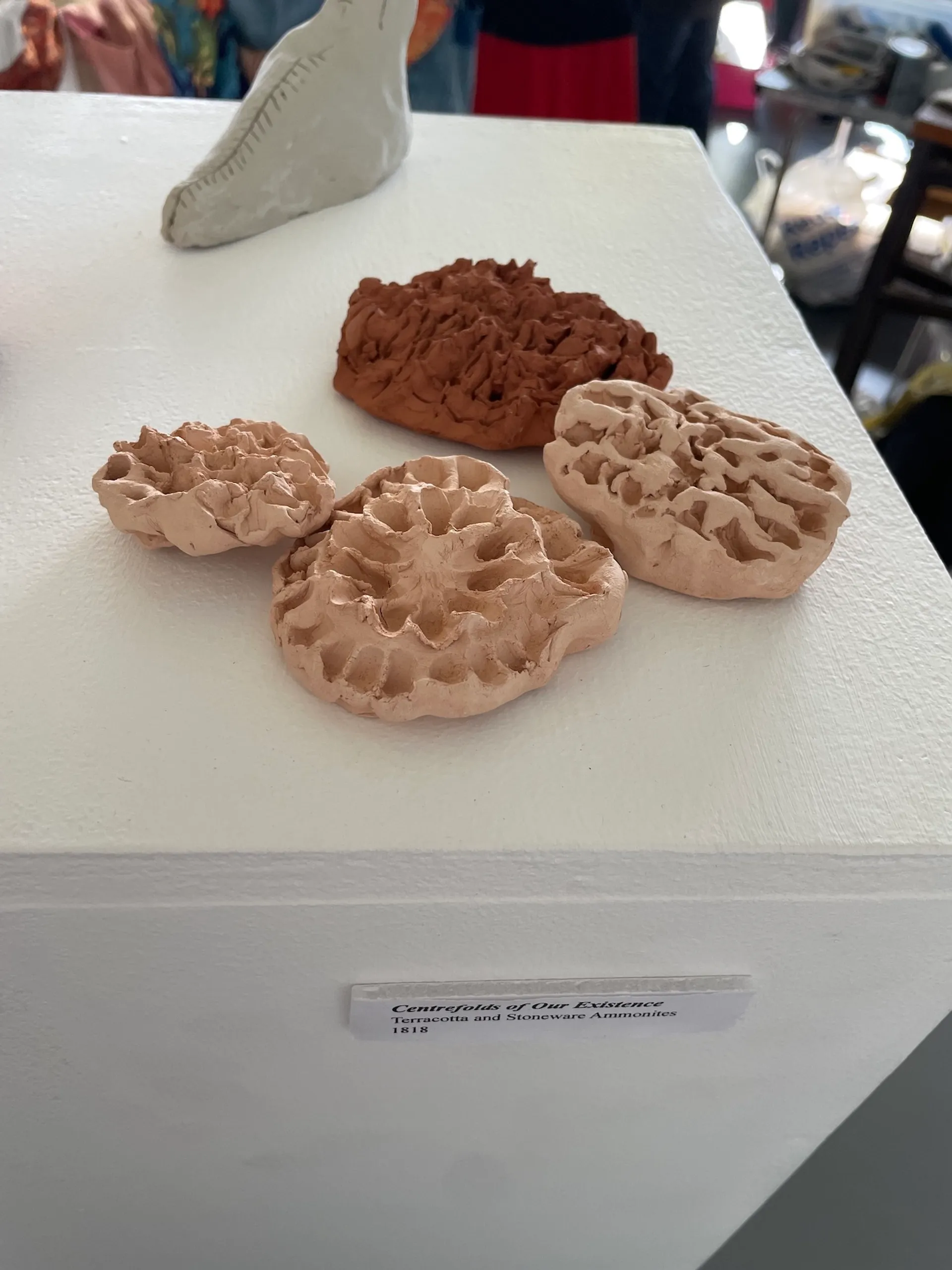 My work aims to educate the audience on our ancestors and the history of the world which surrounds us. I am fascinated by the products left behind by living organisms such as fossils and remnants of ancient civilisations and the trails of discovery that these can lead to. I wanted to explore where we came from, the circle of life and what inevitably happens to us once we die. I created various ceramic models of my own artefacts, based on historical stories with great significance/ imagery to me. Using clay worked well as I wanted to mimic the delicate and intricate subject matter I was exploring. I have displayed them on a tall white plinth to mimic the set up seen in a museum. The labels aid this idea, helping to show that they are on display.