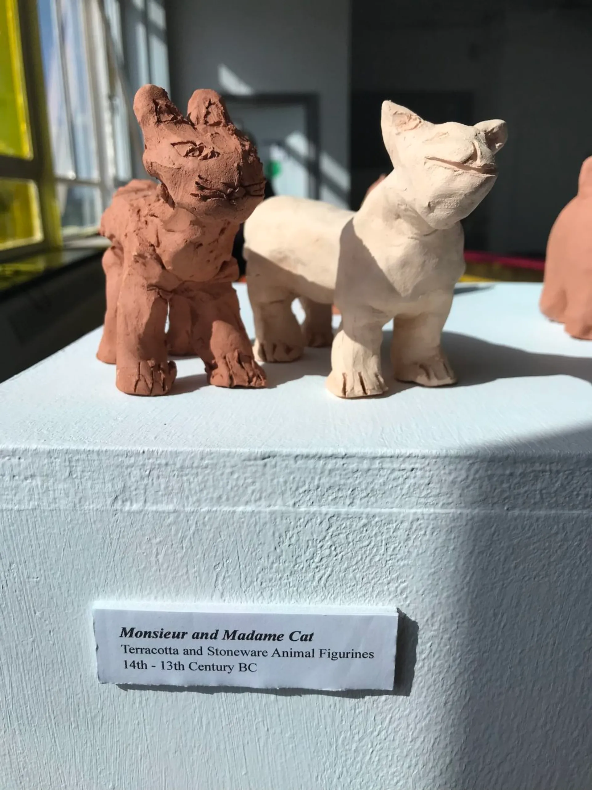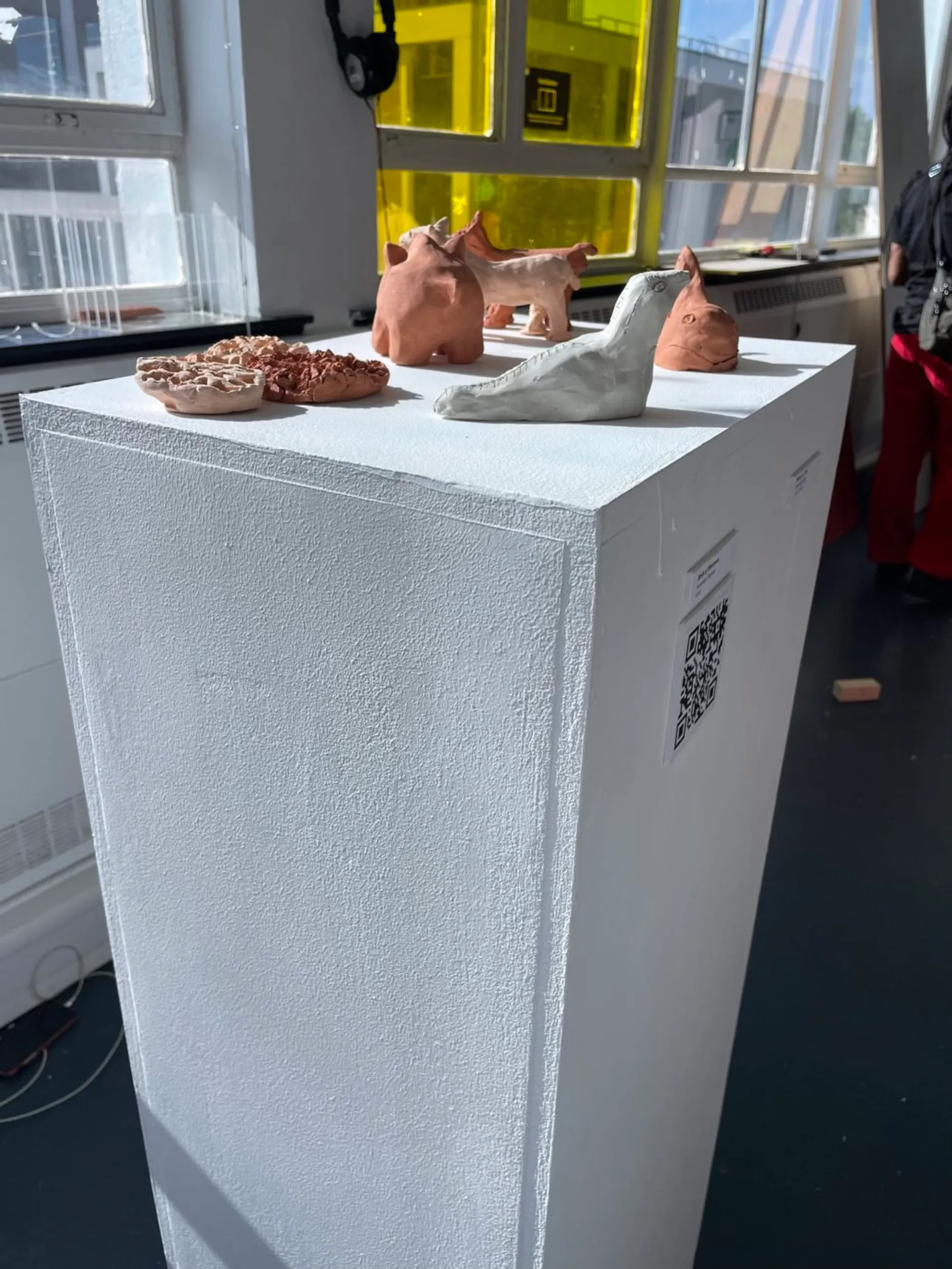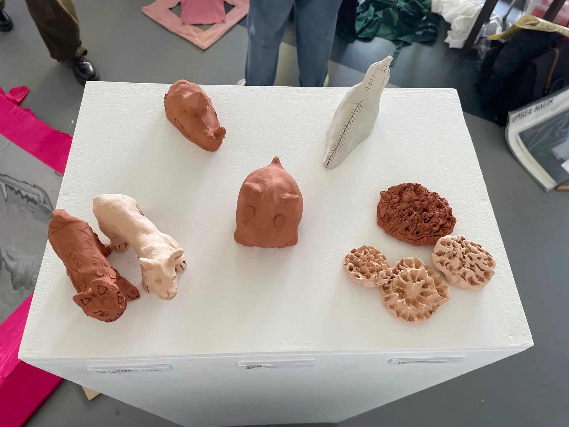 My work aims to educate the audience on our ancestors and the history of the world which surrounds us. I am fascinated by the products left behind by living organisms such as fossils and remnants of ancient civilisations and the trails of discovery that these can lead to. I wanted to explore where we came from, the circle of life and what inevitably happens to us once we die. I created various ceramic models of my own artefacts, based on historical stories with great significance/ imagery to me. Using clay worked well as I wanted to mimic the delicate and intricate subject matter I was exploring. I have displayed them on a tall white plinth to mimic the set up seen in a museum. The labels aid this idea, helping to show that they are on display.