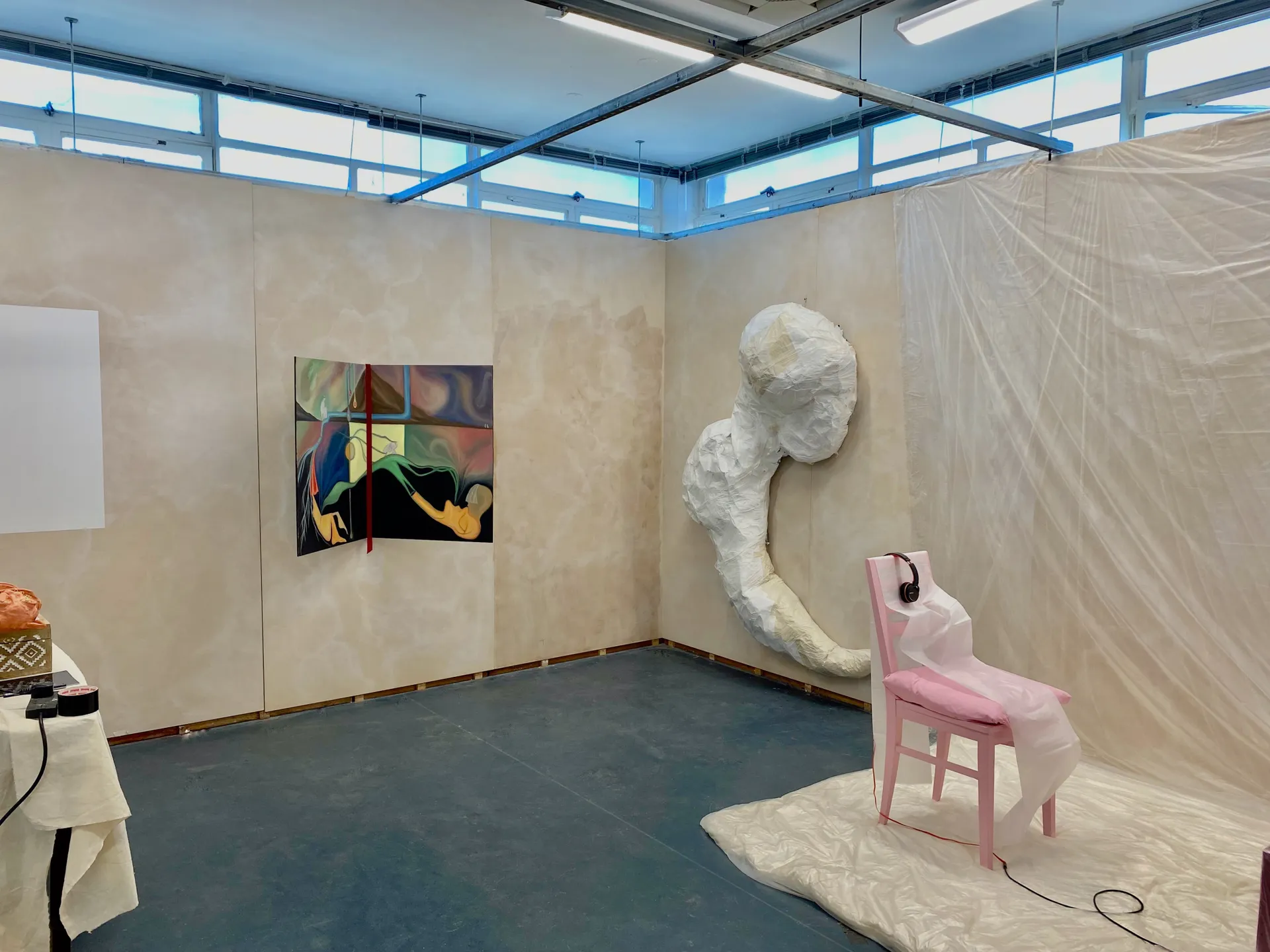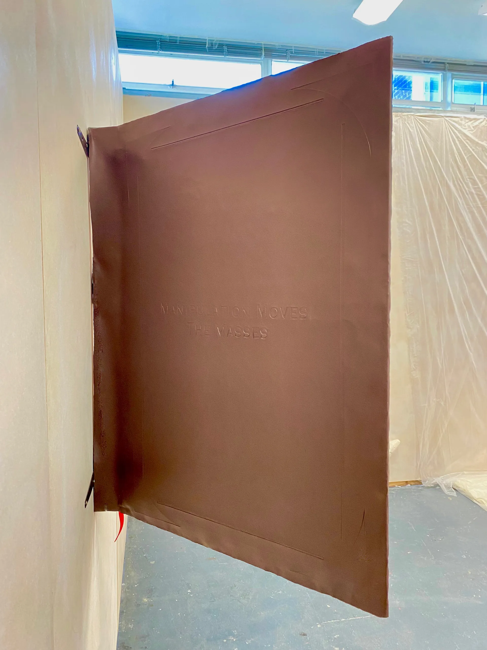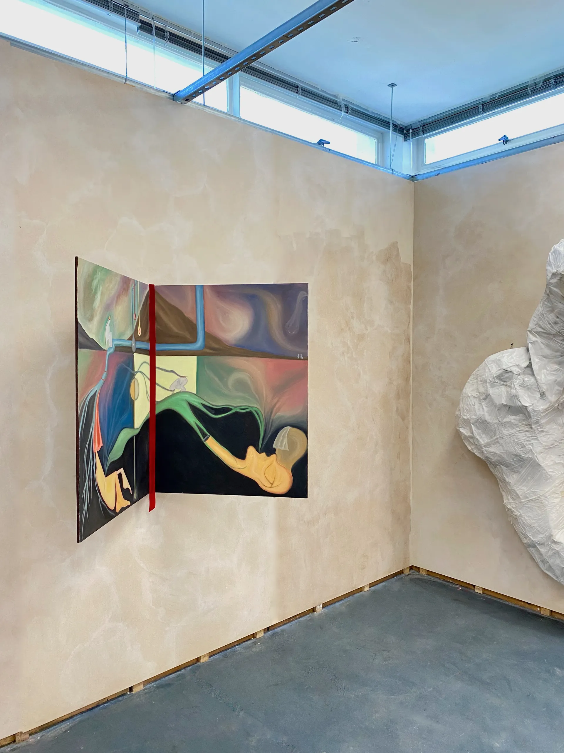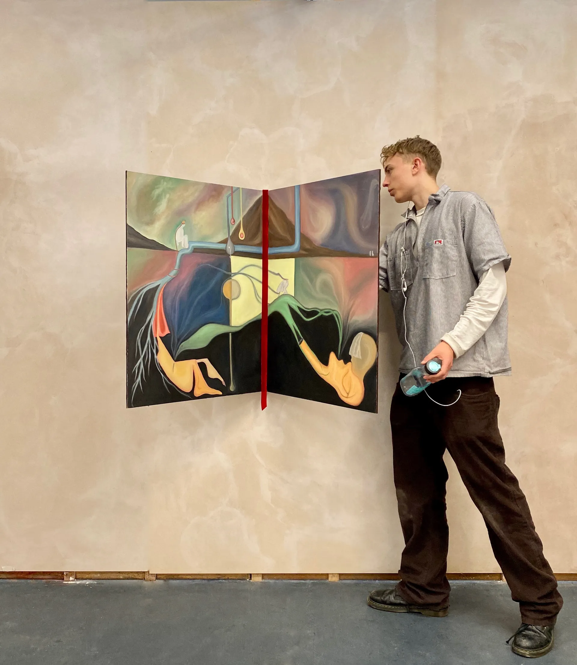 Reading symbols and imagery to understand their hidden meaning is deeply rooted in religious practice. From colour to animals to material, details control the narrative, and inform the advice offered to the follower to abide by. This painting aims to mimic this process of behaviour, whilst also coaxing out its evident flaws. The imagery painted is designed by my subconscious, and therefore shows no calculated storyline, however incites the same response of curious interpretation to gain a higher and more rewarding understanding. This however, is only revealed to be a testimony of its flaws once the viewer reads the cover of the book, ‘Manipulation Moves the Masses’, and understands the advice they absorbed from the imagery, is merely what they want to understand and abide by.
