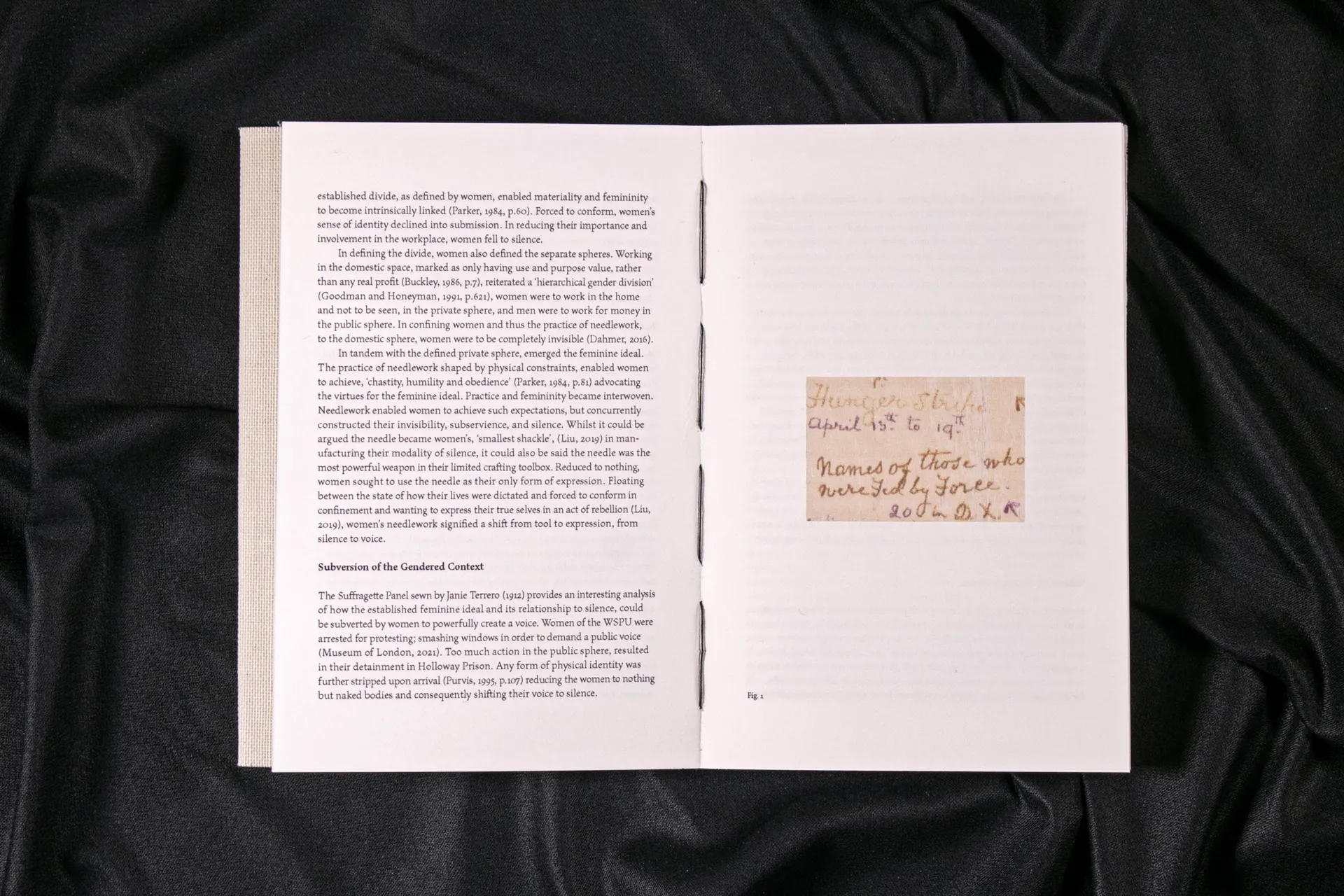 My dissertation publication, titled, ‘An exploration into how needlework, typically a silent craft, has been used by women to gain a voice’ explores the key concepts discussed throughout the text; the relationship between silence and voice and our relationship to touch. The emphasis on the physical nature of the publication enables it to become a tangible object and allows the reading of the dissertation to be navigated materially.