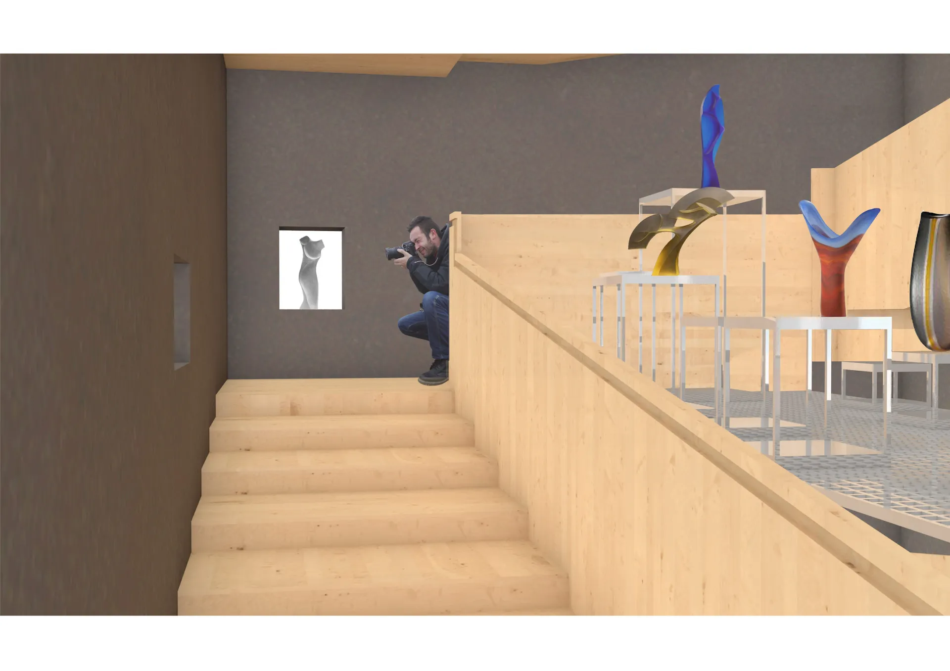 The glassblowing studios and museum work by attaching new rooms, bridges, lifts, and stairs to create different hierarchies both vertically and horizontally. The building’s personality can be found in the most private of spaces and other spaces that welcome an audience. There are constant shifts in scale that allows for a playful wider visit and acknowledgement of the large-scale architecture or the more serious interrogation of a glass project where someone notices a small detail in the corner.