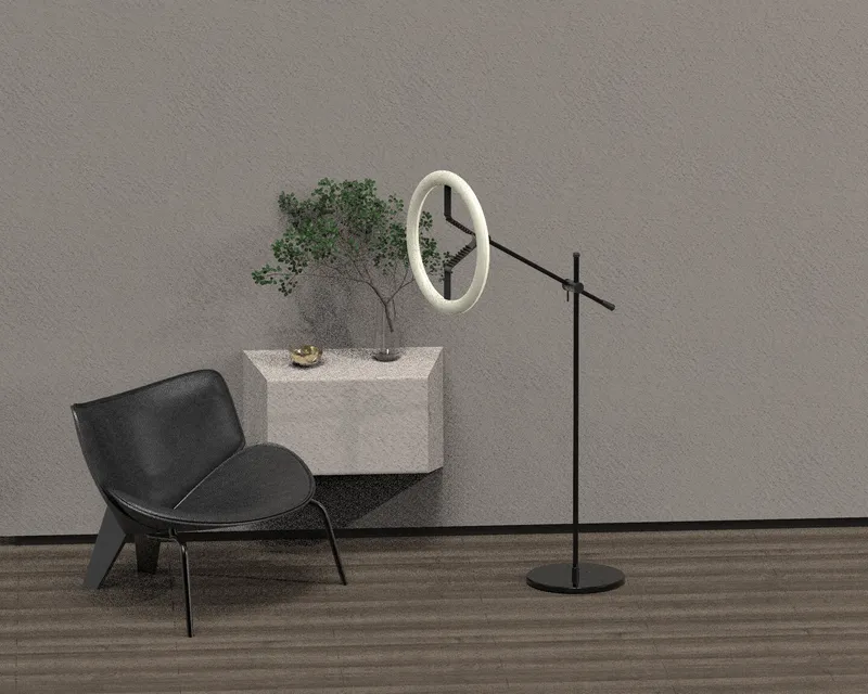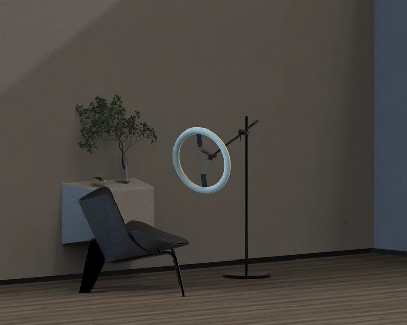 The design allows perfect lighting for video calls in its secondary life. The halo shade flips, to action ideal portrait lighting conditions. The central bracket has an integral silicone phone holding device with charging.