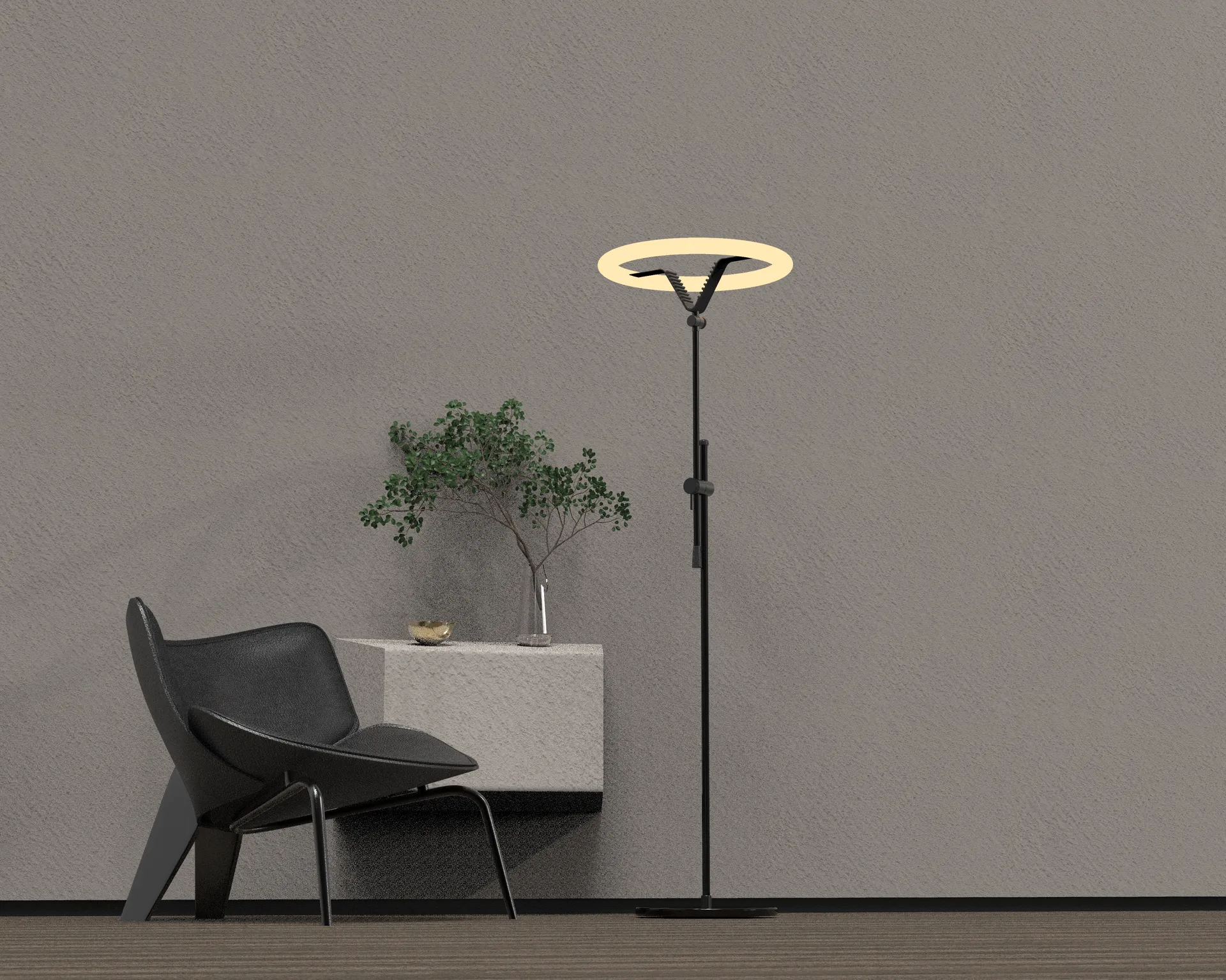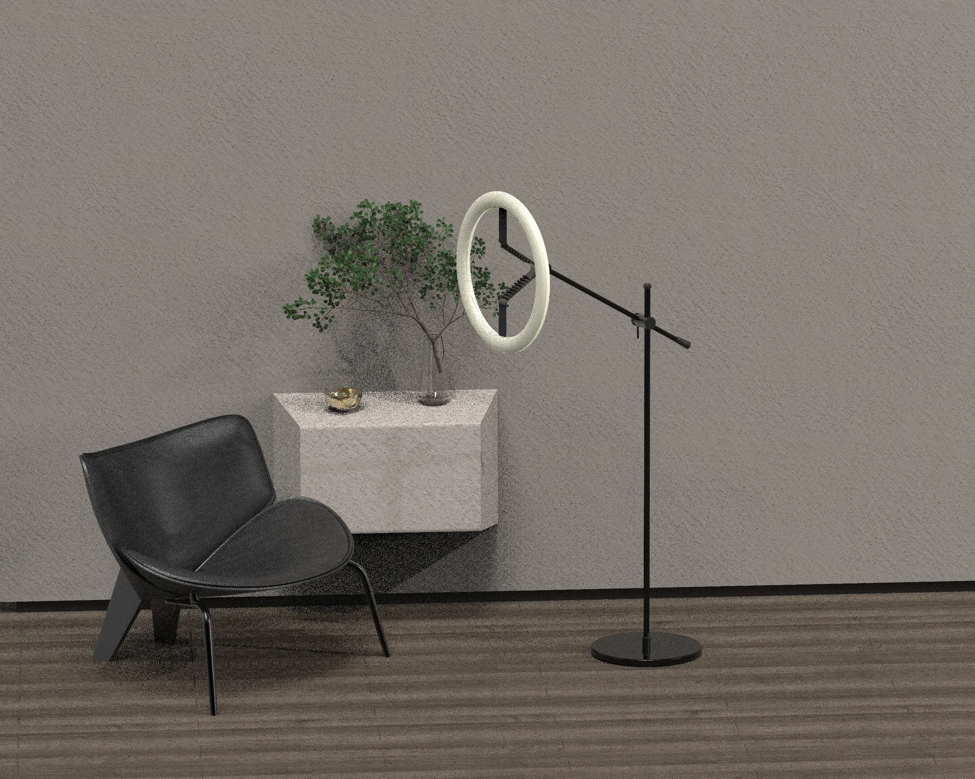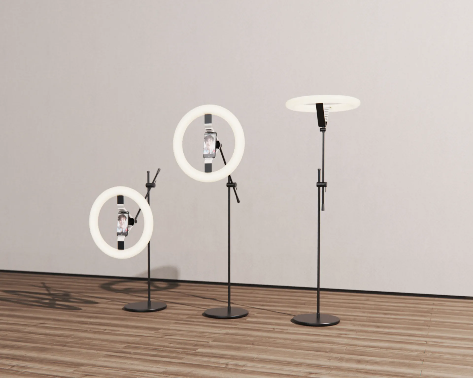 The design allows perfect lighting for video calls in its secondary life. The halo shade flips, to action ideal portrait lighting conditions. The central bracket has an integral silicone phone holding device with charging.