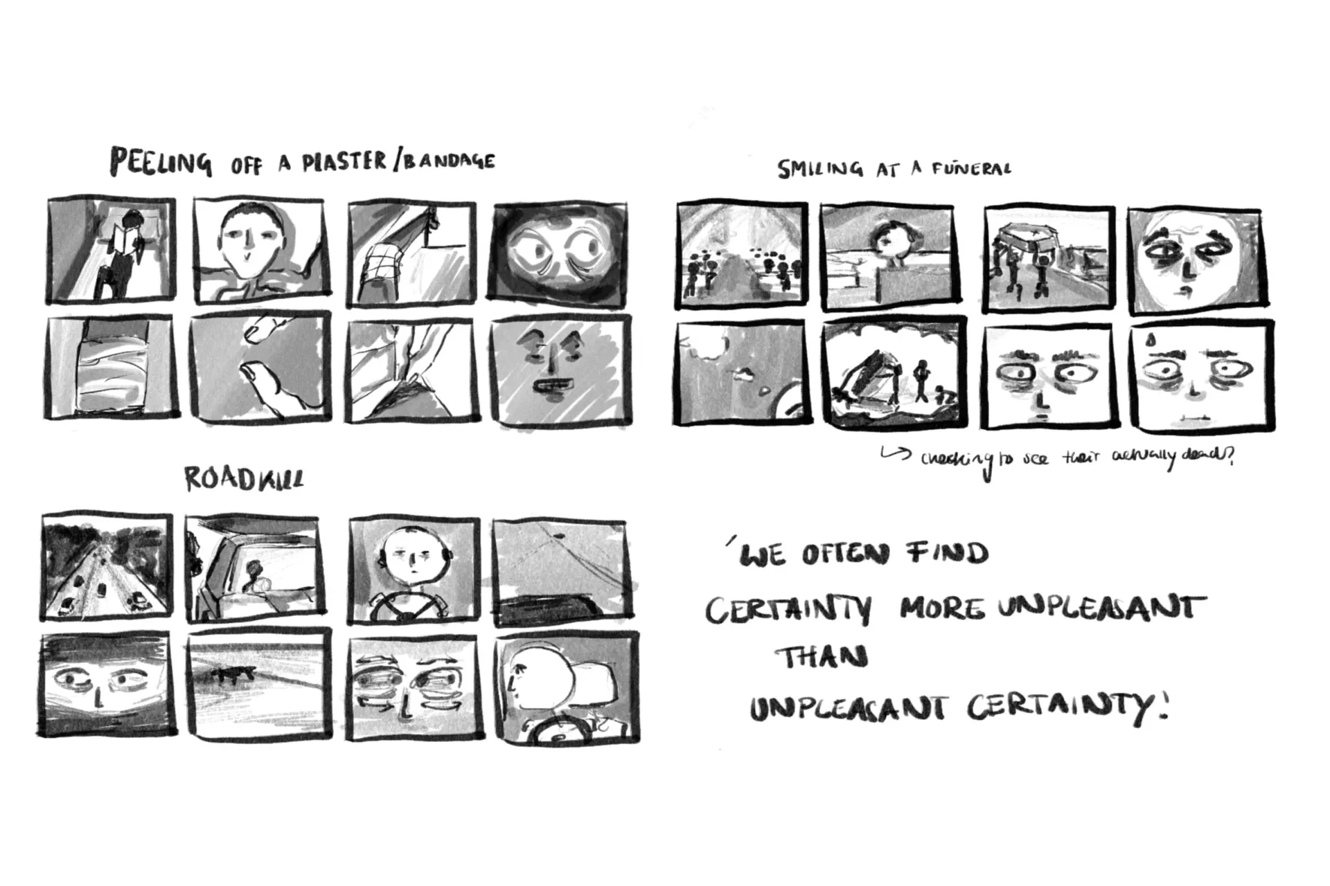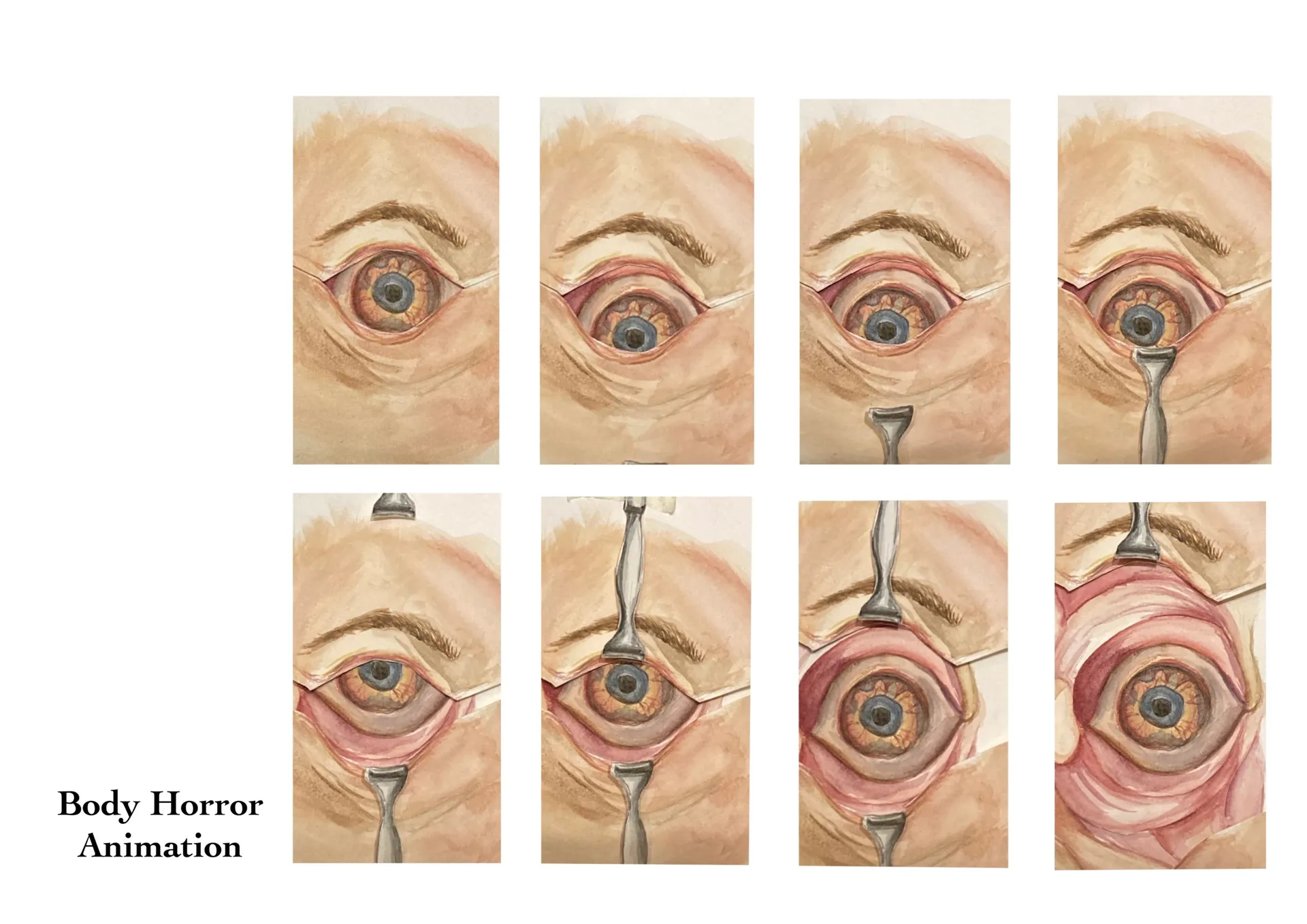 My work is looking at ‘morbid curiosity’ and why we are so fascinated by the morbid and macabre. I conducted research into forms of morbid curiosity and ways it presents itself, further looking into explanations as to why we have this curiosity. I found human reaction and interaction with a morbid stimulus to be the most interesting and tested this idea by iterating certain tropes or body reactions in specific situations. I wanted to make a comment about the way we all interact with something that’s unknown using hand movements to show this sense of ‘should I or shouldn’t I’. The hand movements involve ‘prodding, poking and squeezing’, as seen in moments of curiosity towards something unknown. I chose a fast paced, silent atmosphere and morbid curiosity is something experienced silently, in that the majority are reluctant to admit to it in fear of judgement. The ‘itch’ sound is suggesting this morbid curiosity to be something of an itch or an urge to do something and gives the impression it’s something you shouldn’t do.