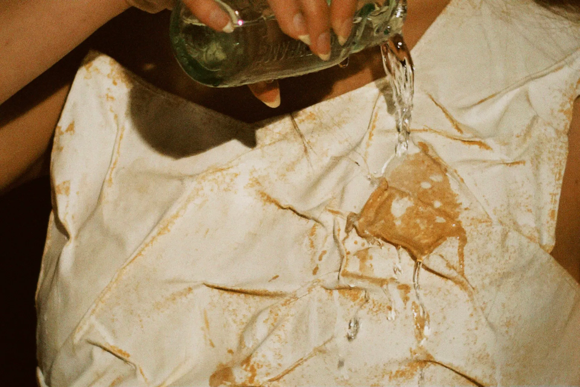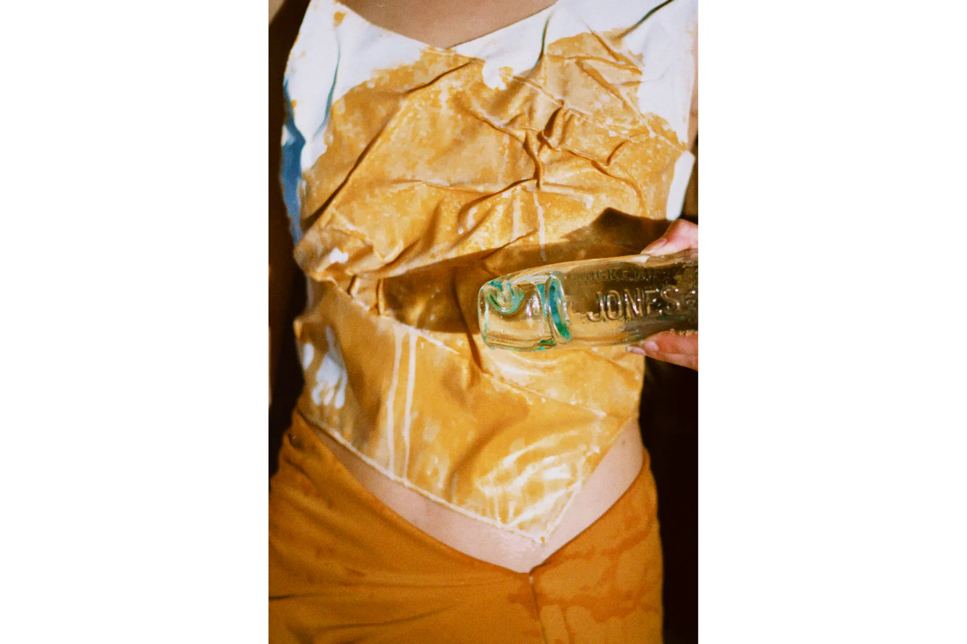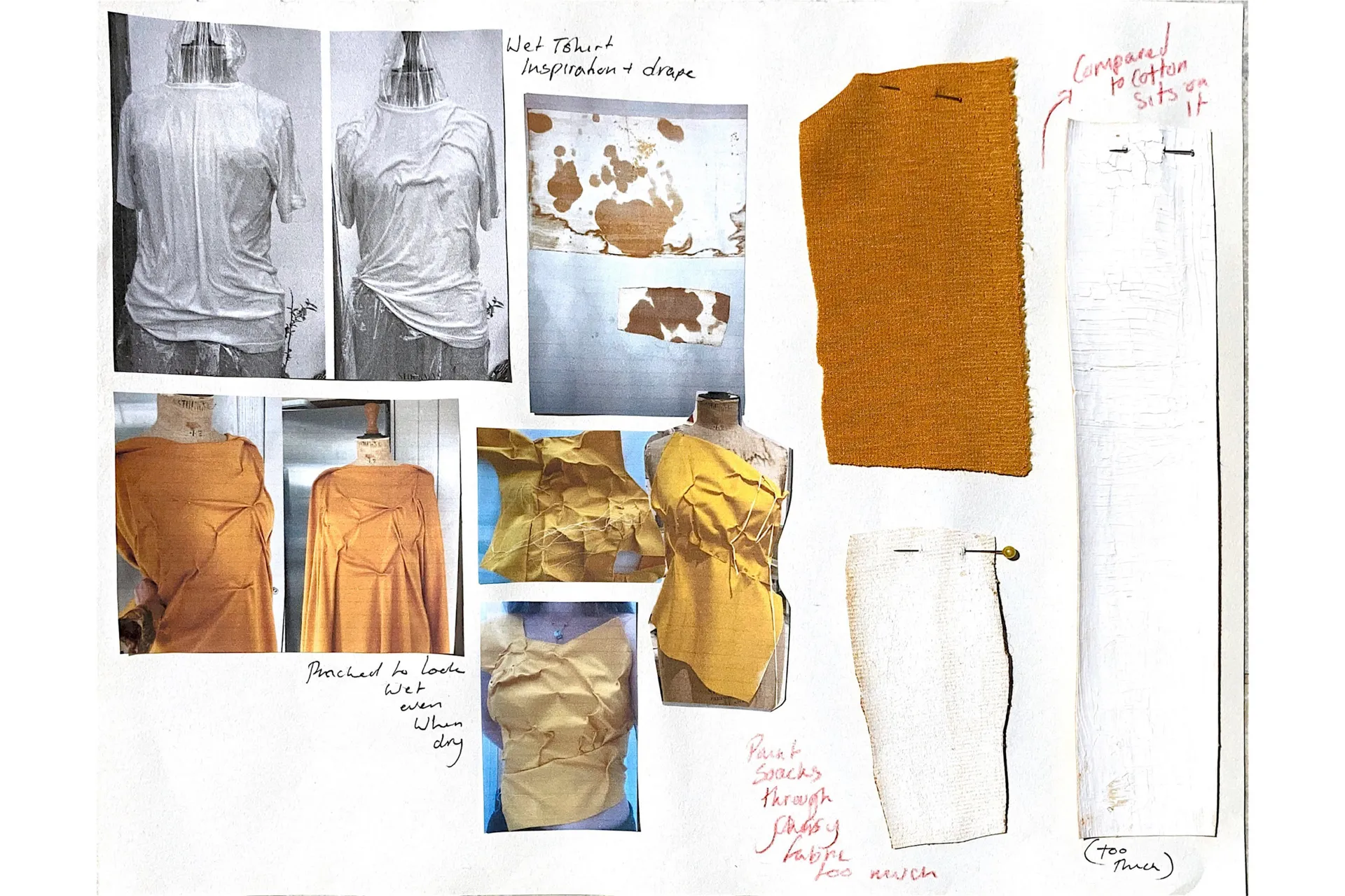 Throughout my research I came across a lot of desert Island, washed up on the beach style depictions of being stranded- Think Cast away or Blue Lagoon. I noticed very quickly how women were being hyper-sexualised even in danger; dressed in wet white T-shirts and clothes ripped in ‘convenient’ places. I wanted my piece to fit this recognisable archetype whilst subverting the sexualisation of it which is why I created a white wet look top, that instead of going see through when wet, it goes bright orange- becoming a signal for danger.