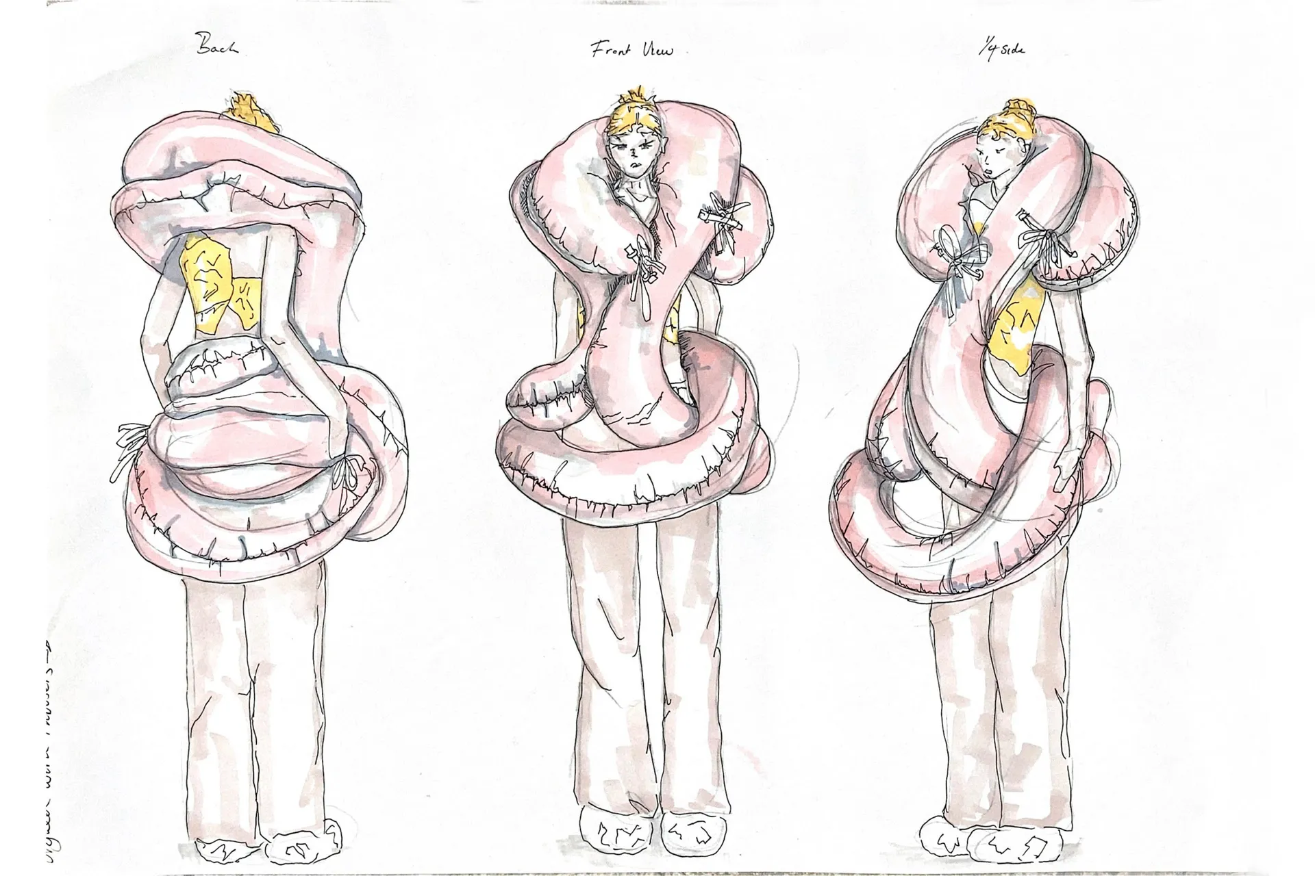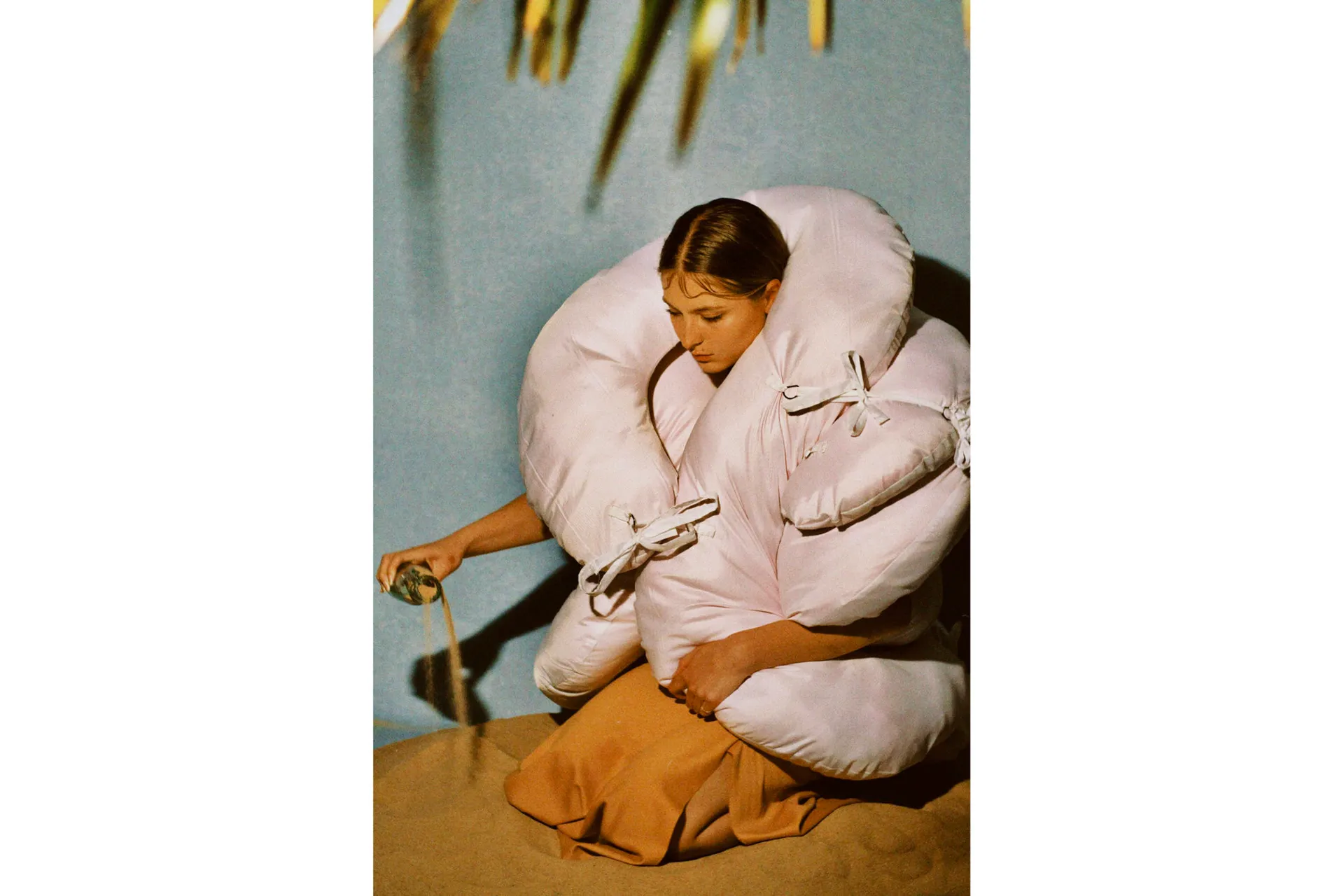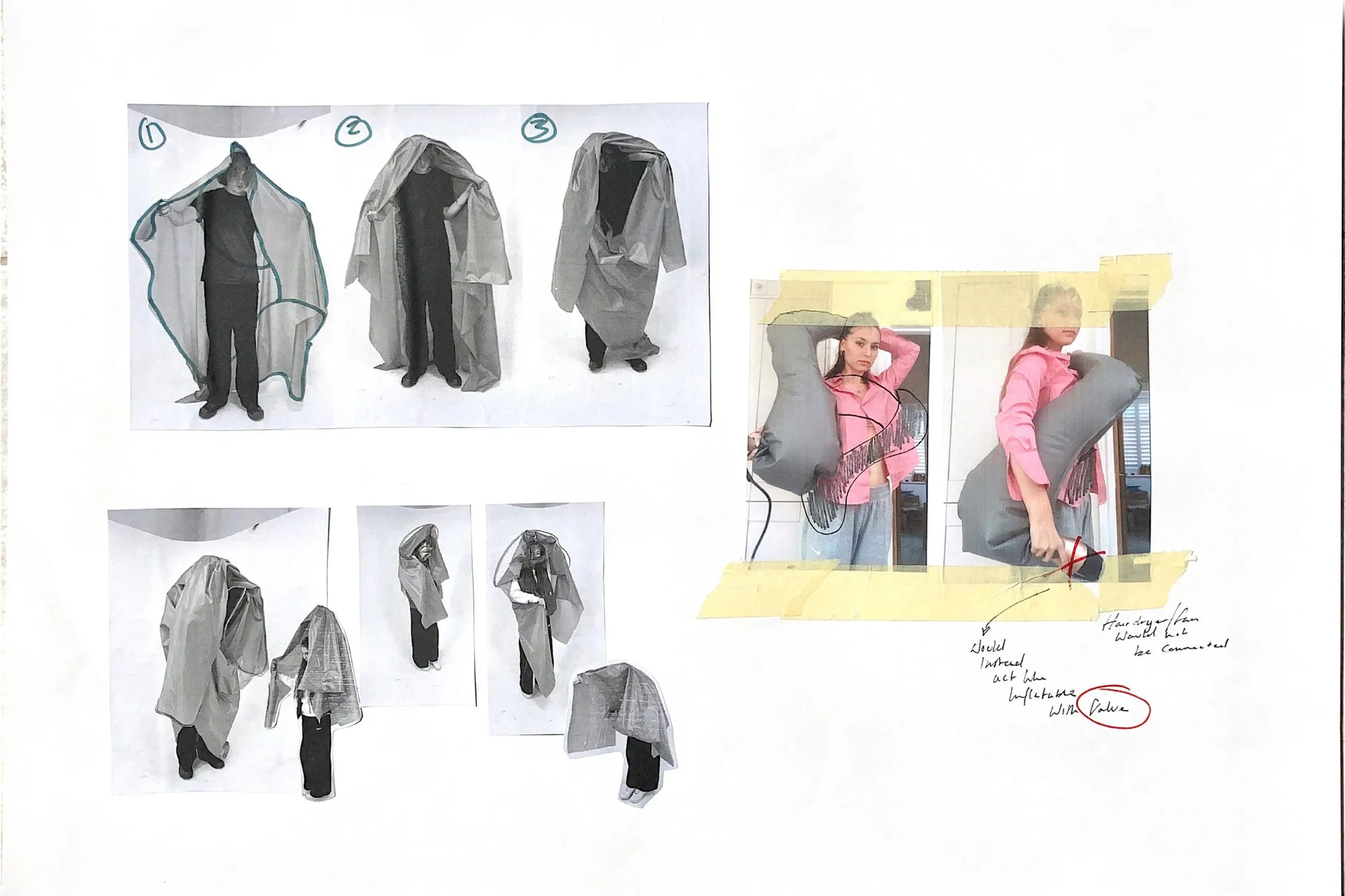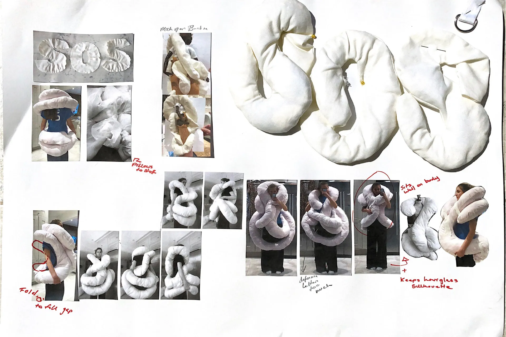 I started my project inspired by a reoccurring dream of being stranded. I looked into different scenarios and places that you could get stranded; in particular the sea. I find ‘gorp-core’ an amusing concept and explored this idea of dressing over practically in everyday life and thought about how that could be pushed to extremities by designing unrealistic forms for highly unlikely situations… or at least situations that it’s unlikely you’d be wearing these clothes for! My main garment consists of pink, ripstop nylon stuffed letter forms that untie from the the body and separate out to spell SOS, as well as performing like a life jacket.