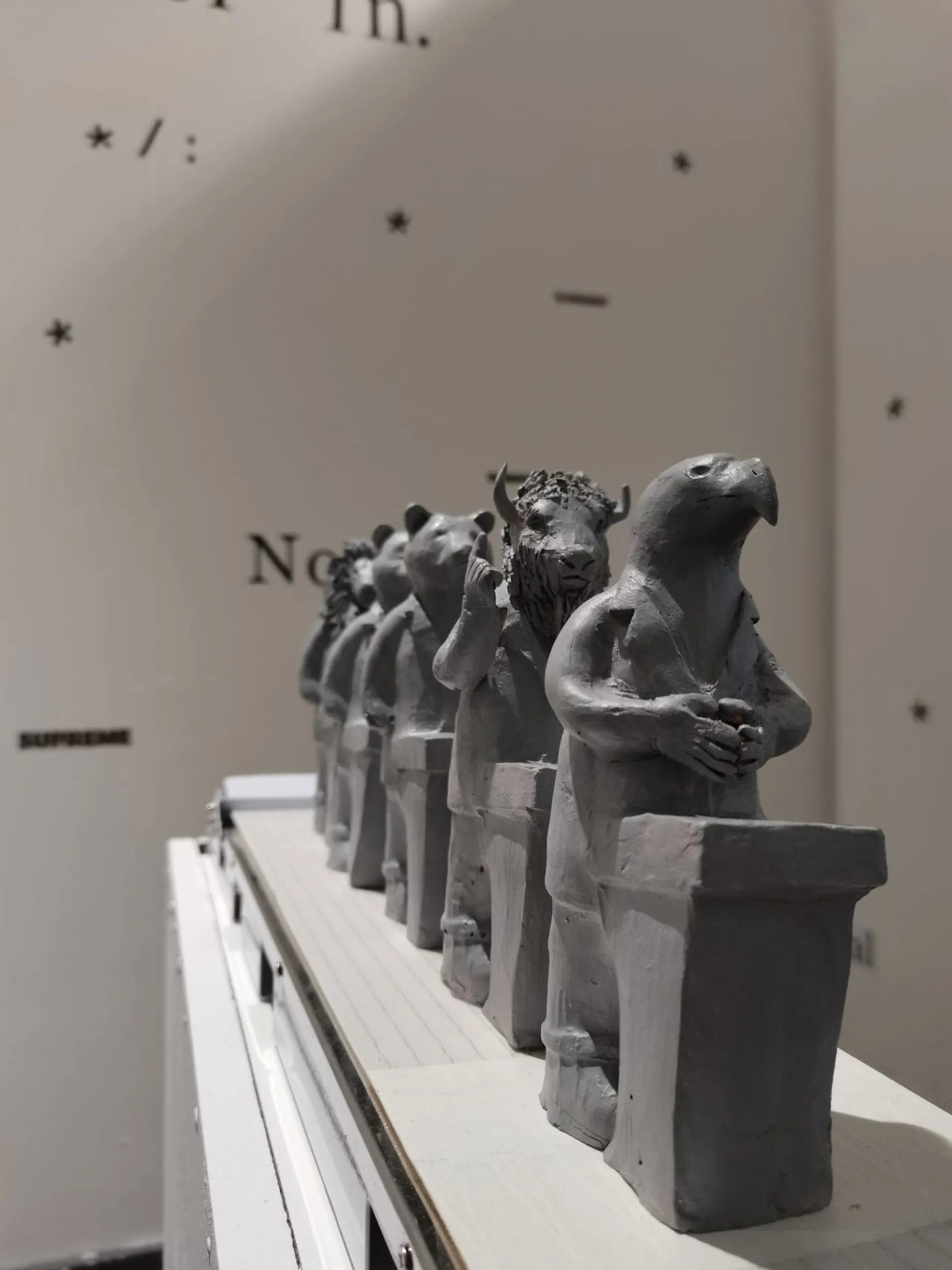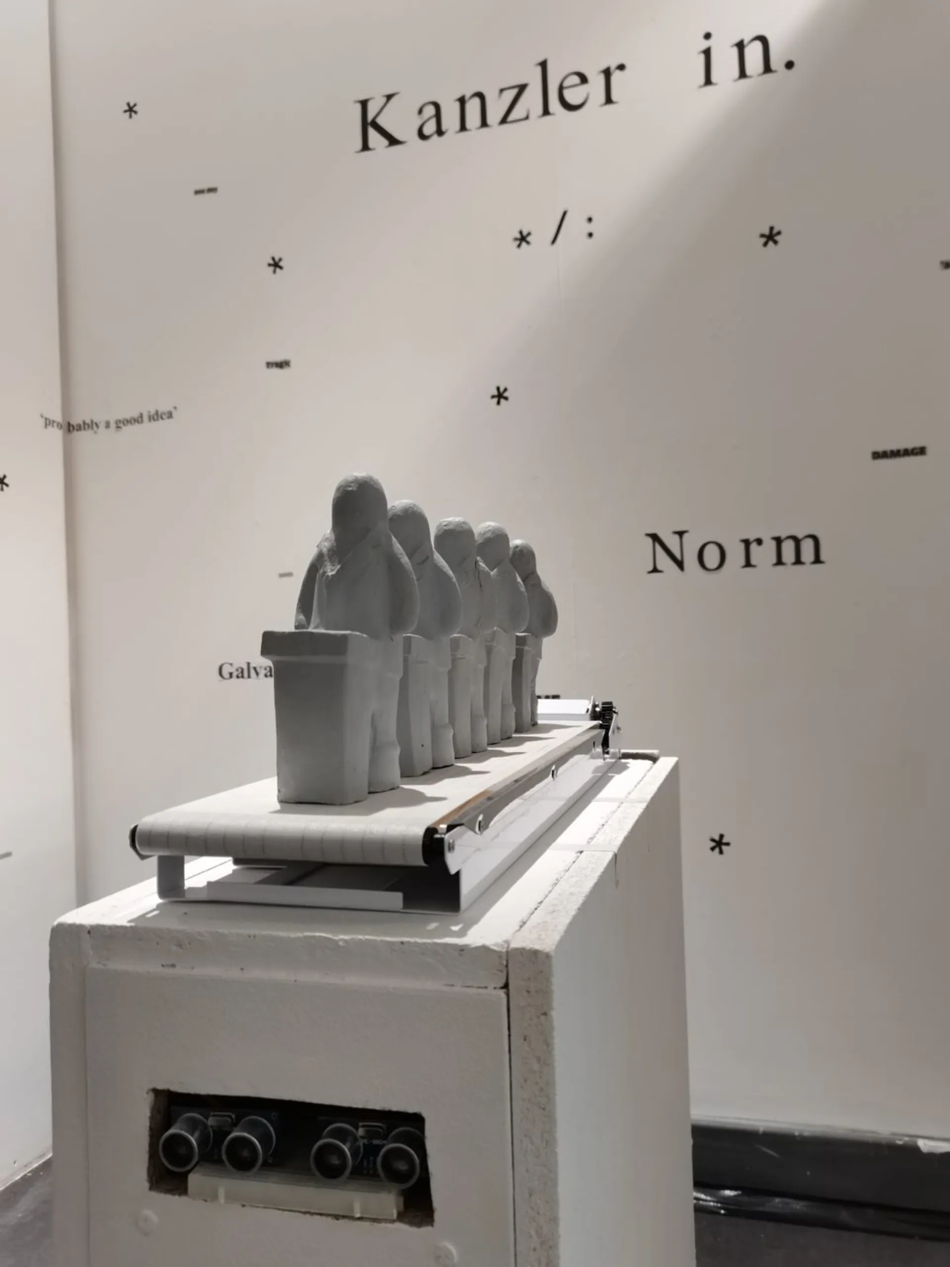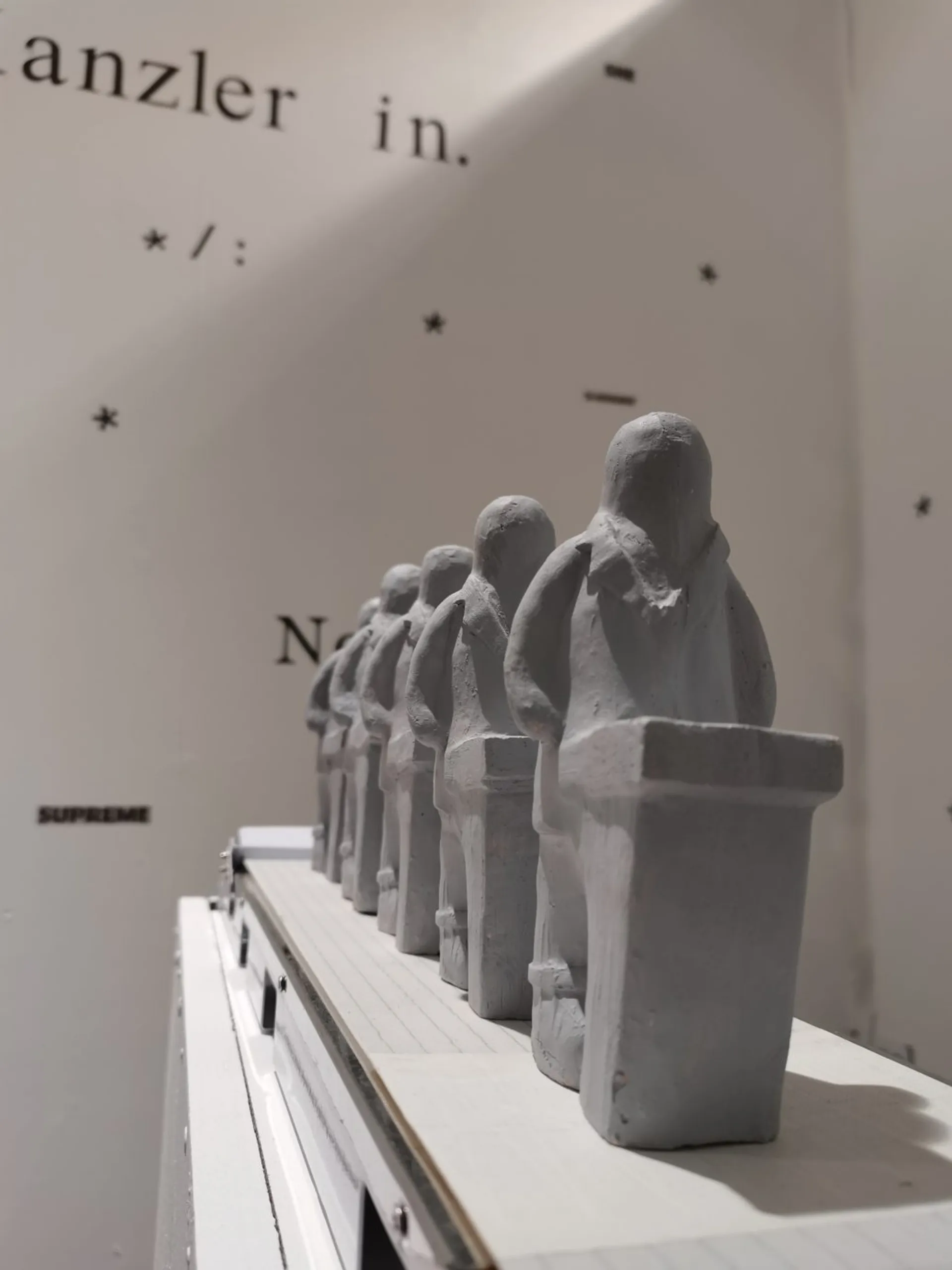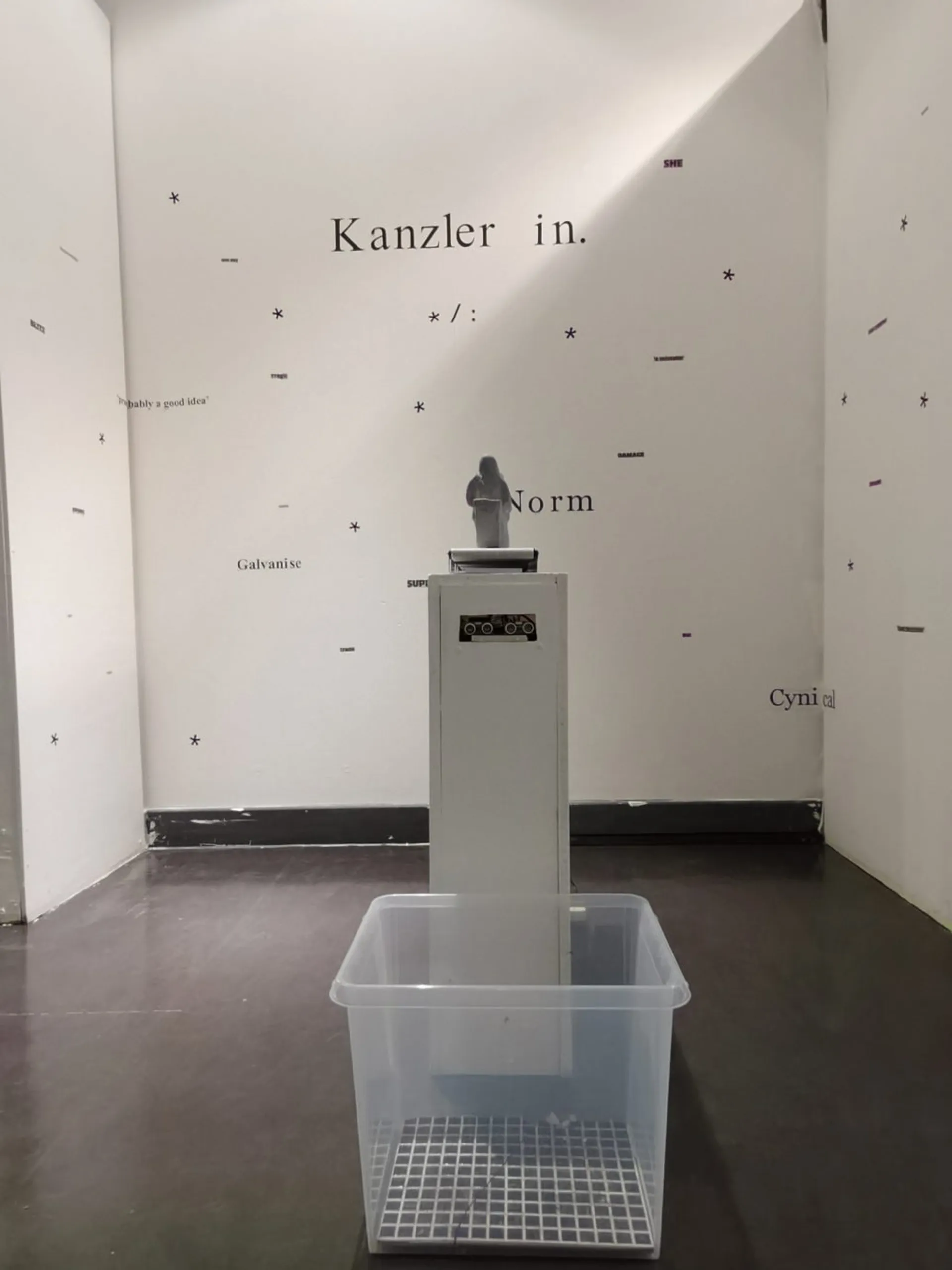 Individual Power is an electronic installation in which a conveyor belt triggered by movements transports ceramic politicians until they fall and break. The chancellor election in Germany in September 2021 sparked my interest in the connections between contemporary politics and language. The election brought up how the German language mainly addresses the male gender. Print and Social media tried to make the language more inclusive of the female gender by splitting the noun with one of the following symbols */: and adding the female ending. Even without the government announcing an official way, many major journals and media continue to use both female and male endings. ‘Kanzler in’ printed on the wall behind the conveyor belt is the female word for chancellor. Individual Power explores the language individuals and media use regarding politics and politicians. Some of the terms used in newspapers and interviews can be seen on the wall. They include words like ‘norm, cynical, tragic, and threats. These words are chosen to show the moral numbness and cognitive overload every individual faces in the twenty-first century. Terms with a negative connotation are used, trying to gain attention with the most dramatic phrasing. There is not enough capacity to process the overload of information critically. In the last few years, newspapers and news have been filled with negative news, which influences the individual reader; it can lead to anger or hopelessness. This shows when one looks at the language used to address politics or politicians. This installation tries to open a discussion around the power of the individual by empowering the viewer to activate the conveyor belt intentionally or unintentionally. To conclude, this installation emphasises the immense effect of words and that language has to be used with care, which does not mean there can be no changes made. Furthermore, the installation opens room for discussing the power every individual holds and how it can be used nowadays.