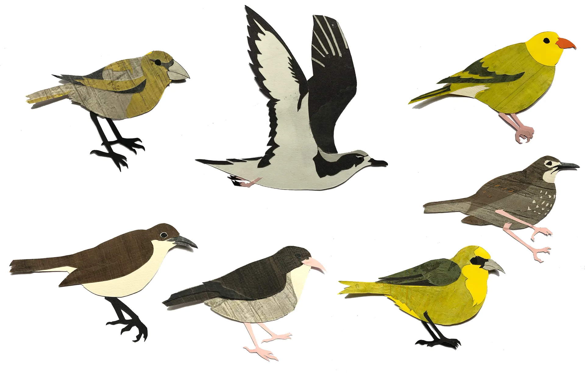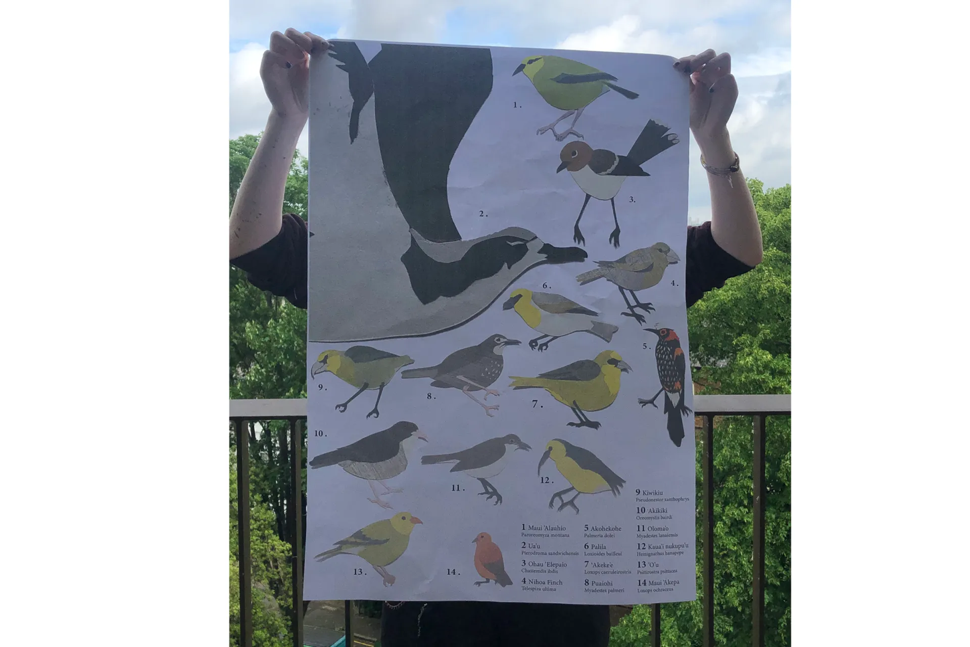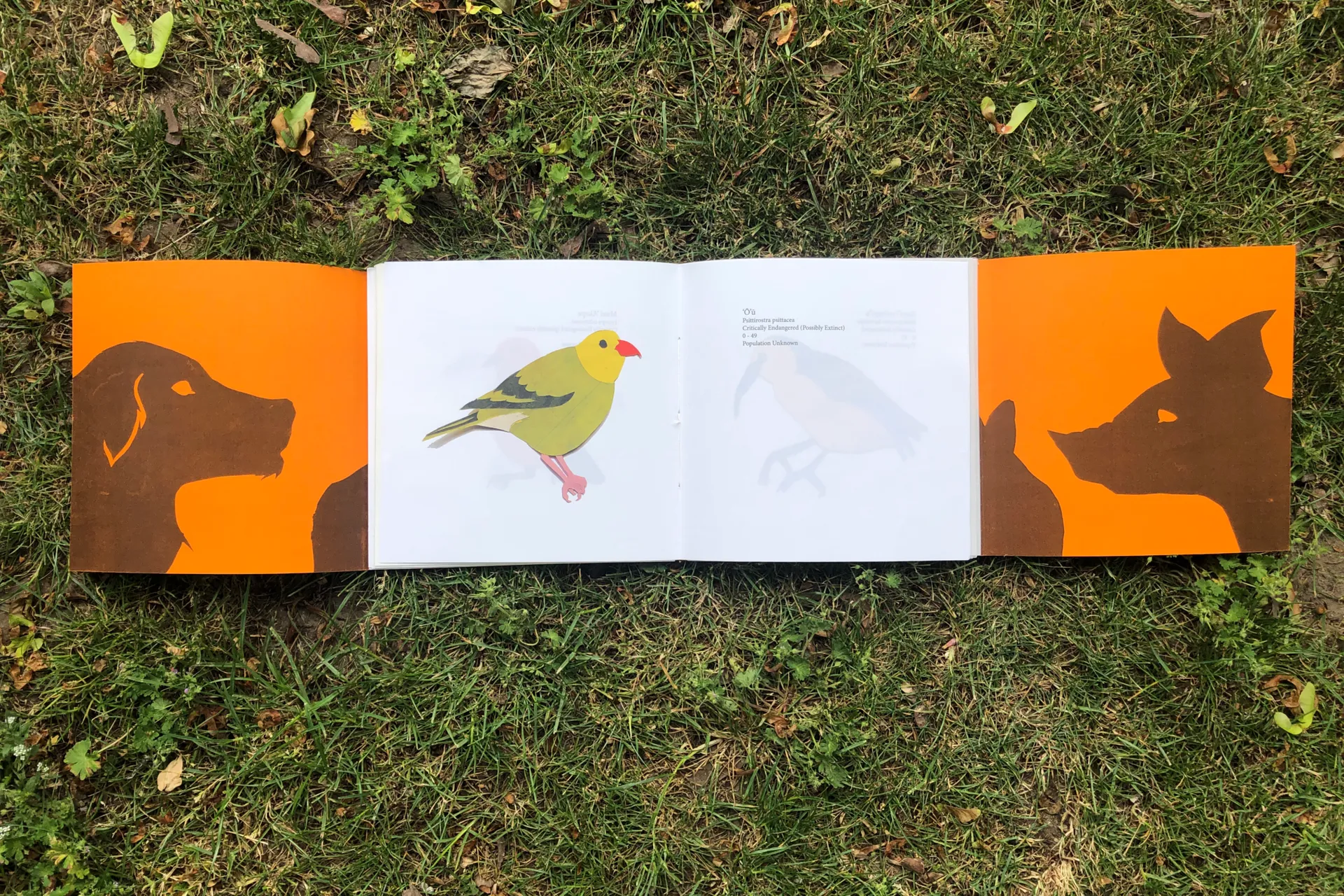 My project “Invasives and Accidentals” focussed on Invasive species, initially in my research I looked mostly at the Ring-Necked Parakeet and their Presence in the uk. However I later decided to pivot the subject matter of my work and emphasize the native species that are affected by the presence of invasive ones. This led me to the islands of Hawai’i, whose ecosystem and nature have been impacted severely negatively by the presence on invasive species. My two final pieces are about the native birds of Hawai’i who are now extinct, endangered, critically endangered or assumed extinct. The pages of my book get progressively thinner and more see-through as the birds listed get closer and closer to the point of extinction until the last 28 pages, all of which are thin and see through and represent the 28 species driven to extinction. In my poster the species shown become less visible going down the page as the birds approach extinction. I chose to create all my illustrations using papercut/ collage, which I think suited the project well, as it allowed me to simplify my images while still having the needed level of detail to ensure the birds are highly recognisable.