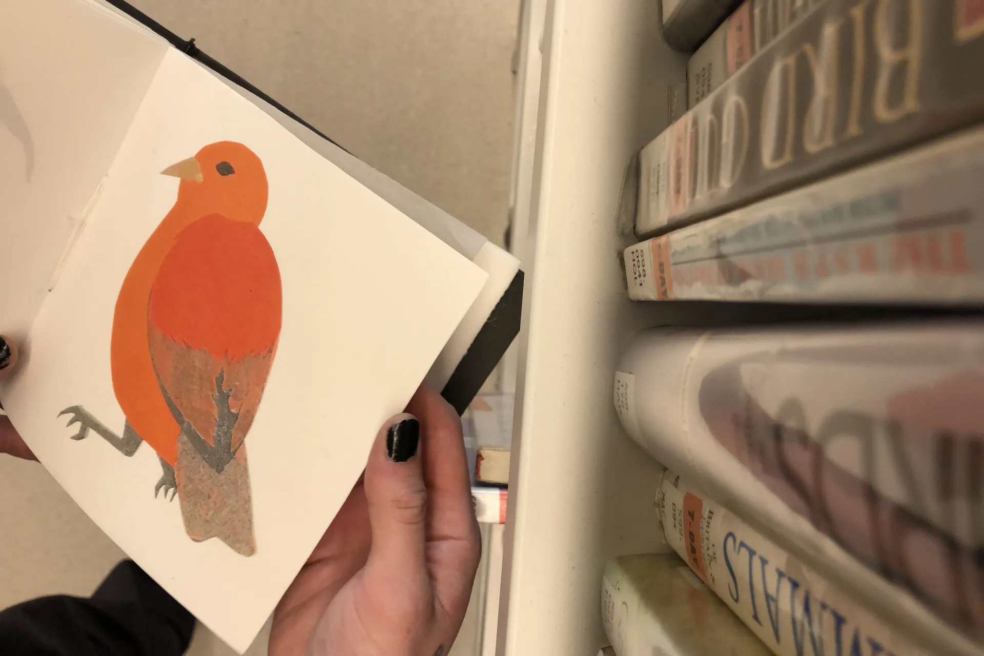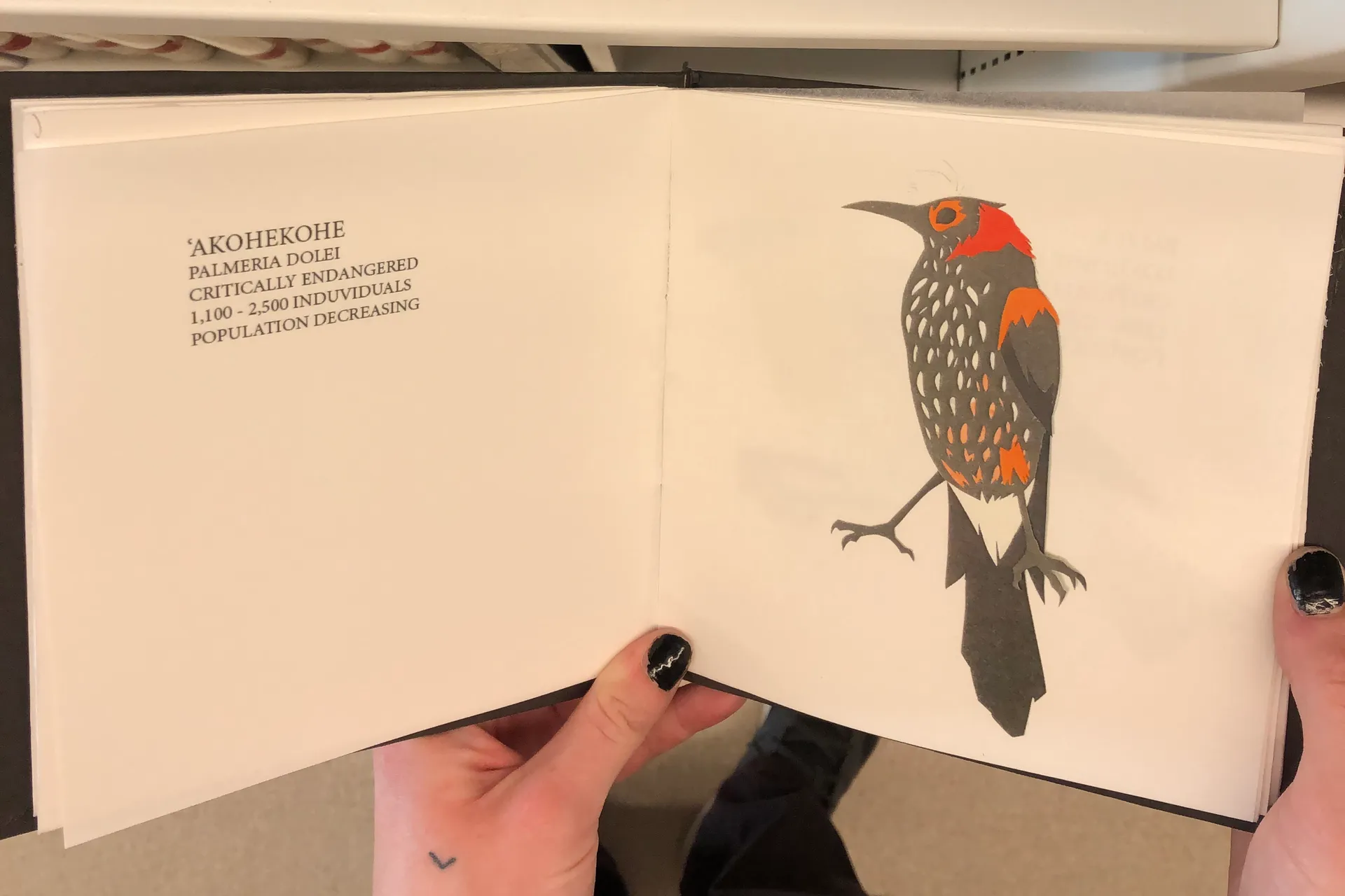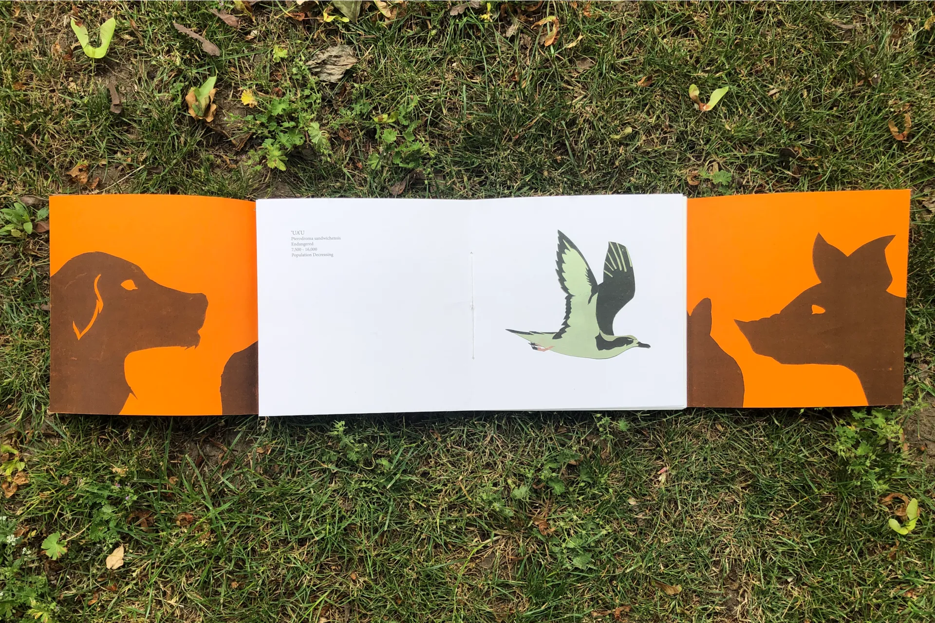 My project “Invasives and Accidentals” focussed on Invasive species, initially in my research I looked mostly at the Ring-Necked Parakeet and their Presence in the uk. However I later decided to pivot the subject matter of my work and emphasize the native species that are affected by the presence of invasive ones. This led me to the islands of Hawai’i, whose ecosystem and nature have been impacted severely negatively by the presence on invasive species. My two final pieces are about the native birds of Hawai’i who are now extinct, endangered, critically endangered or assumed extinct. The pages of my book get progressively thinner and more see-through as the birds listed get closer and closer to the point of extinction until the last 28 pages, all of which are thin and see through and represent the 28 species driven to extinction. In my poster the species shown become less visible going down the page as the birds approach extinction. I chose to create all my illustrations using papercut/ collage, which I think suited the project well, as it allowed me to simplify my images while still having the needed level of detail to ensure the birds are highly recognisable.