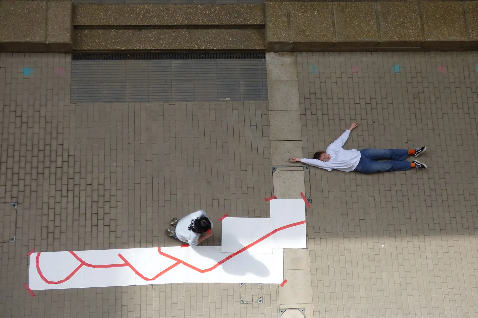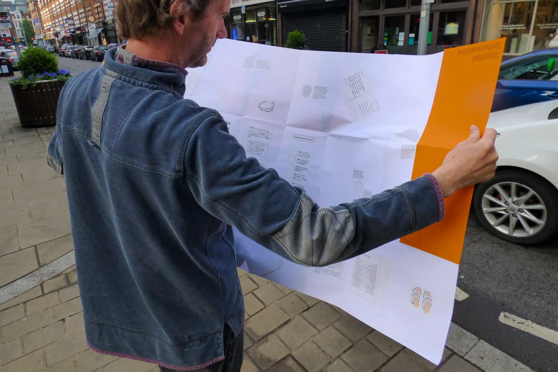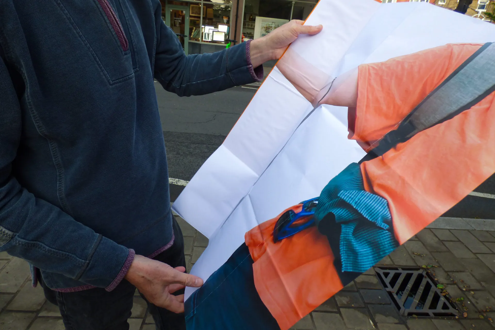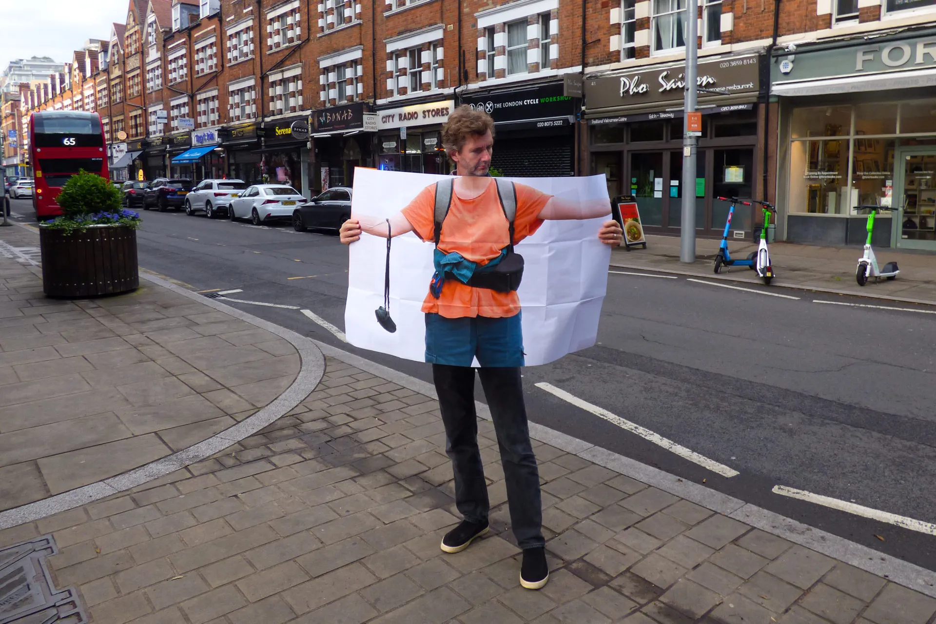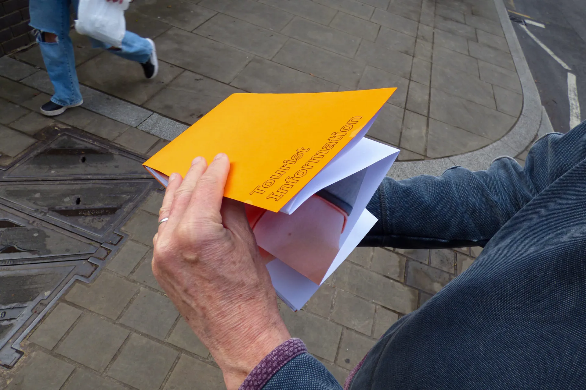 For my final outcome I wanted to represent both the active and performative element of touristing, but also its reductive nature. The best way to communicate this was through a double-sided folding A0 map. On one side I printed the image of a tourist’s torso. When the sheet of paper was held like a map, the image mapped onto the viewers body, meaning that, from the outside, they were transformed into a tourist. On the other side I added graphics and language from the tourist formats I had explored, showing this process of reduction.