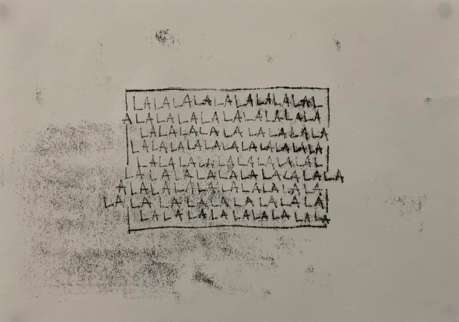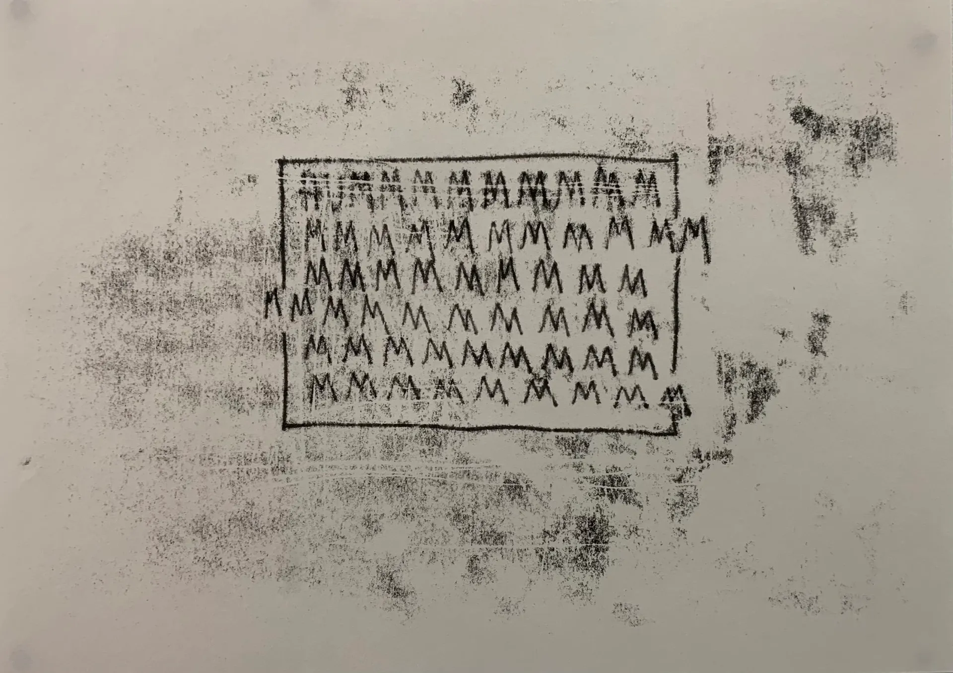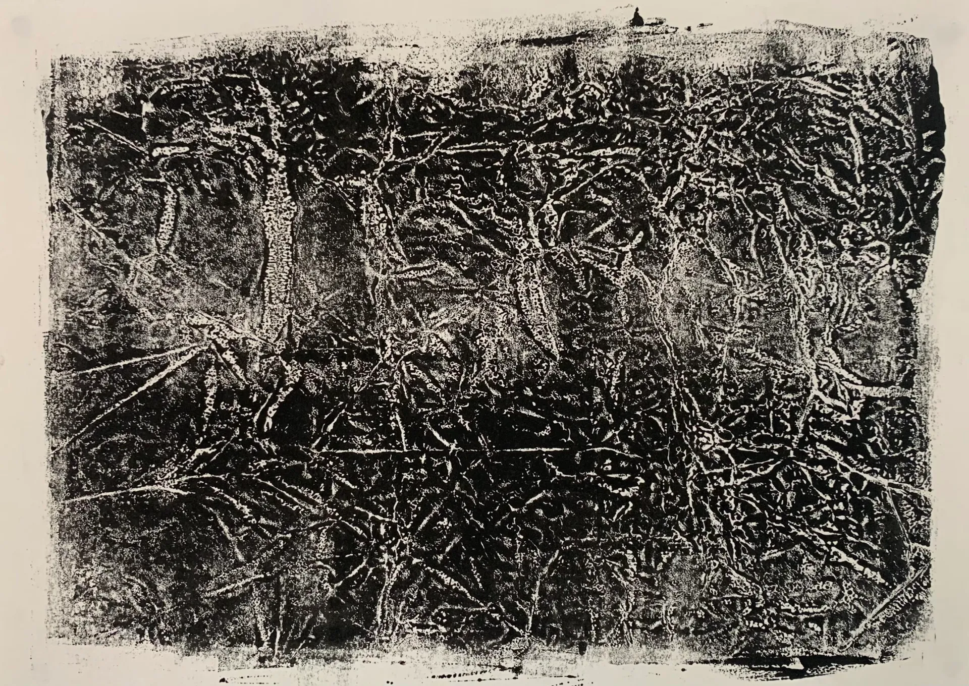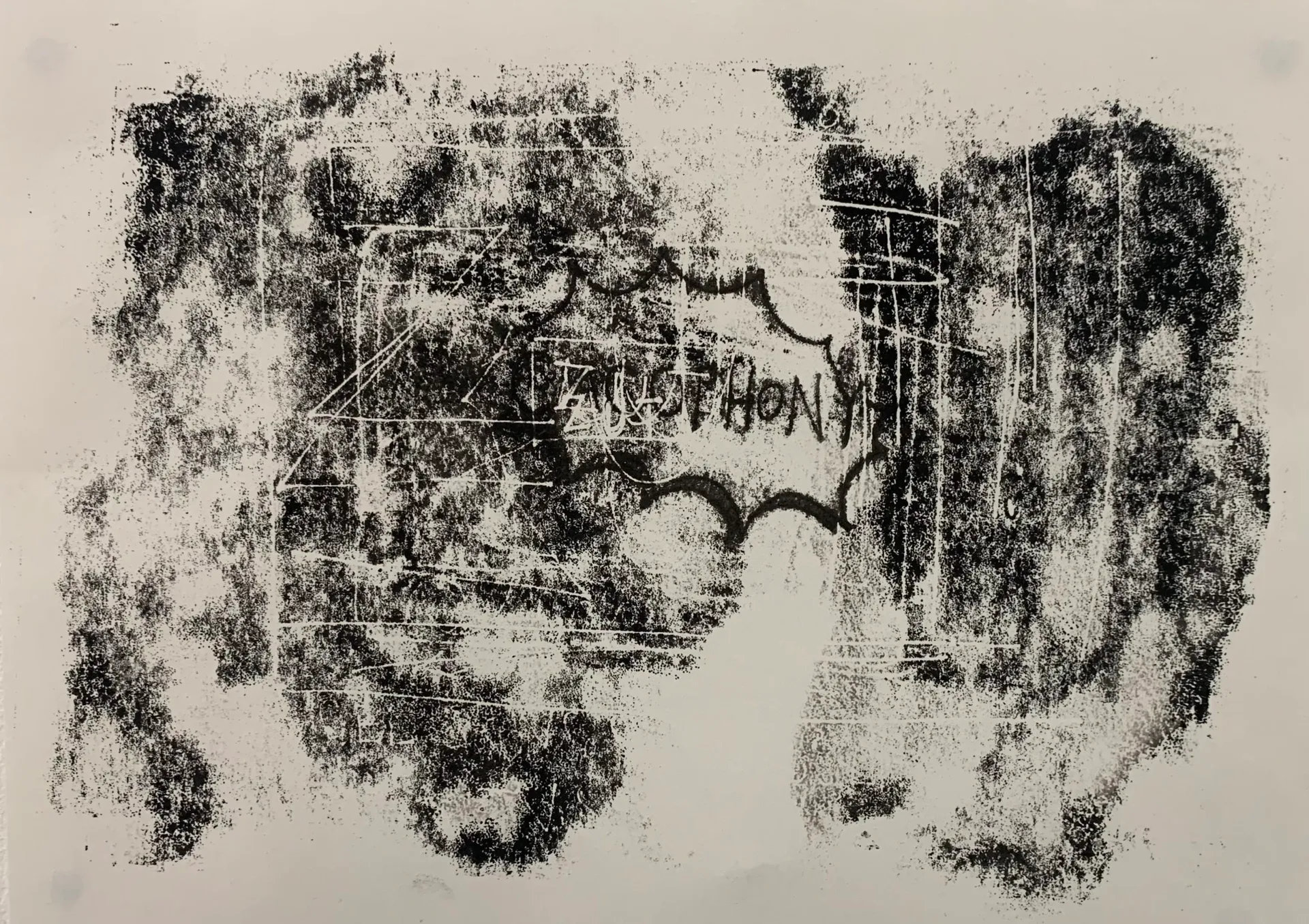 The work comes together from a process of research and amassing of information before it is transcribed into monoprint, and often in a spontaneous, mark-making way. This process is supported by a keen interest in language and etymology which is, yet again, conveyed confusingly.