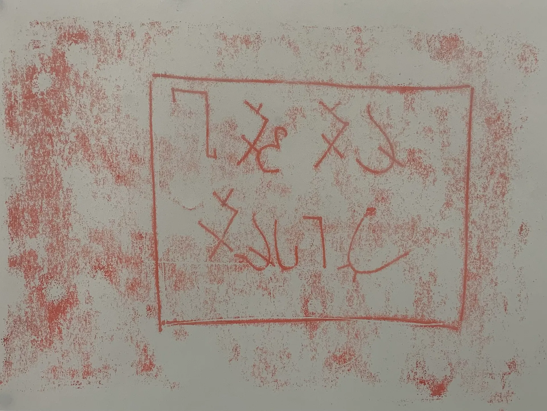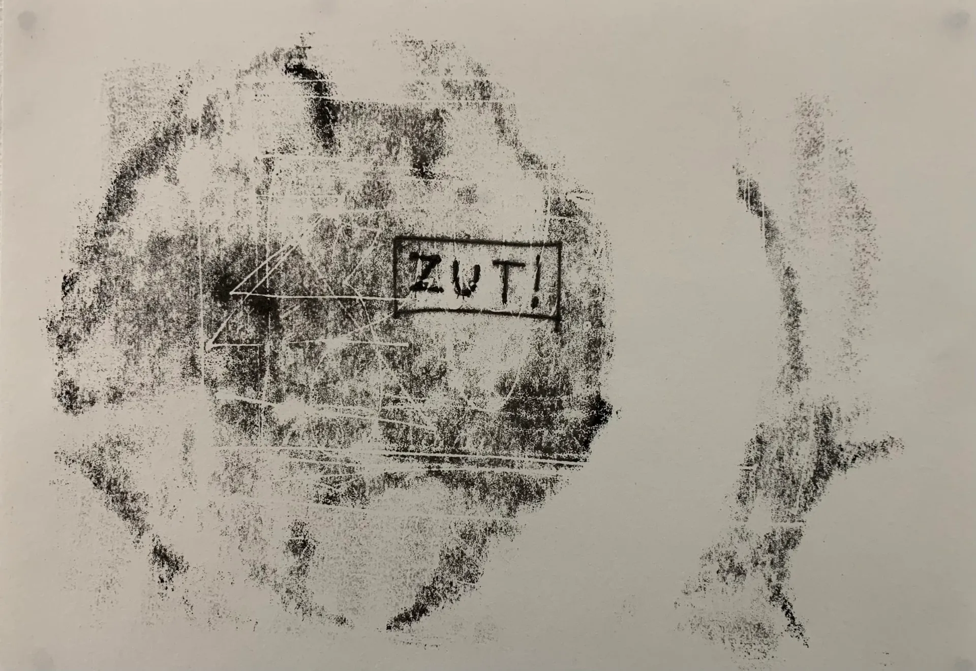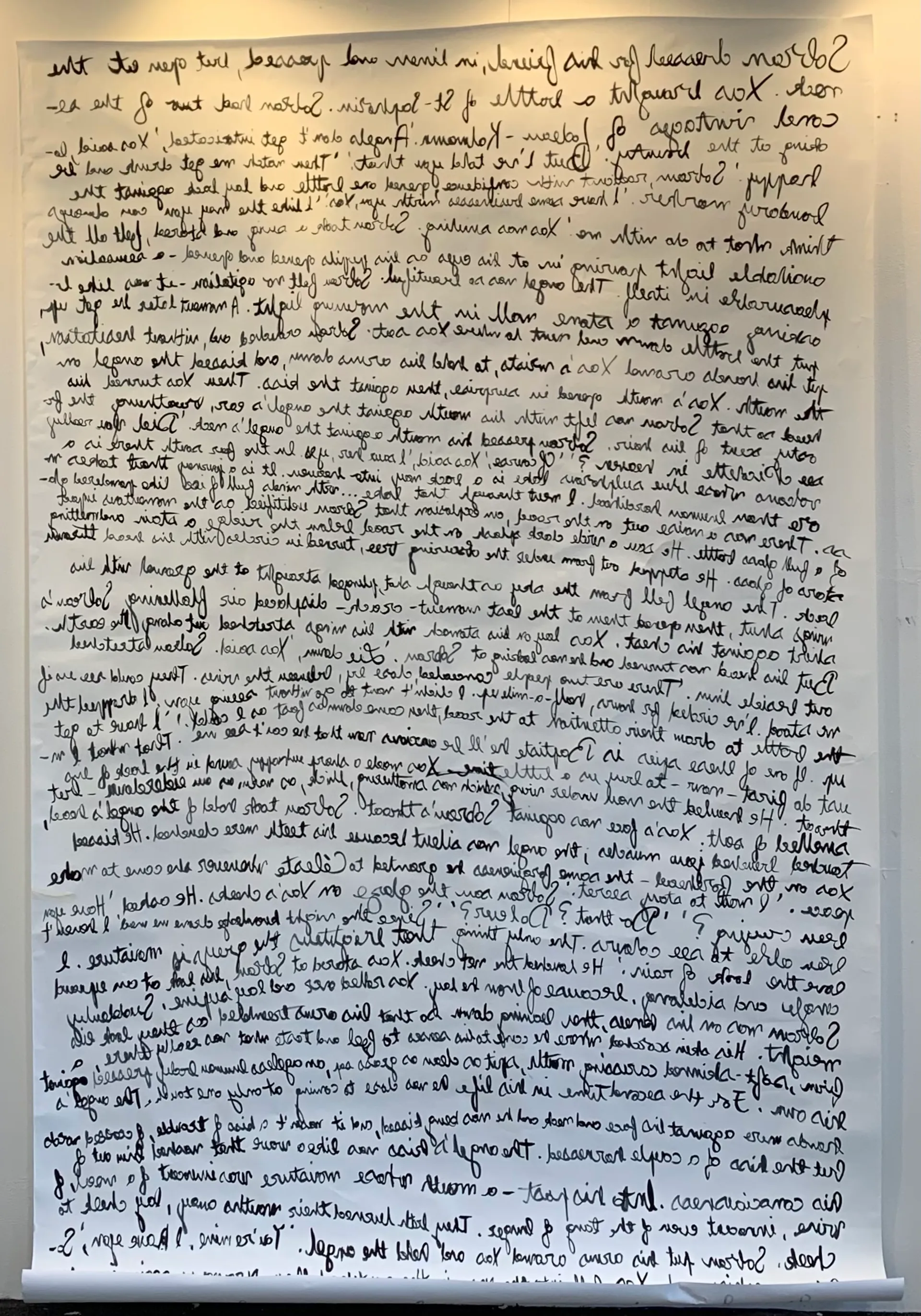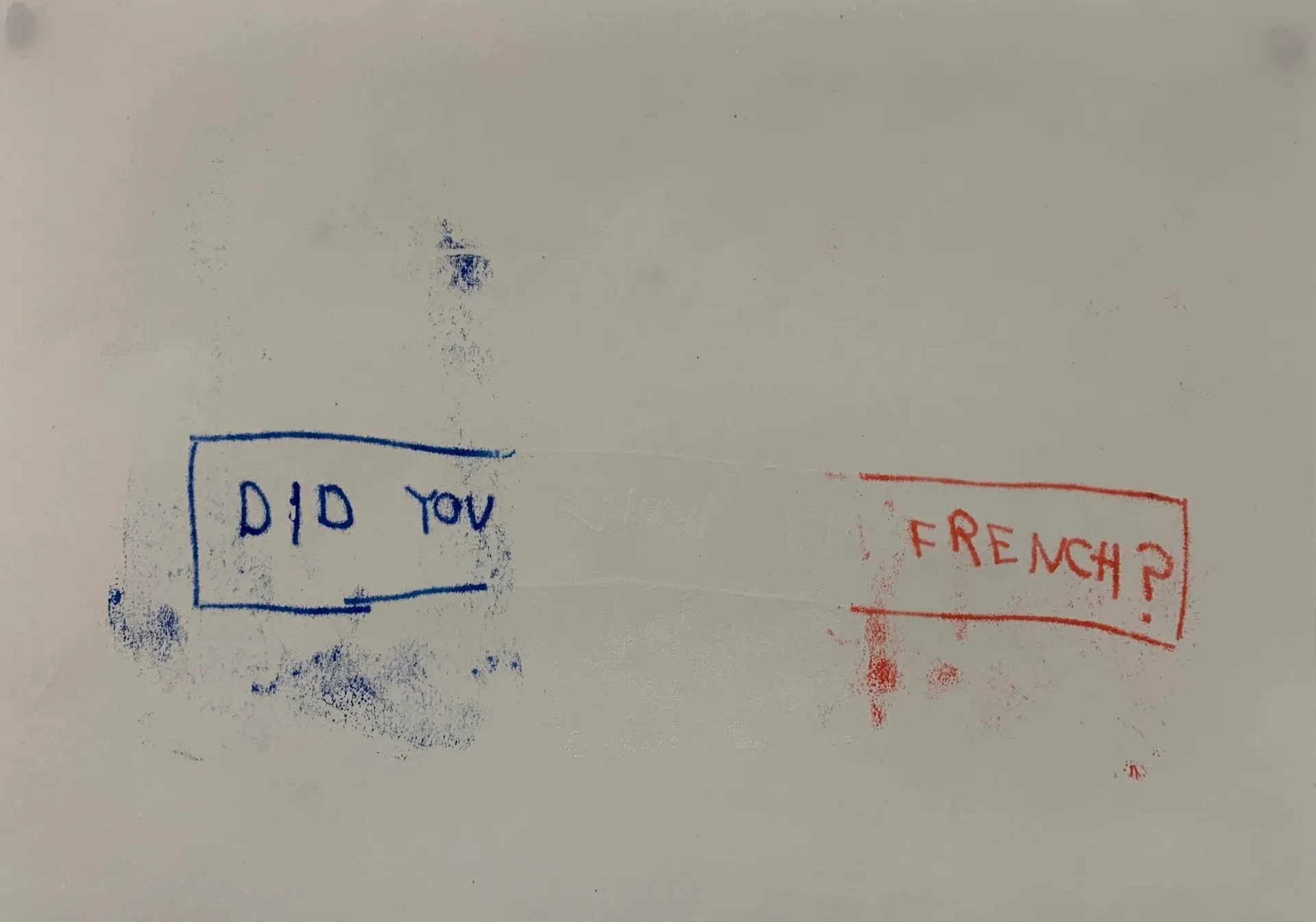 The work comes together from a process of research and amassing of information before it is transcribed into monoprint, and often in a spontaneous, mark-making way. This process is supported by a keen interest in language and etymology which is, yet again, conveyed confusingly.