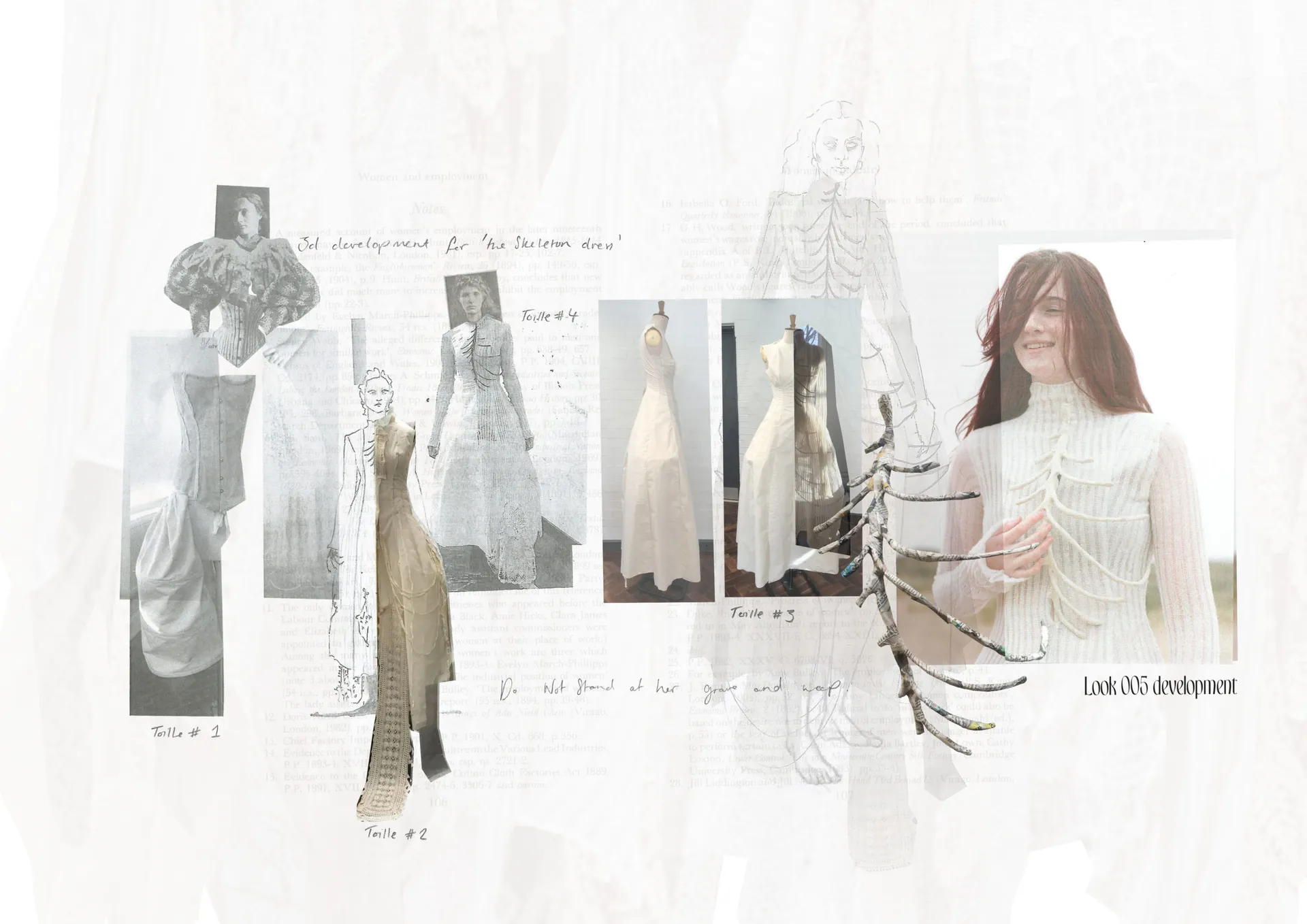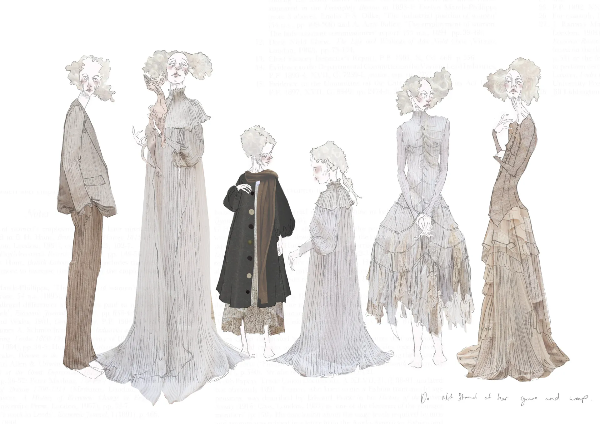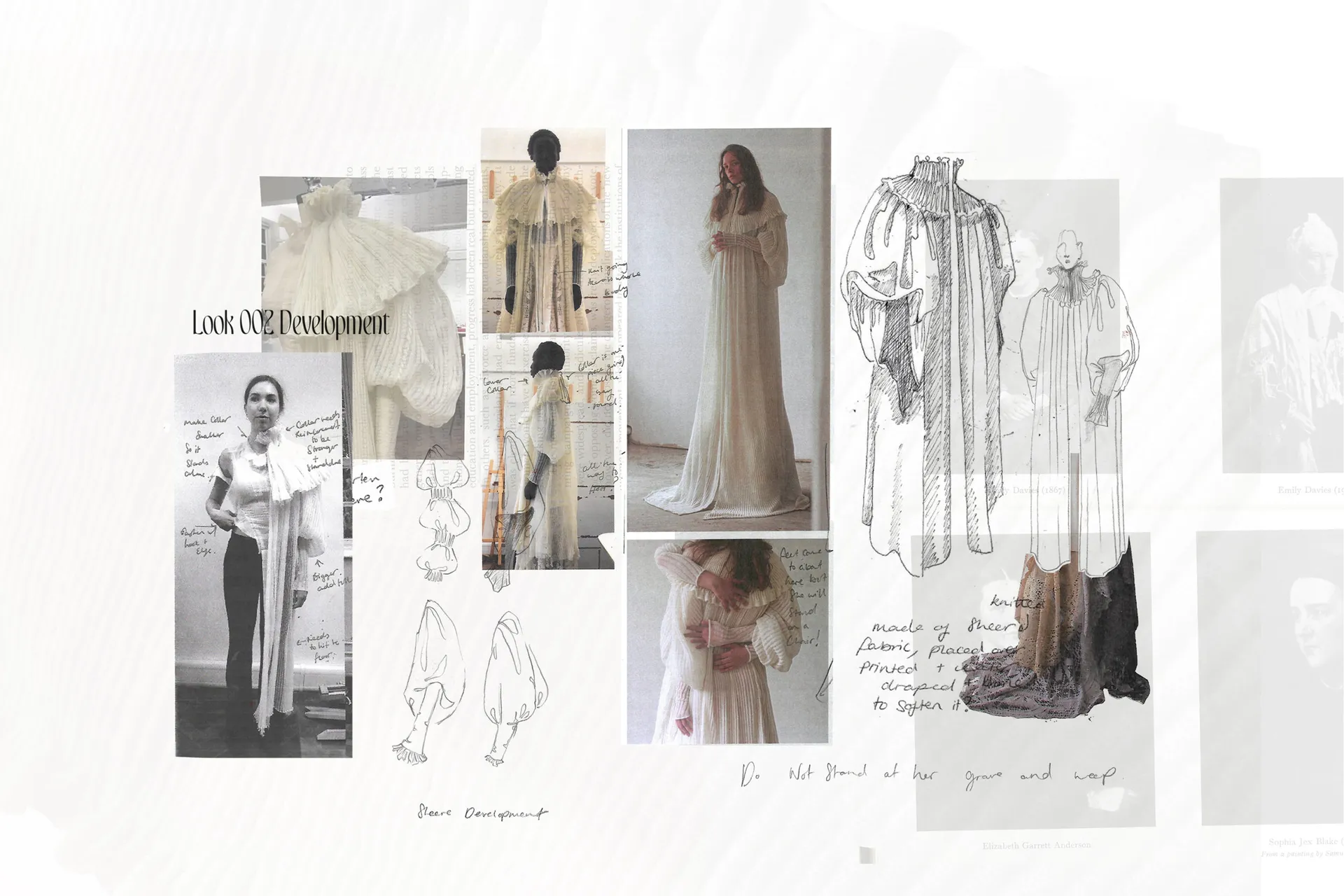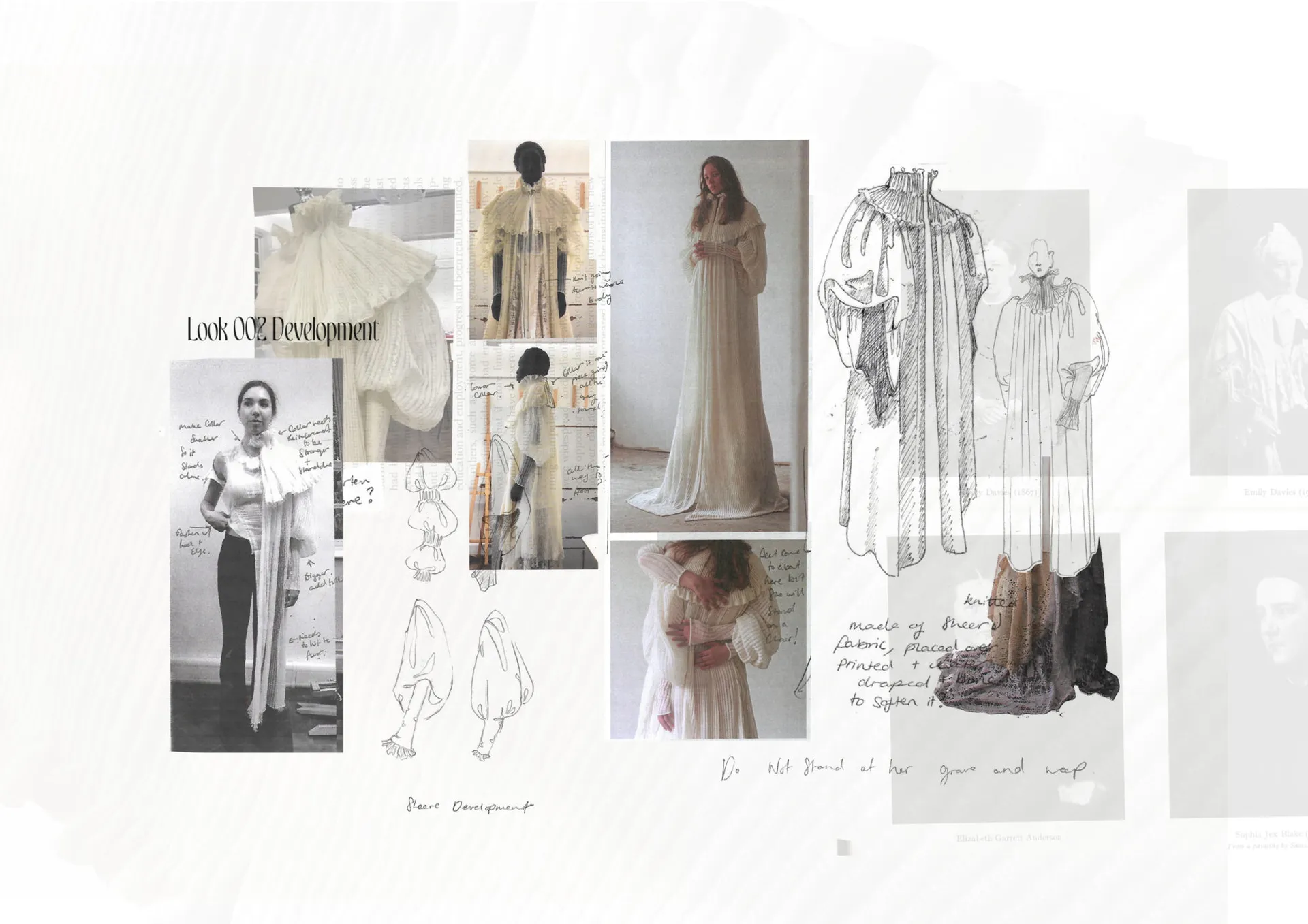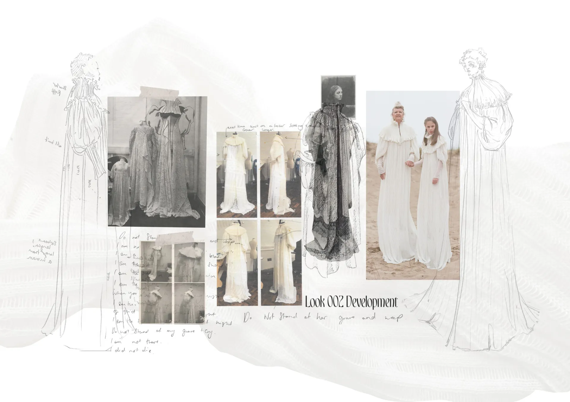 The female gaze is once again the protagonist in ‘Do not stand at her grave and weep.” A body of work that examines a matriarchal family, combined with the soft femininity and subversive beauty that holds presence in death. The collection explores the relationship between Grandmother, Mother and Daughter in the form of Film/TV-inspired costumes for a ’Victorian Ghost Family that lived and died on the South Coast of England’ – the unintentional tagline that has accompanied my designs since September.
