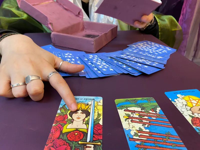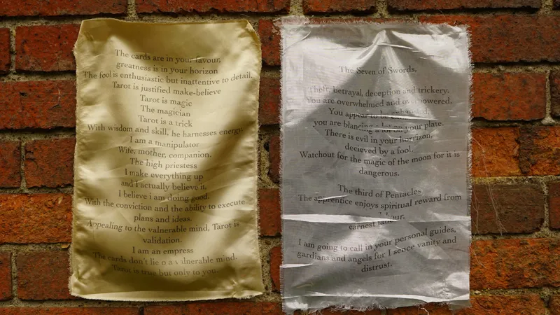 Tarot Readers table cloth, embroidery on organza and satin. An exploration of tarot reading.