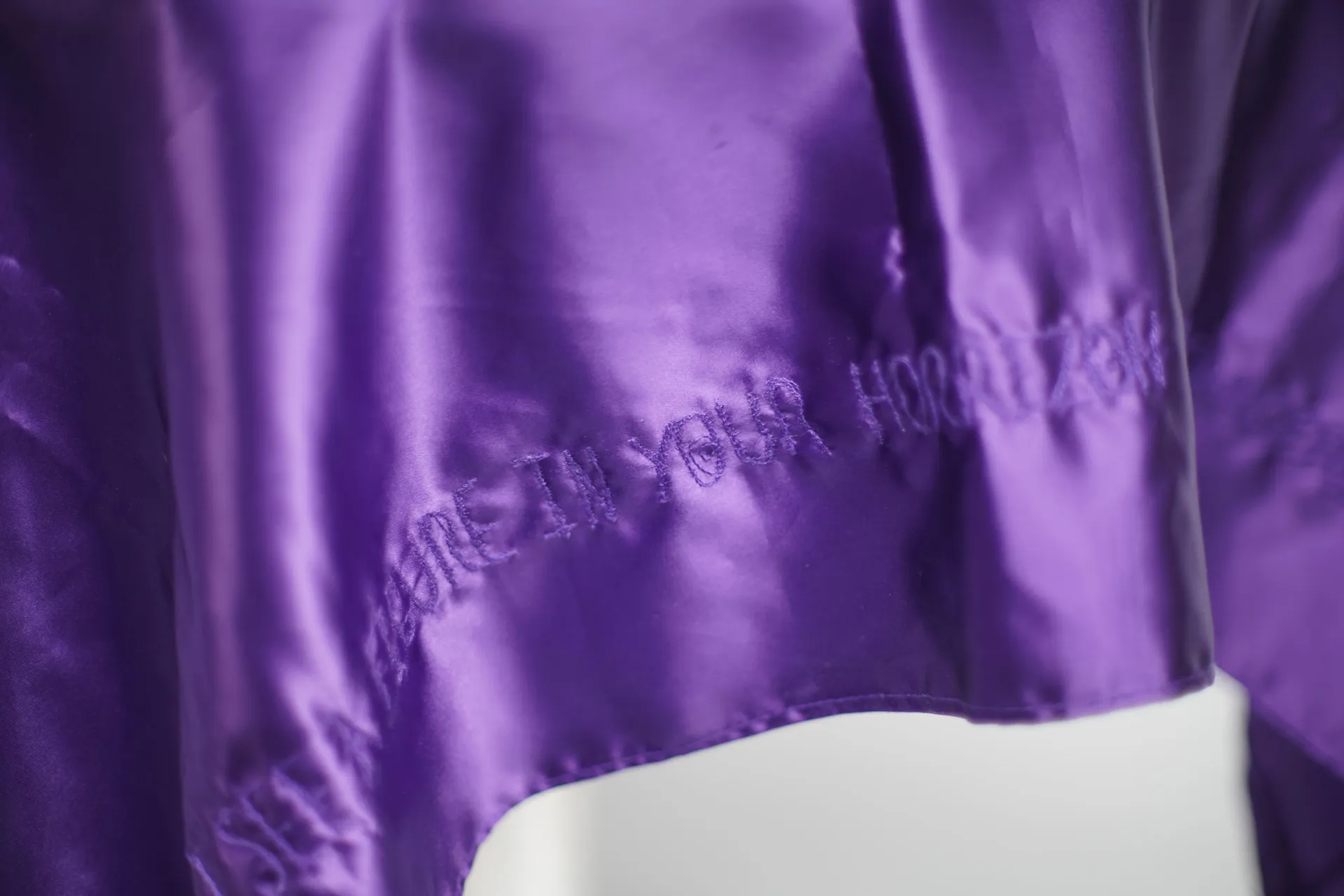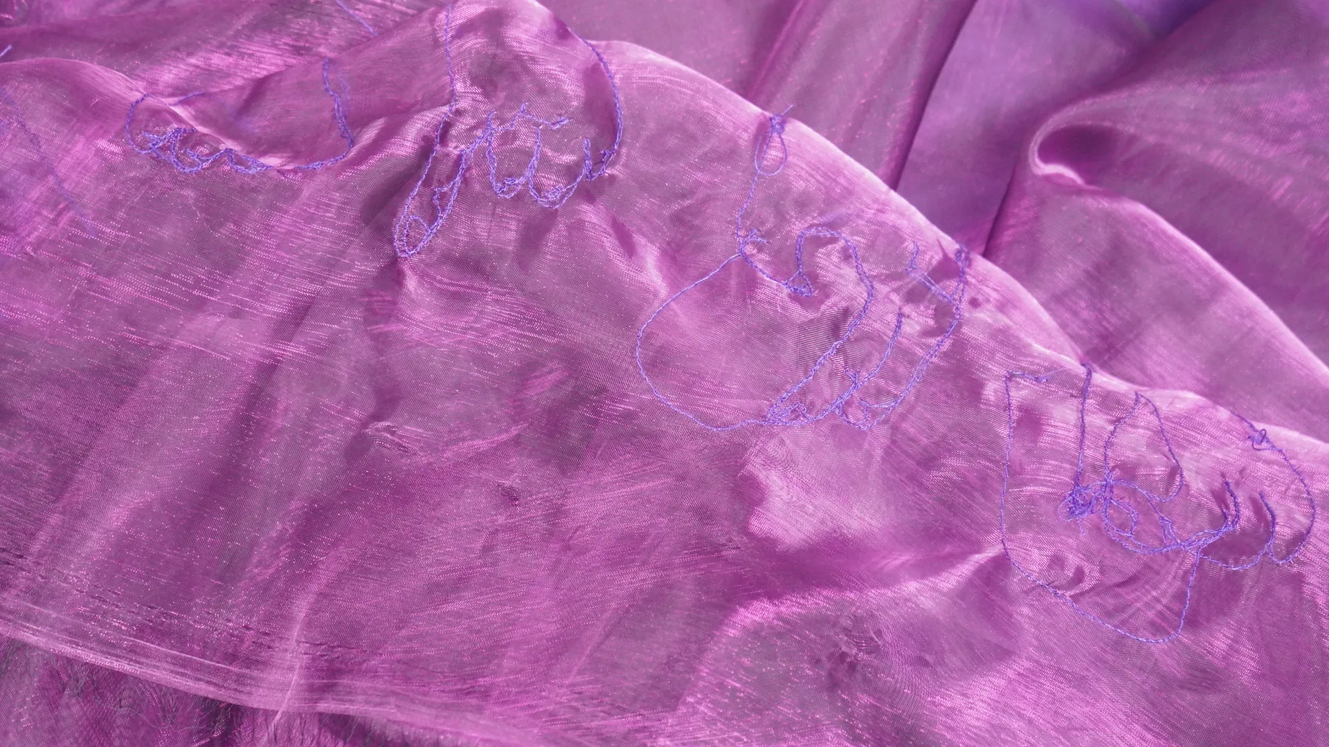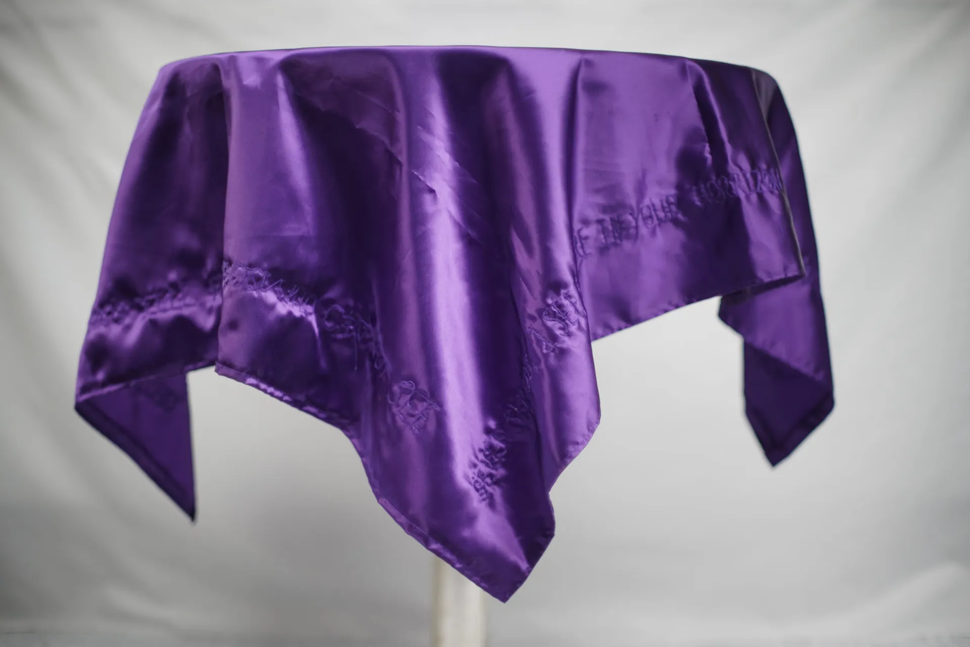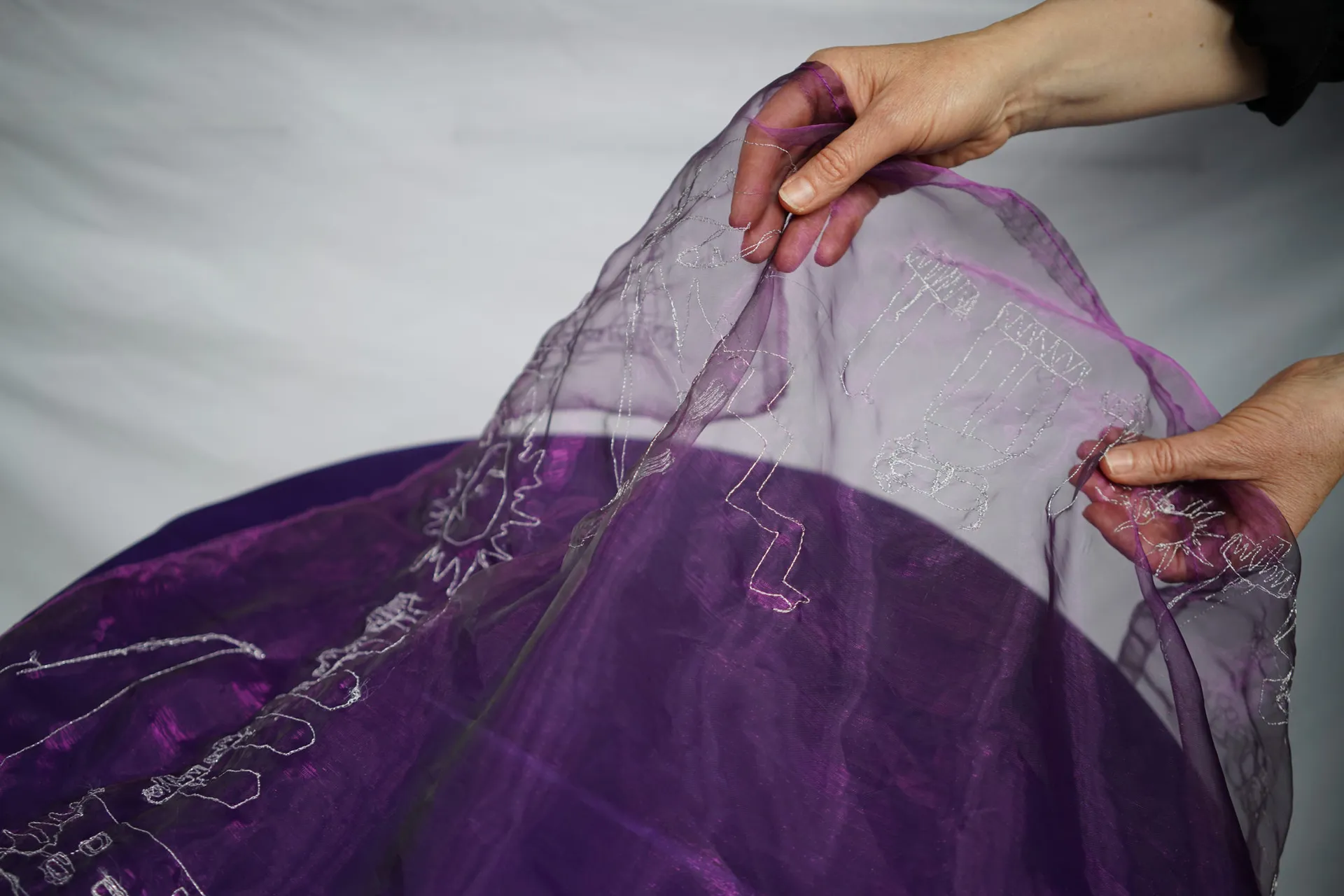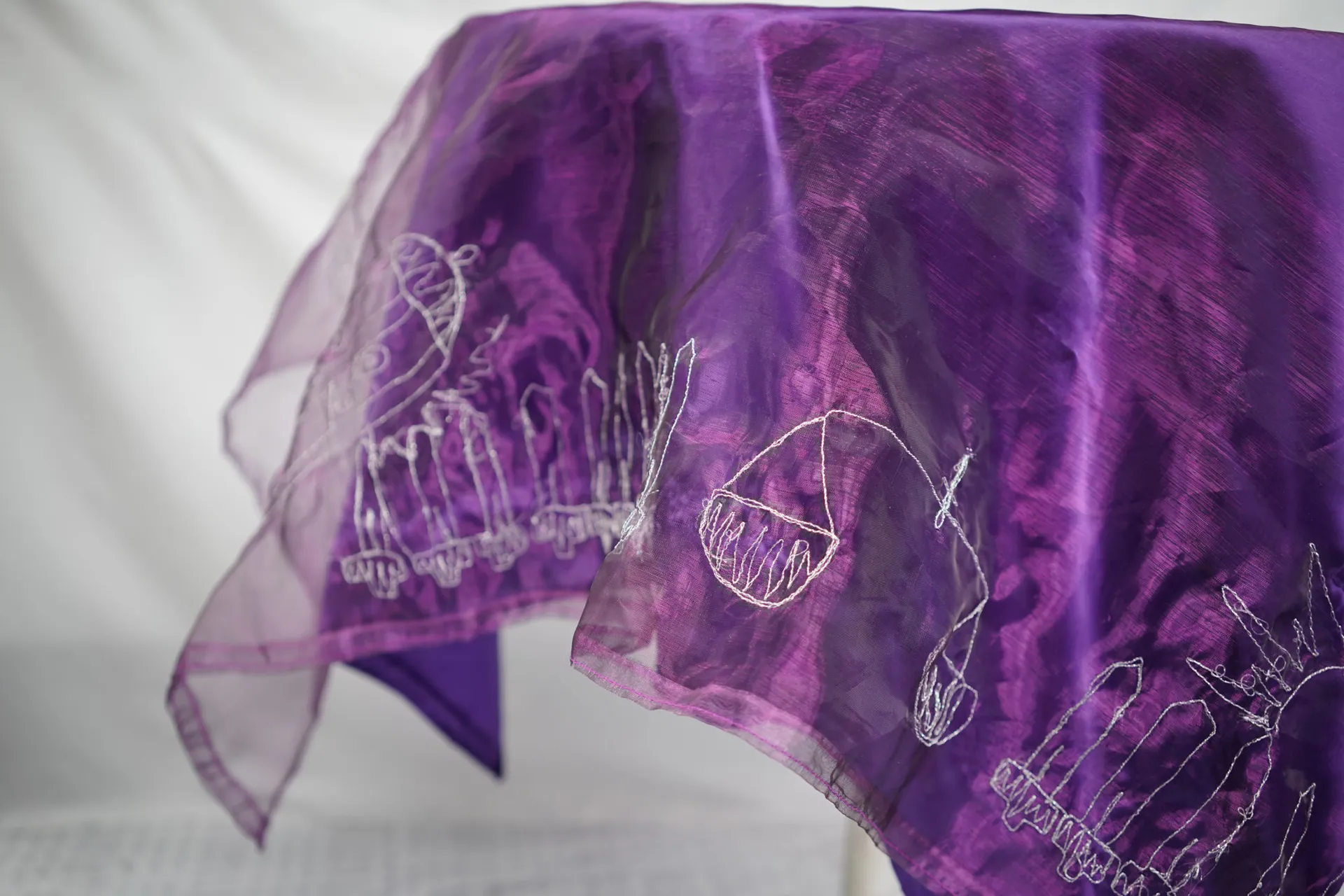 Tarot Readers table cloth, embroidery on organza and satin. An exploration of tarot reading.
