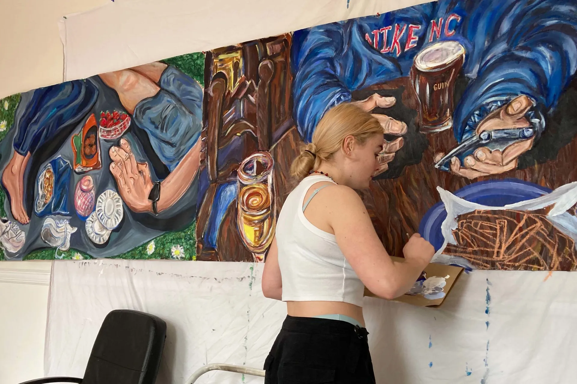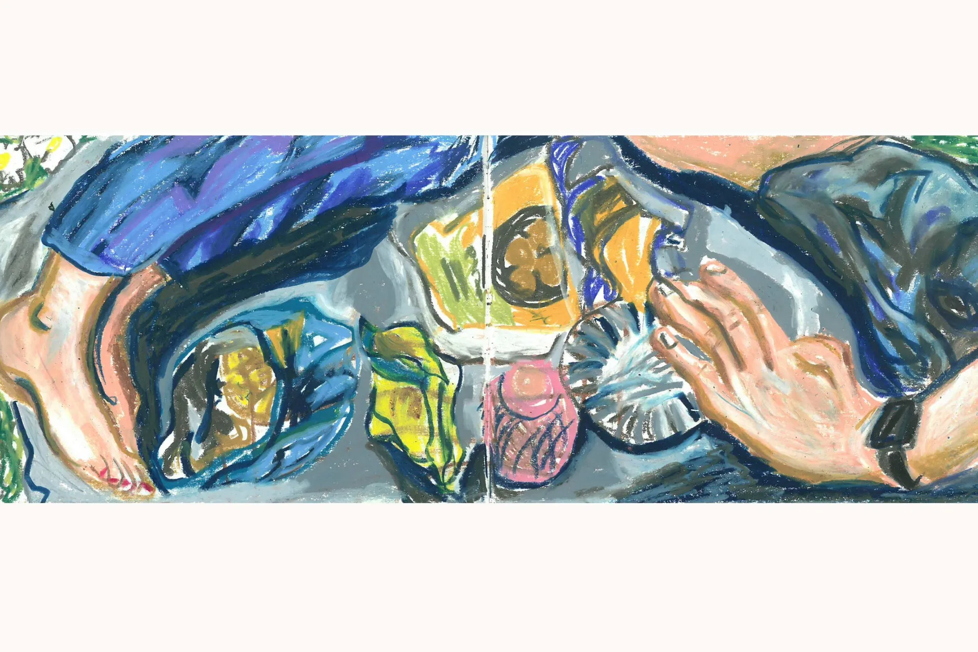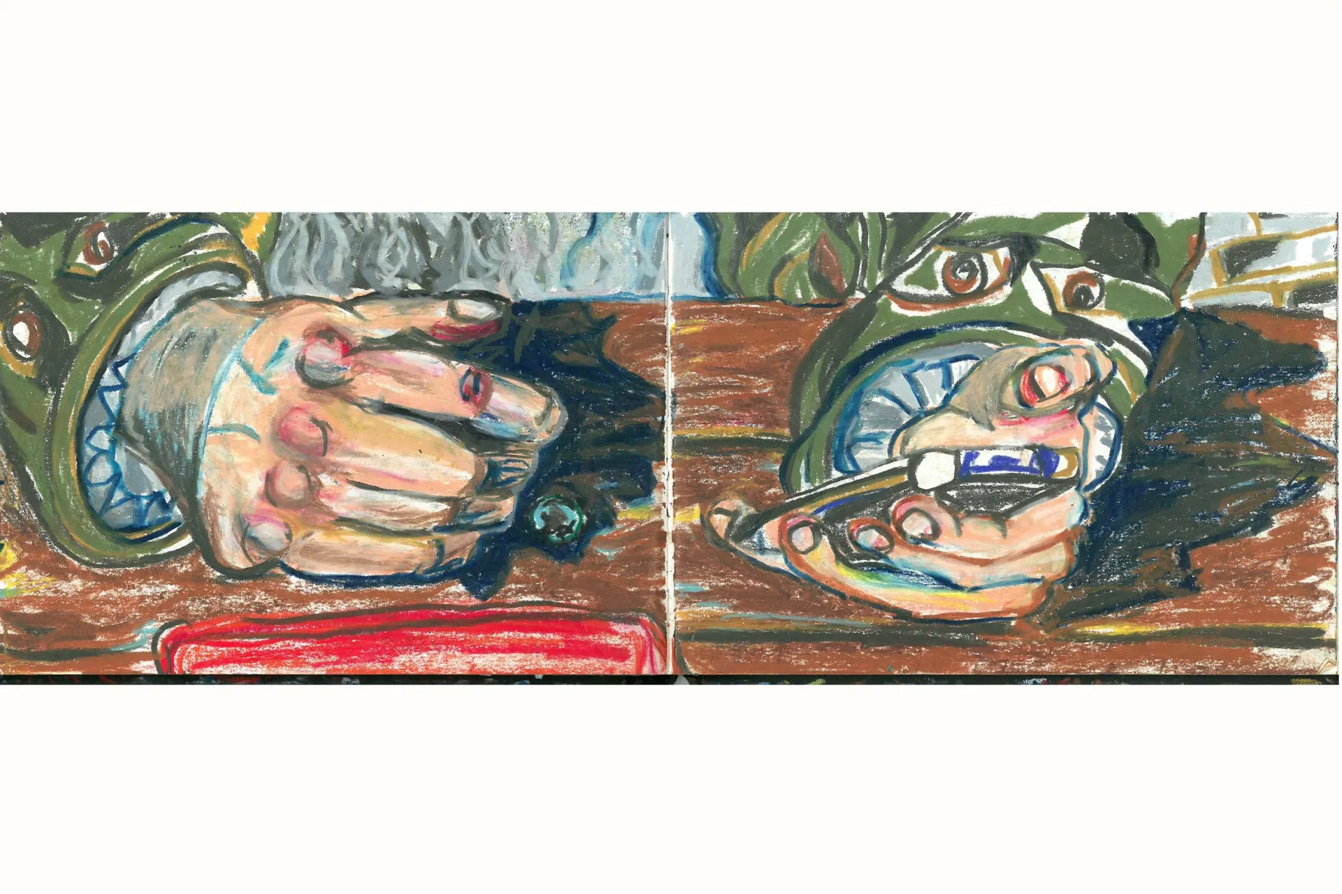 ‘Picnic’ is a reportage painting of my sister and brother in Regents Park. ‘Hands on the Table’ is a mixture of a drawing of a friend I drew texting, and drawing of a friend in a pub .