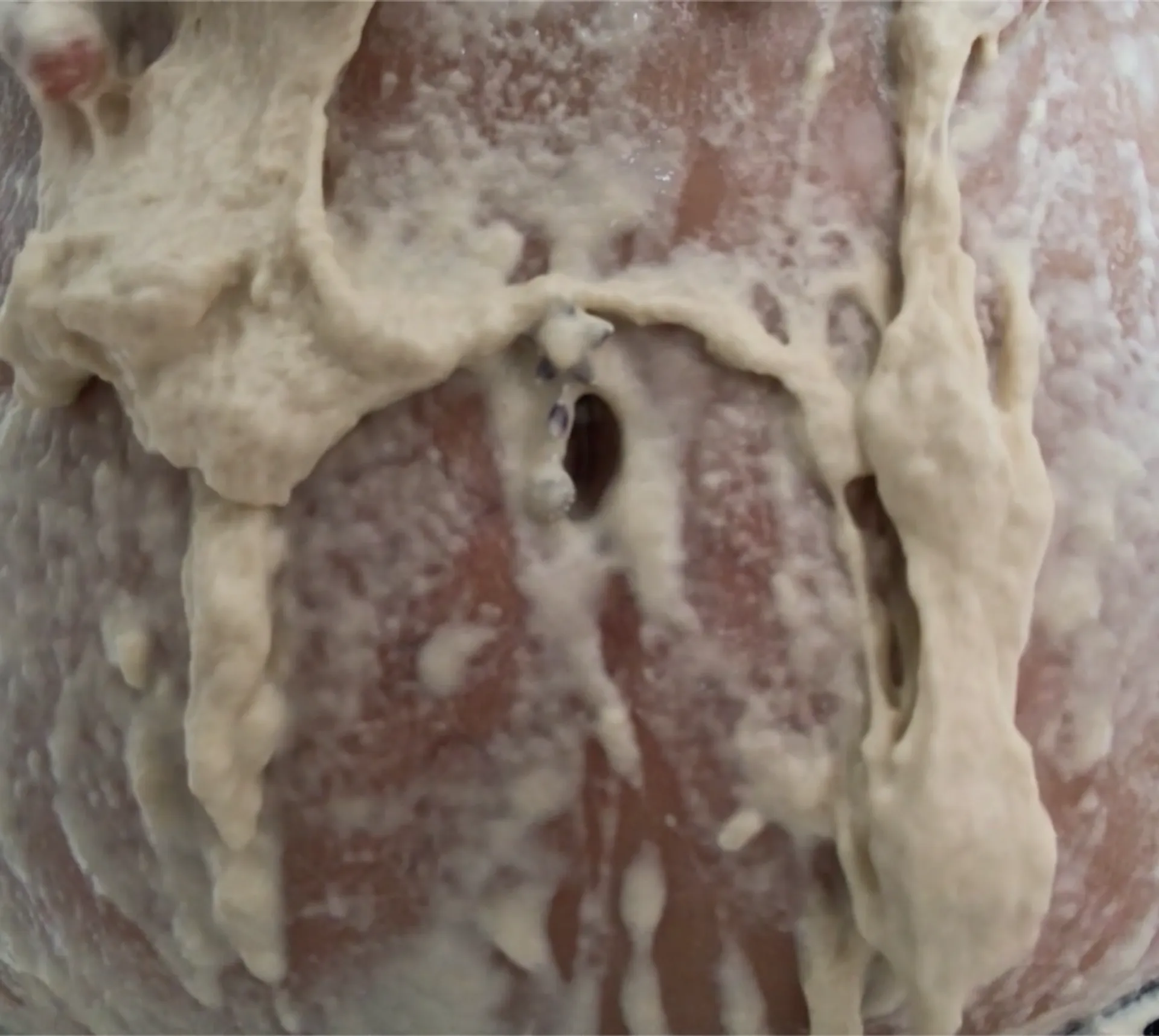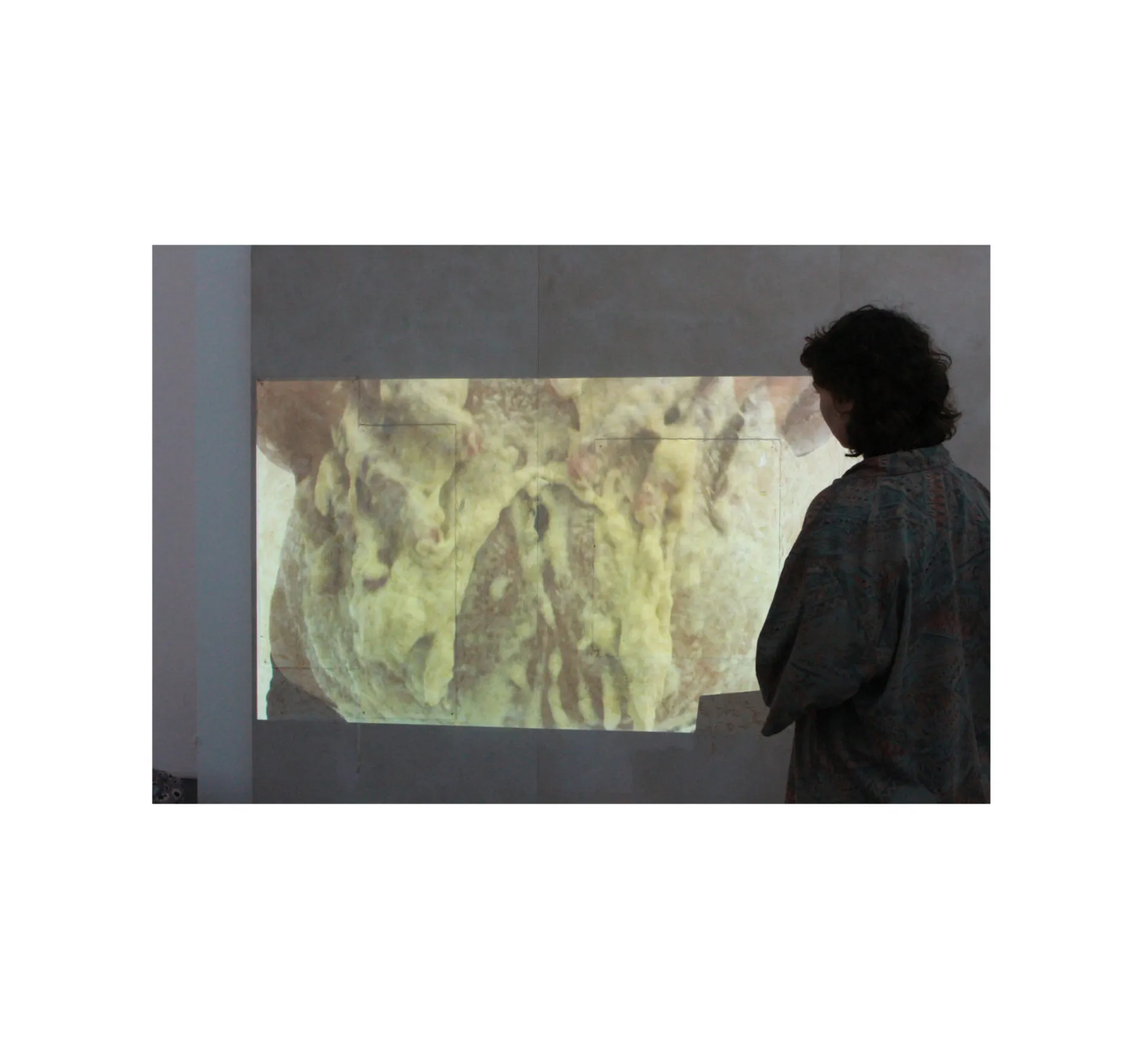 These images are video stills from my video installation exploring insecurities surrounding the squishiness of the female belly. I’ve presented this through using dough to create a gloopy looking surface to project onto, and through mixing dough on my own belly. I have been looking at this through my own experiences, and that of others with biologically female bodies in society. I want to display the more “gross” ways in which the female body can be presented, as a result of society picking it apart and never being satisfied with it. In this video I have used dough to create an off-putting feeling towards the belly, and show it in an explicitly gross manner, trying to evoke this feeling of being uncomfortable around the belly, which I amplified in the install by projecting it onto a wall painted with dough to create a lumpy texture.