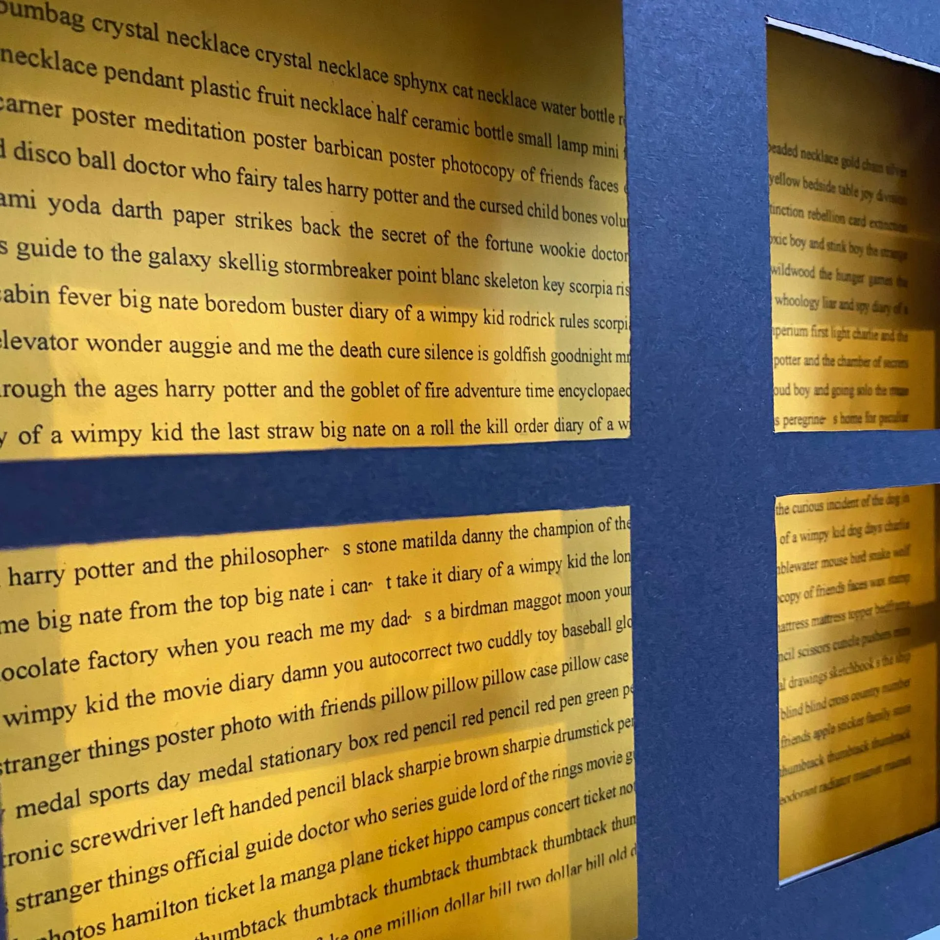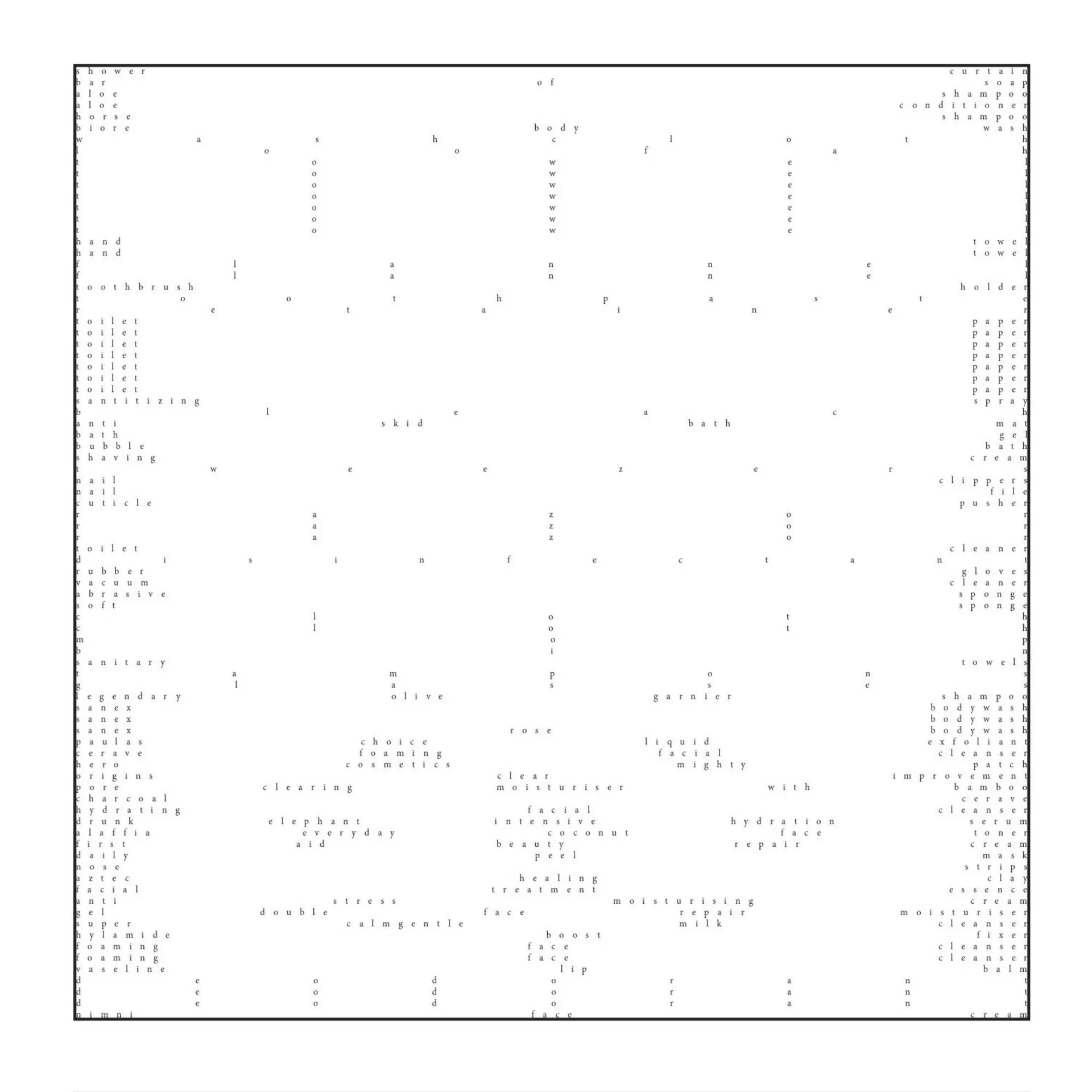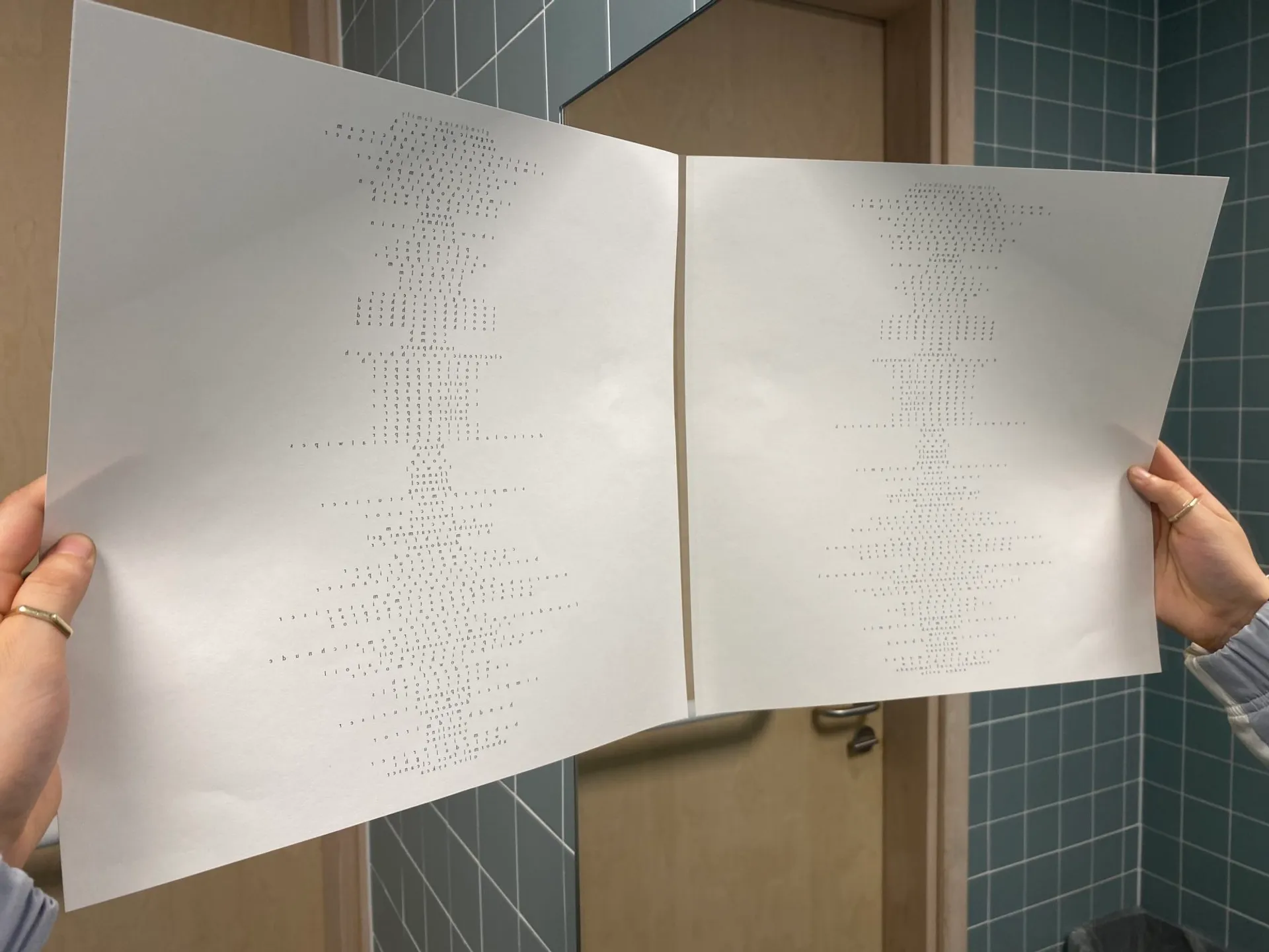 This project is focused on the idea that we all inherently have a desire to peek into others’ private spaces. Therefore, I have focused on arguably the most private space of the modern household – the bathroom. The outcome works as a series of items, each listing every single item in various bathrooms. The viewer is intended to interact with these items and feel a sense of intrusion through unravelling, holding up, and peering into the three outcomes. Through reading and discovering how other people fill and decorate their homes, the viewer can make assumptions and gather ideas on the characters of these certain individuals, even though they are not explicitly present in the space – as well as commenting on the idea of aspirational living through being influenced by how others decide to decorate their living spaces.