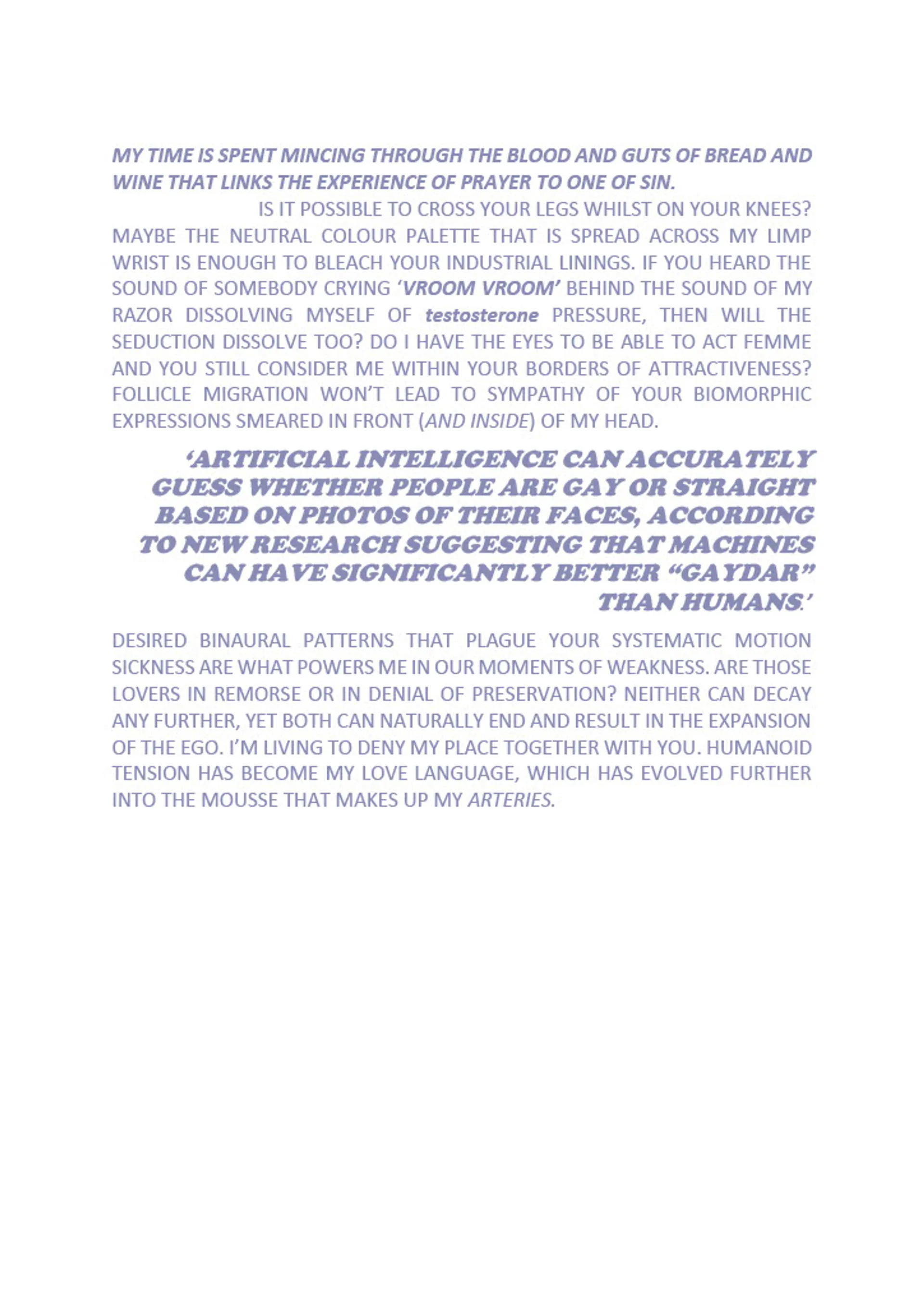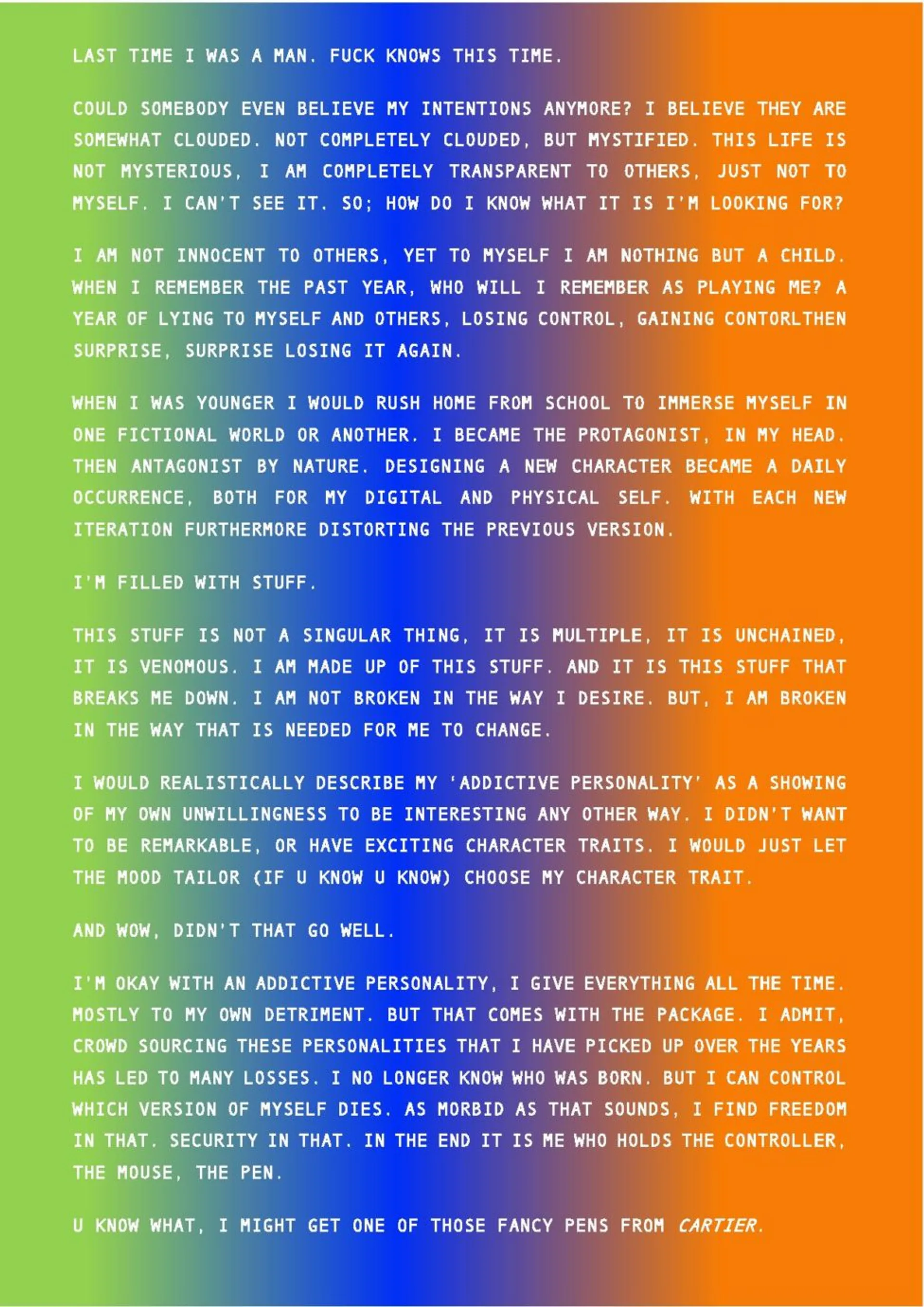Joseph Thomas (b. 2000 Cardiff) is an artist and writer based between Cardiff and London. They are currently studying BA Fine Art at Kingston University working predominantly in writing, sound and instillation focusing on themes of queer futurity, gender and digital selfdom.