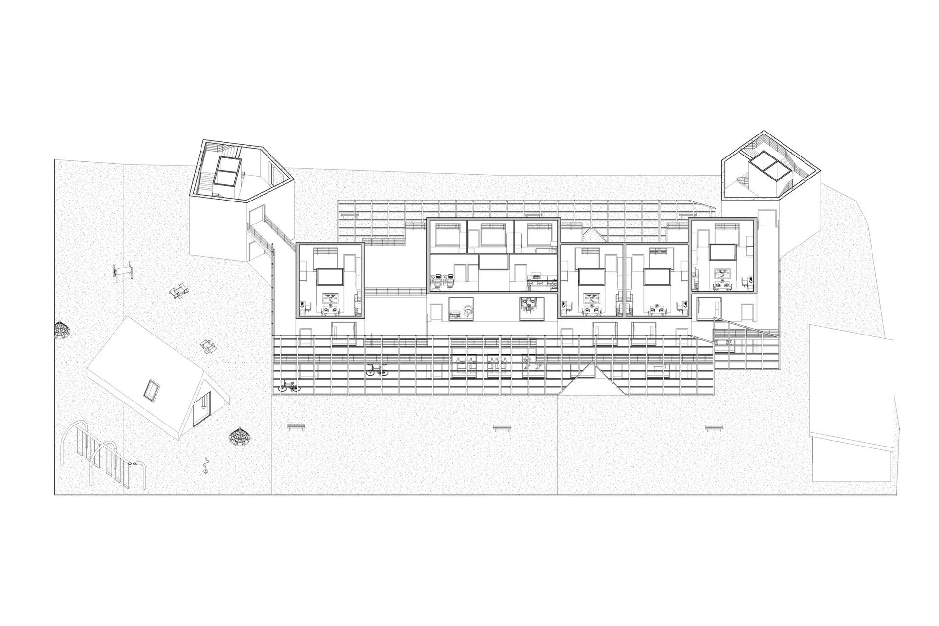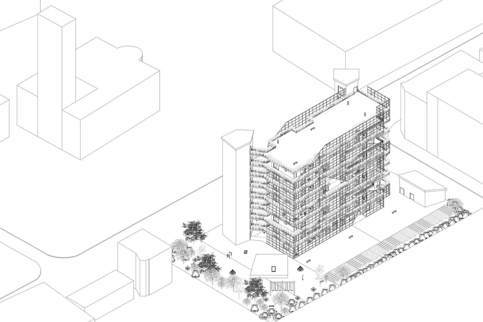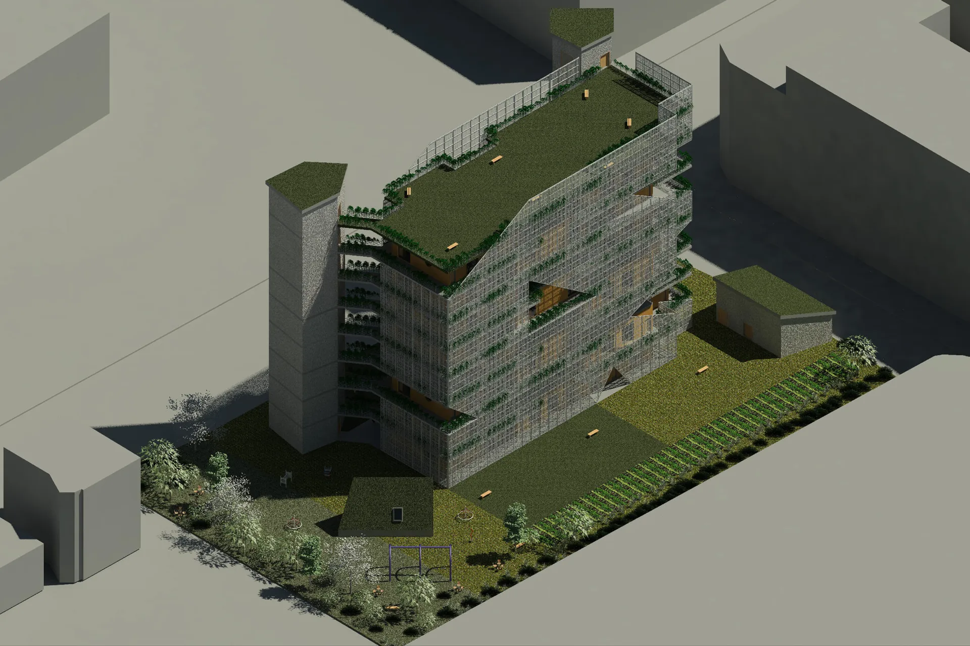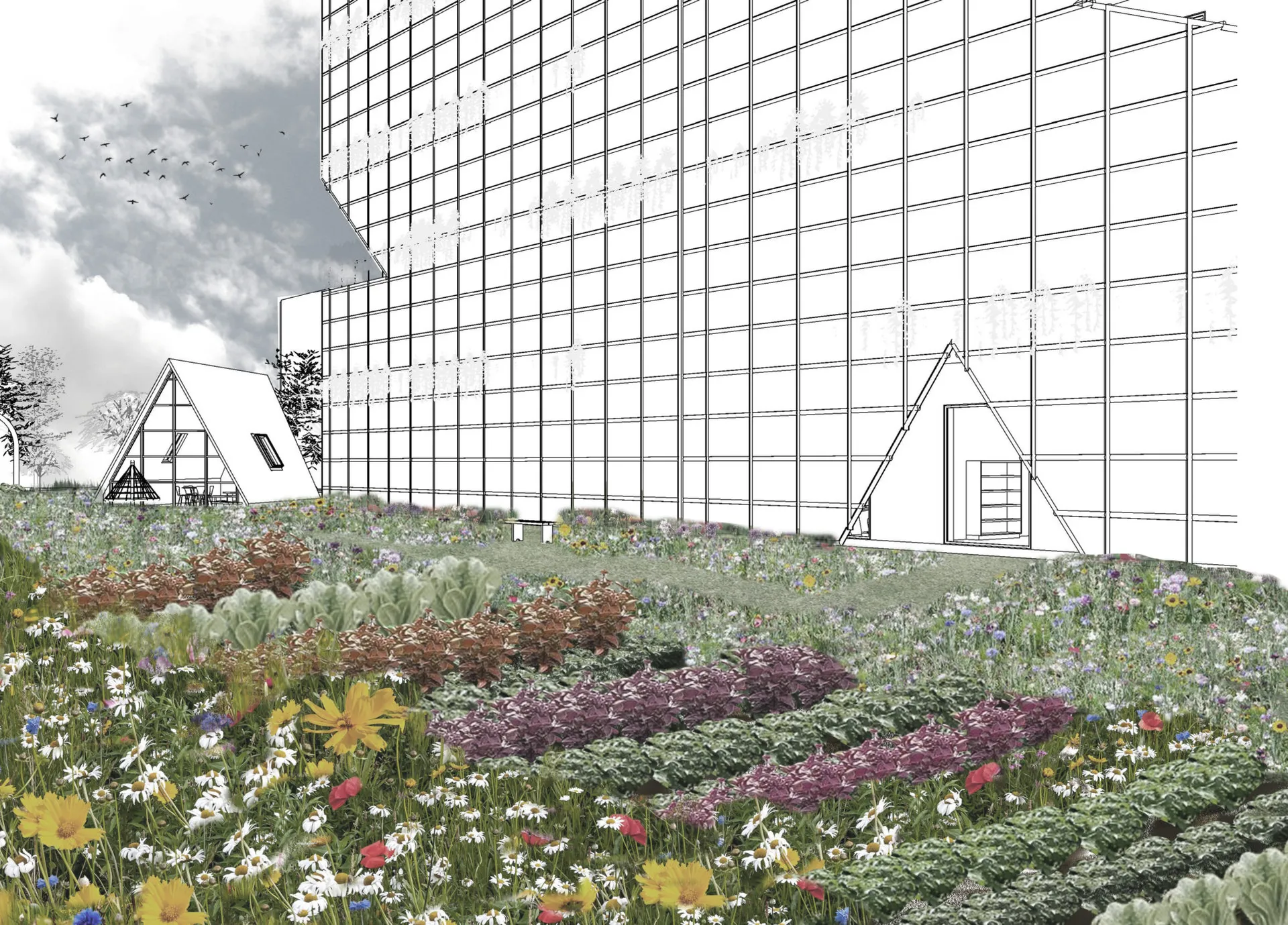 My research then focused on being in communion with nature, whereby human beings rely on and find pleasure in the natural world, living things and plants. There are green roofs, allotments, playground area, trees, garden spaces, planting regions for wildflowers and suchlike.