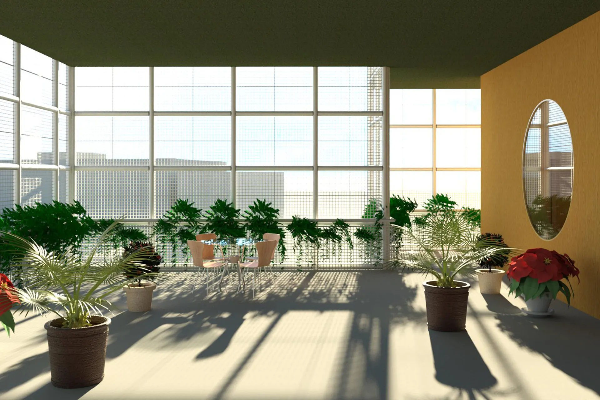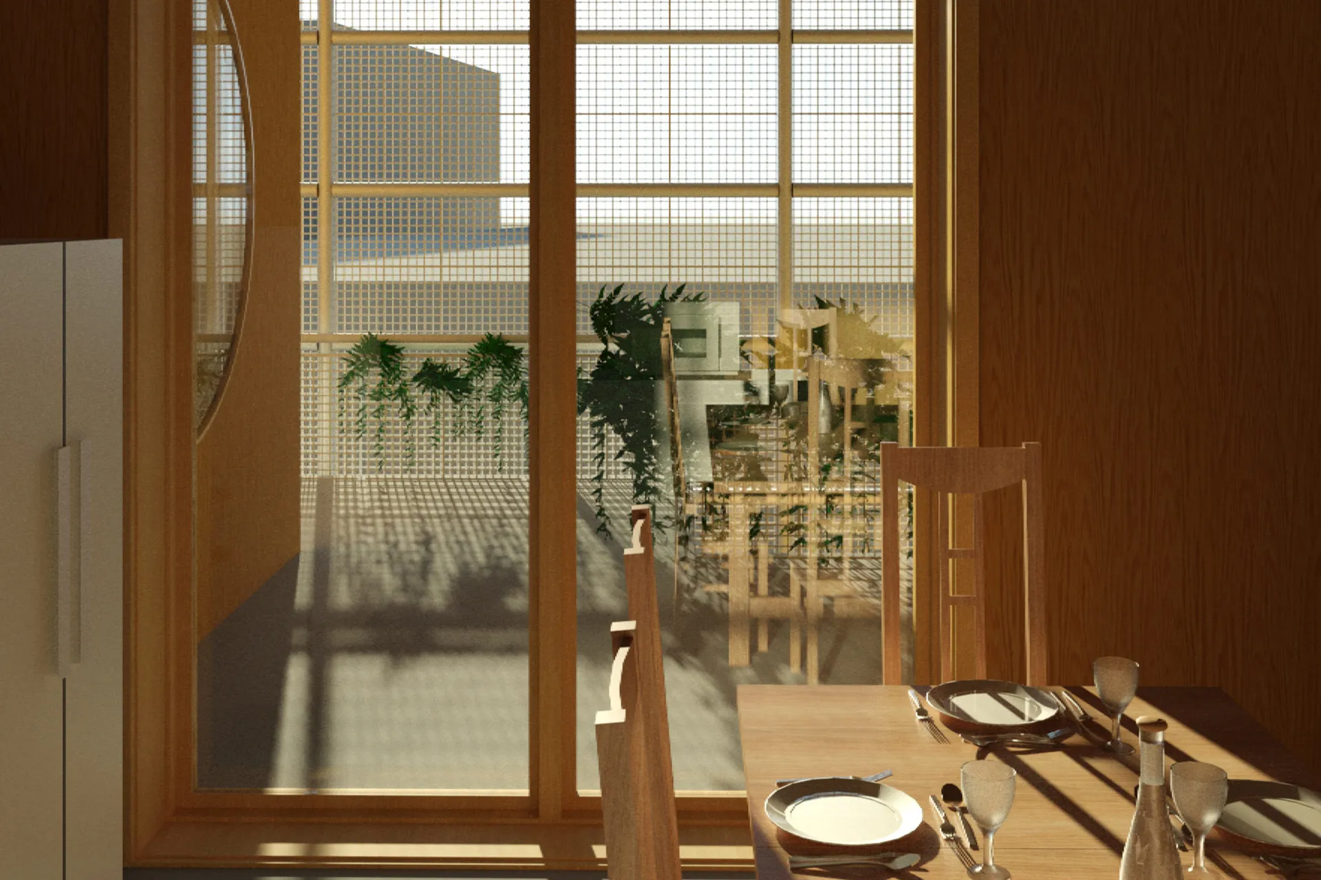 The low-lying winter sun illuminates the kitchen/ dining/ living area in the afternoon through the large window. Foliage animates the exterior balcony, railings, and live mesh façade. As this is housing for essential workers in Shadwell, this project reconnects key workers with nature through community, rest and wellbeing.