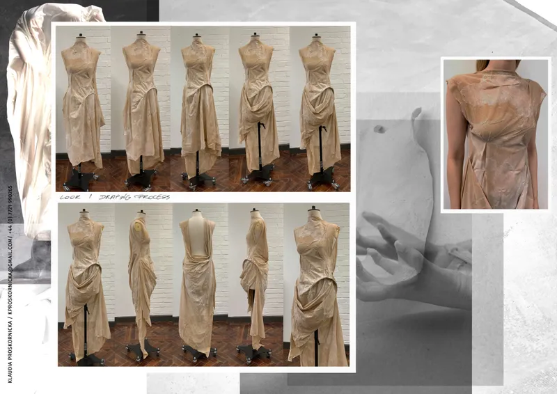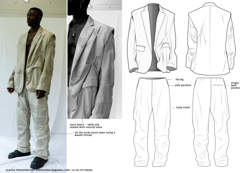 Another key reference was the work of Frederick Kiesler, ‘Endless House’, which he compared to a cocoon – ‘endless like the human body— there is no beginning and no end.’ By applying his approach to fashion design, I gained a new perspective on constructing the silhouette of my pieces. The shapes were influenced by art, architecture, furniture, and movement and altered to fit the constructs of clothing.