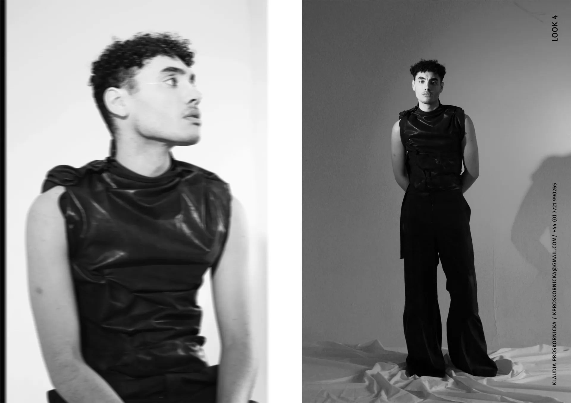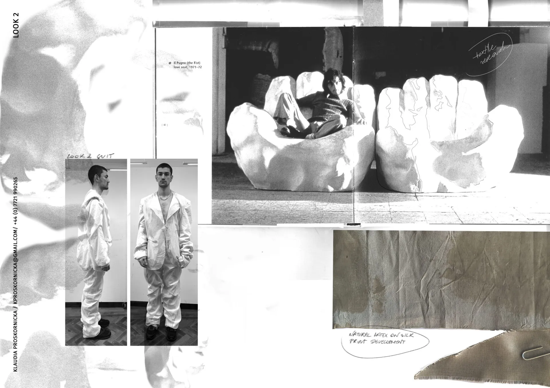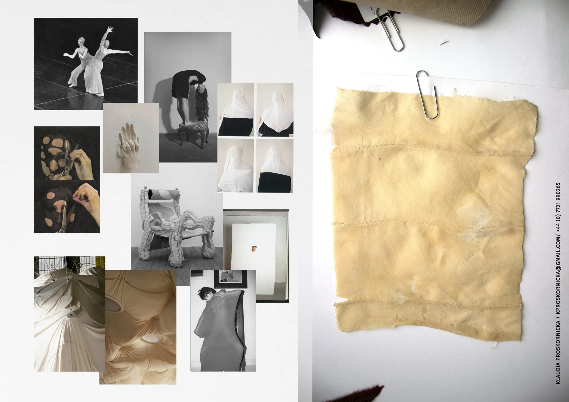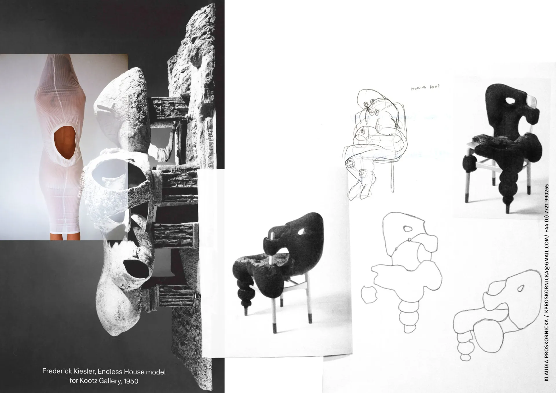 Another key reference was the work of Frederick Kiesler, ‘Endless House’, which he compared to a cocoon – ‘endless like the human body— there is no beginning and no end.’ By applying his approach to fashion design, I gained a new perspective on constructing the silhouette of my pieces. The shapes were influenced by art, architecture, furniture, and movement and altered to fit the constructs of clothing.