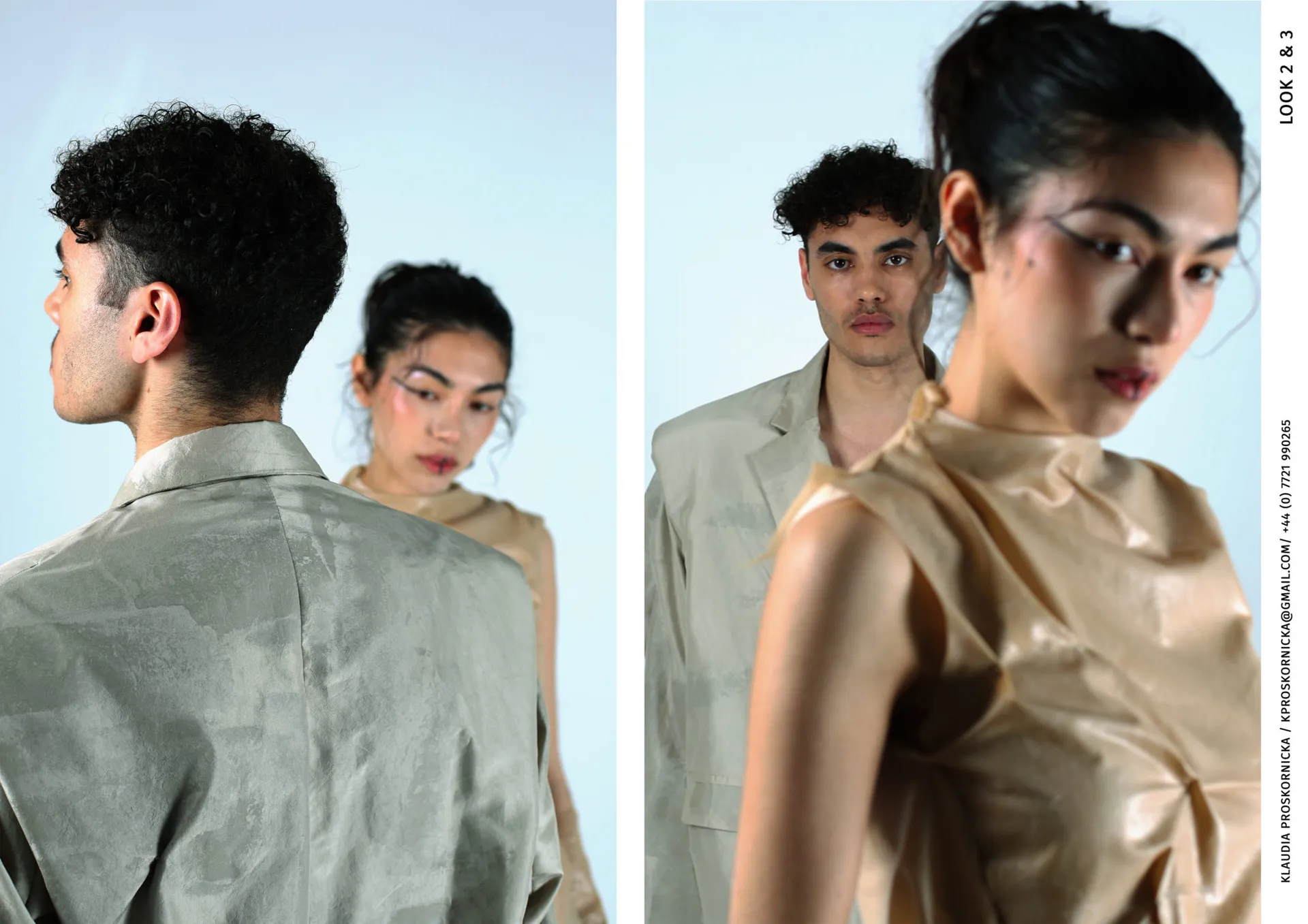 With this, I also developed textiles which reevaluate the idea of biodegradability and add meaning to the otherwise discarded materials. Using natural liquid latex; I tried smudging the lines between sculpture, art, and design. In my work, I aim to obtain an artisanal approach toward materials. With the limitations of the newly developed textiles, I designed the shapes that create a tension between the skin and the garments.
