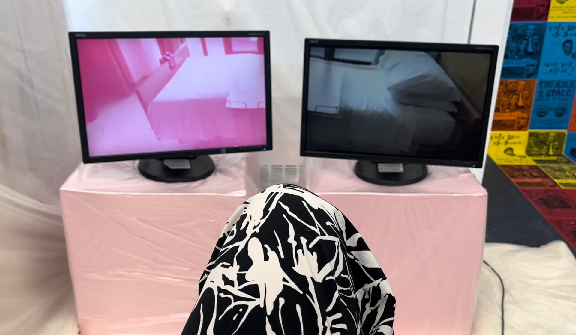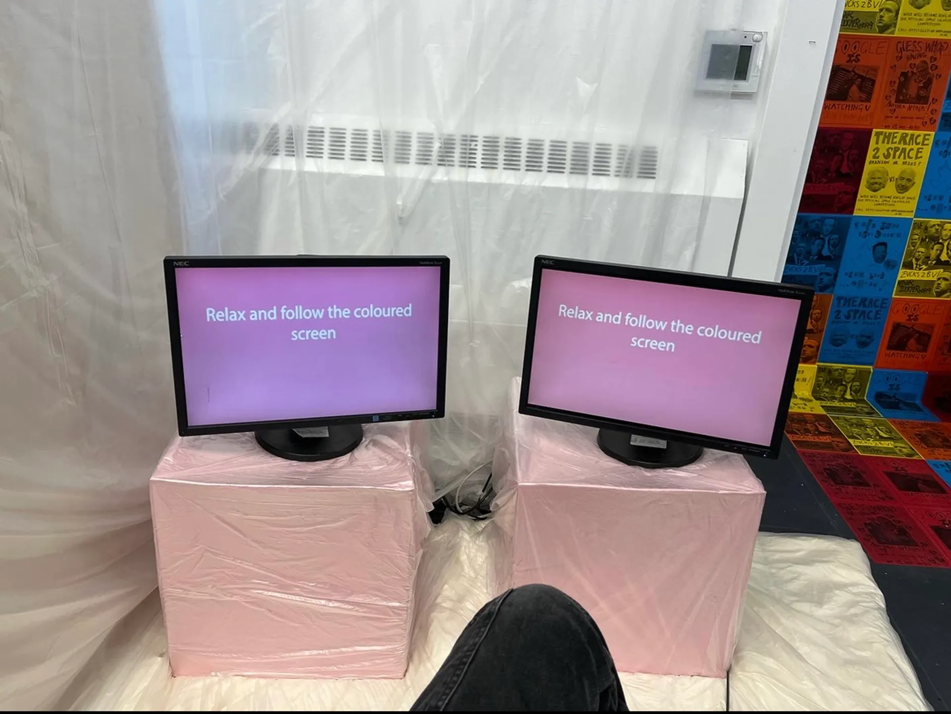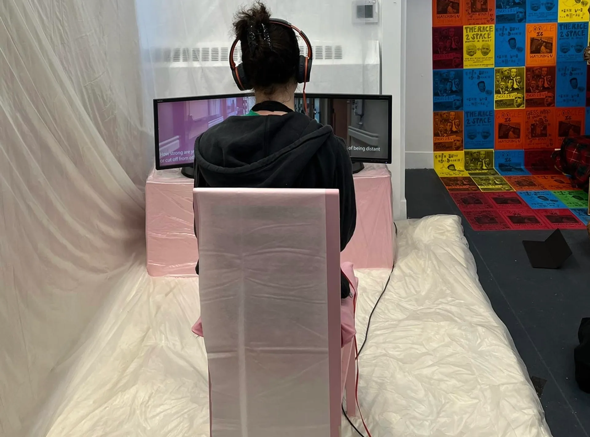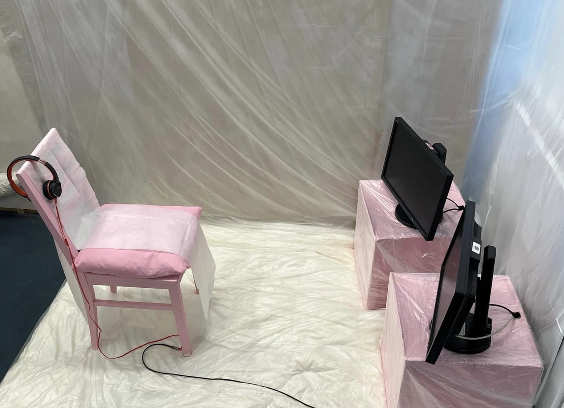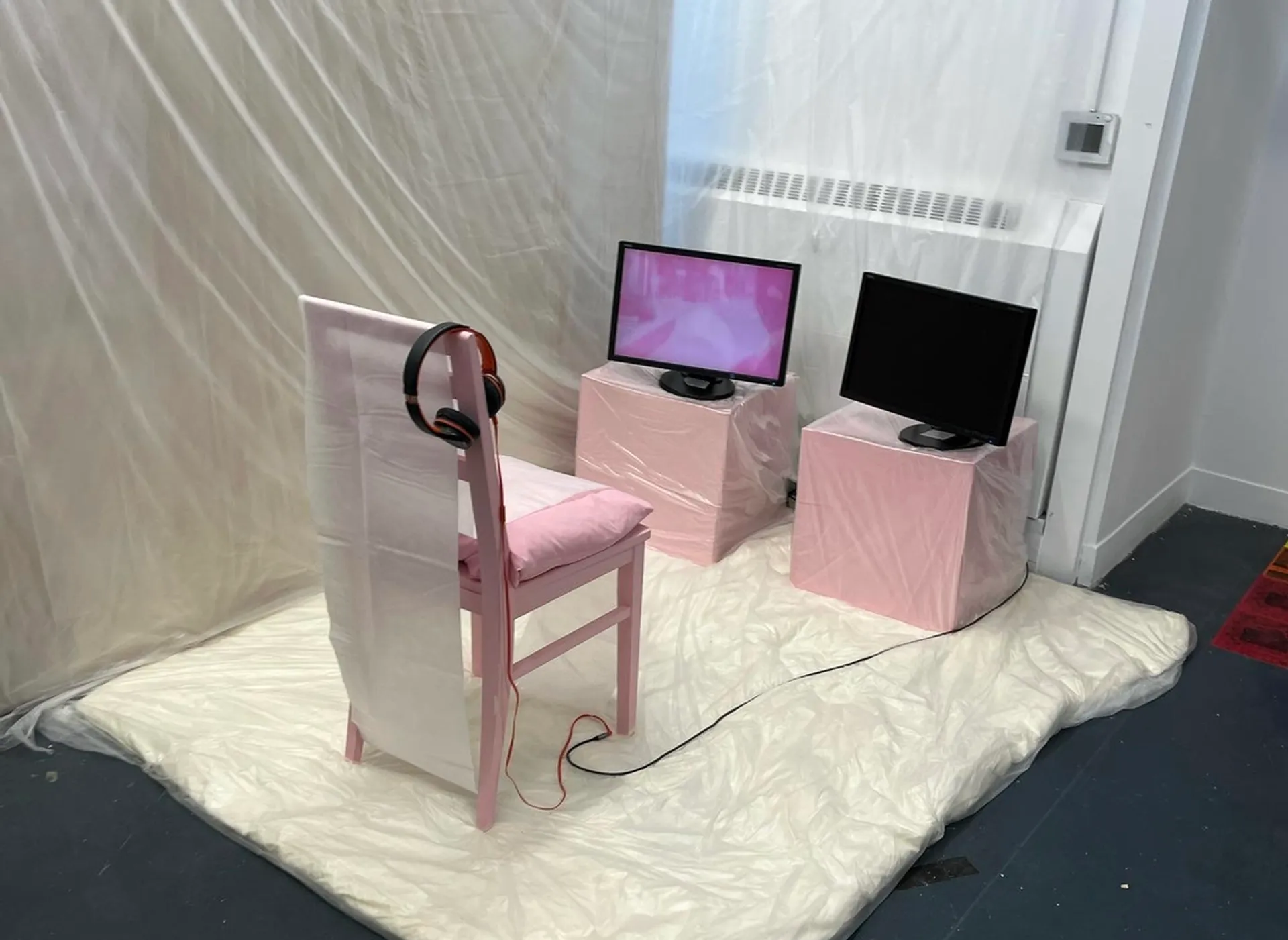 This piece is inspired by my personal experience of having PTSD. The sound which accompanies the video reads out the CAPS-5 assessment (the diagnostic criteria for PTSD) whilst found audio fades in and out. The viewer listens to this audio in headphones whilst sitting in the chair facing two monitors displaying video and text on alternating screens, replicating the rapid eye movement in EMDR, a treatment for PTSD. In this piece, I wanted to fully immerse the viewer in how it feels to suffer from PTSD, and the feeling of being stuck in the past whilst living in the present.