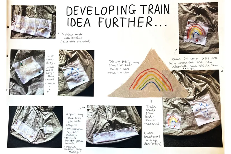 For my final piece I have created a costume for the character of Ma from the book ‘Room’ by Emma Donoghue. My project explores distorted realities and how one is able claim back their freedom through wearing accessible materials in a new way. I wanted my outcome to be as authentic as possible, therefore I created it from items that would have been accessible to both her and her son whilst they were trapped e.g. Fitted bedsheets, socks, an old t-shirt and shirt. The process of transforming her clothes allows the character of Ma to have a new identity. It allows her to pass the time, gives her a sense of escapism and time to get out of her head. My piece explores power in relation to other themes such as escapism, distorted reality, empowerment, confinement, and freedom.