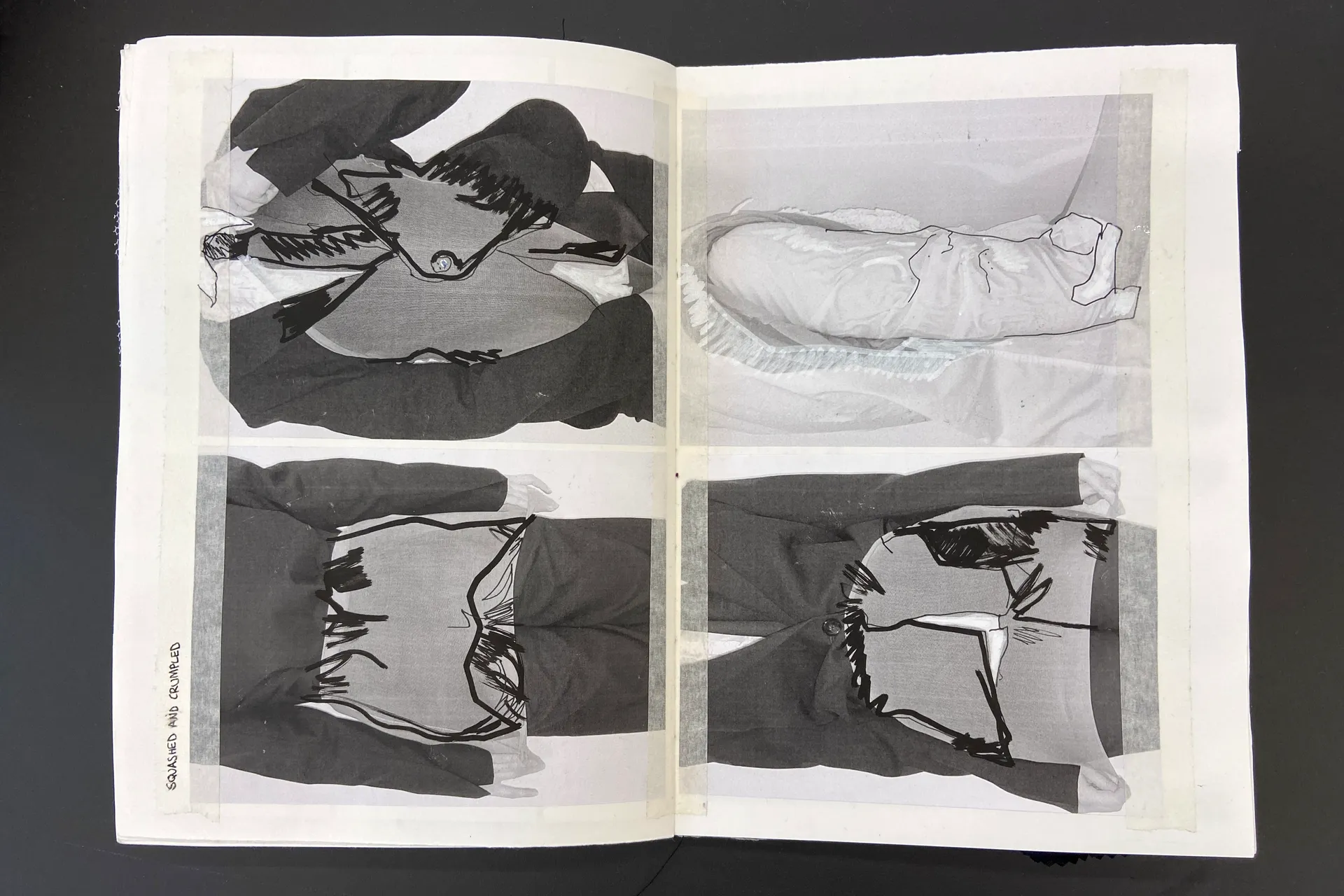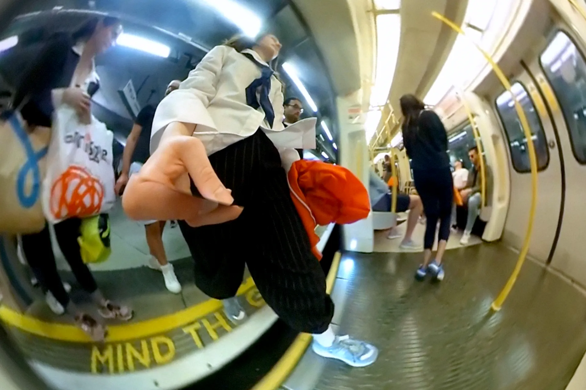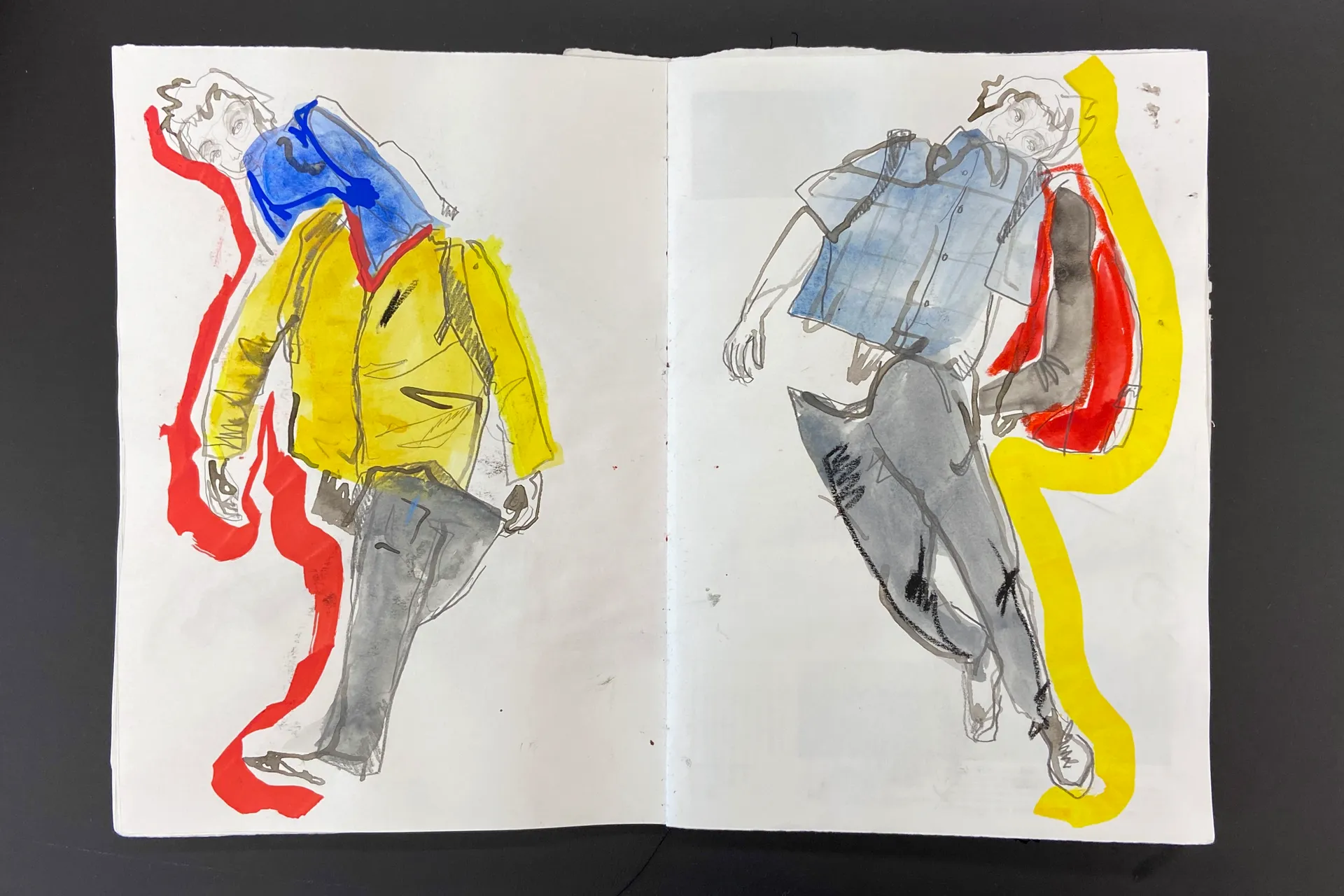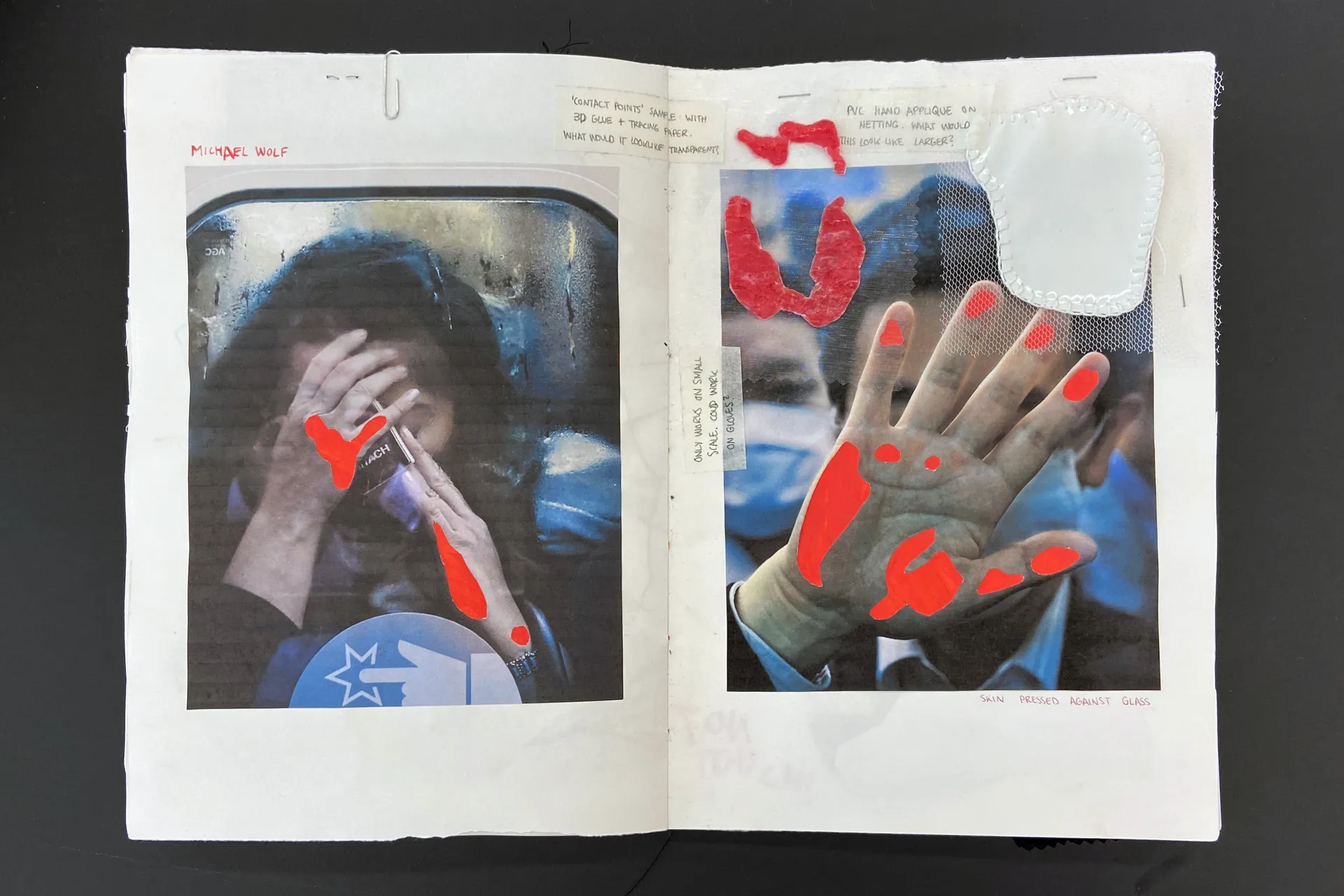 From people-watching at Waterloo Station, I became interested in how people change their clothes for commuting. For example, rolling up sleeves for high temperatures on the tube, or combining sportswear with work wear for greater comfort. These adaptations begin to tell the story of a commute, giving clues about where people have been, or where they’re headed. This line of thought brought me back to Wolf’s work, where I looked further into the ‘contact points’ of people pressed against train windows during rush hour.