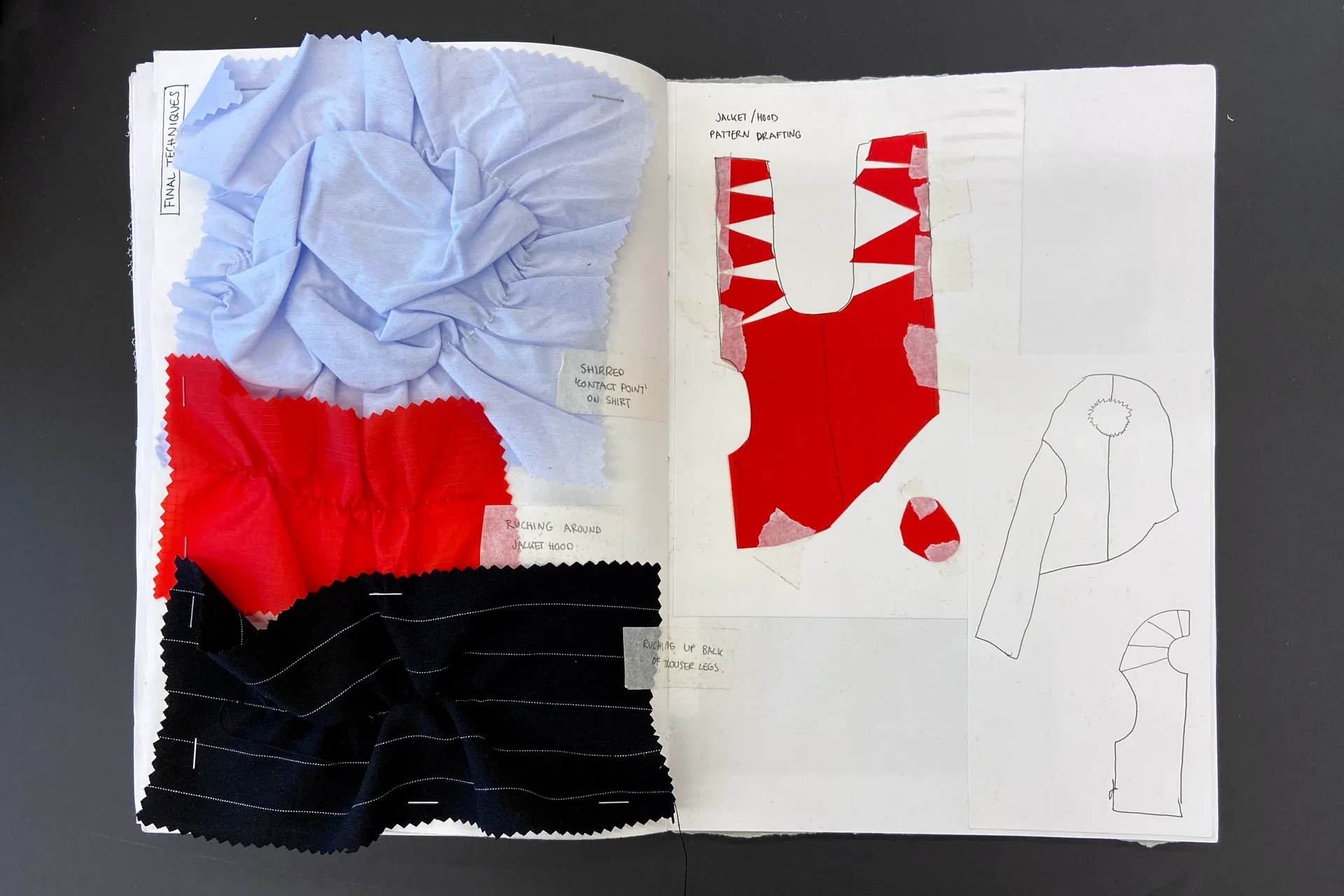 My later drapes looked at this idea of clothes being scrunched up under your arm or excessively layered to walk to and from trains, and I used these to inform silhouette and textile. The main textile in my final piece was the scrunched effect, which I arrived at by combining machine shirring with shapes from my ‘contact points’ research.