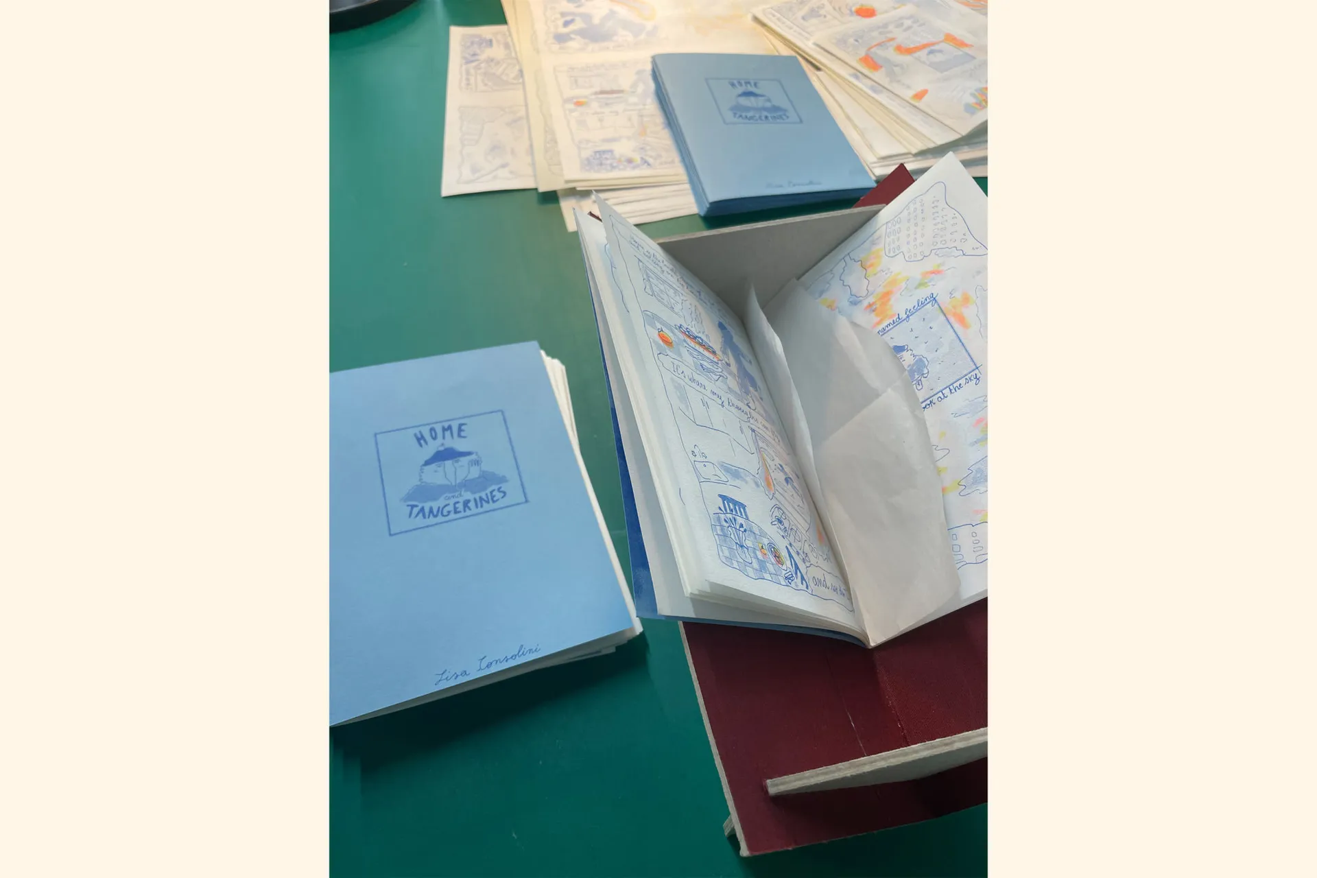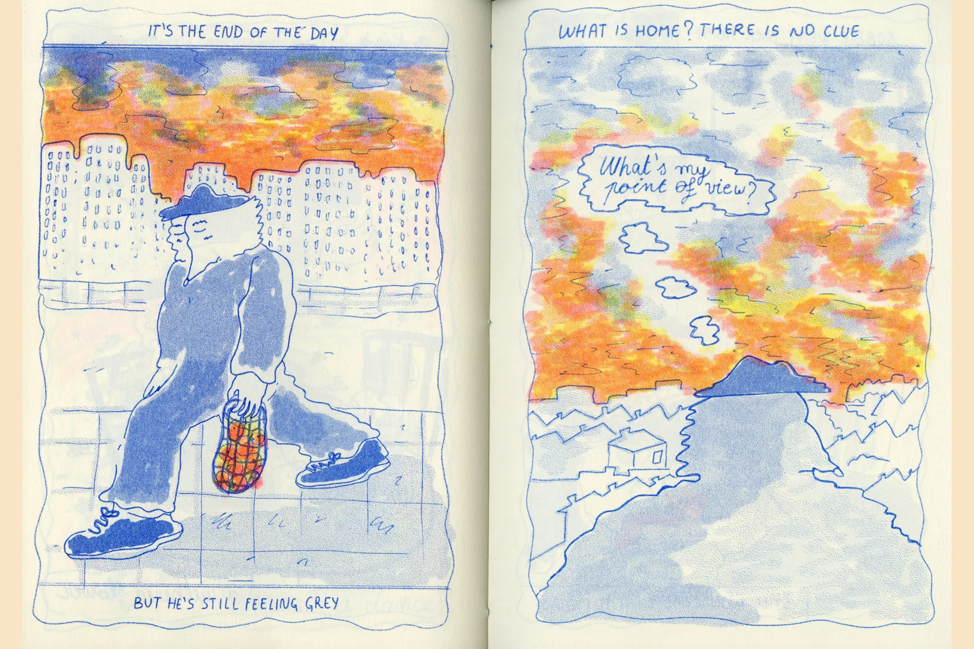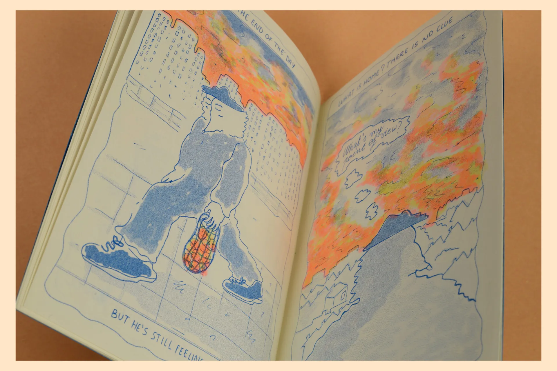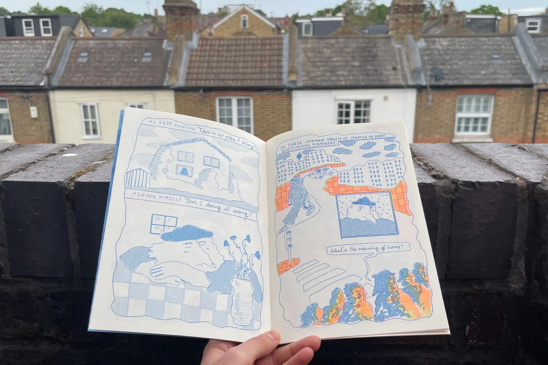 “Home and Tangerines” is an illustrated story in rhyme printed in Risograph that responds to a self initiated brief realized as major project of the course. The story tries to respond to the question “What’s the meaning of home?” through the thoughts of Robbie, a character with an unusual aspect that feels a bit sad because he struggles to give a sense to the word “home”.